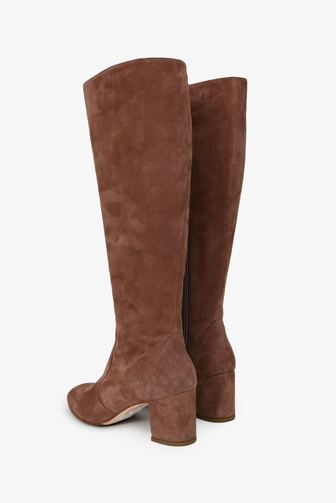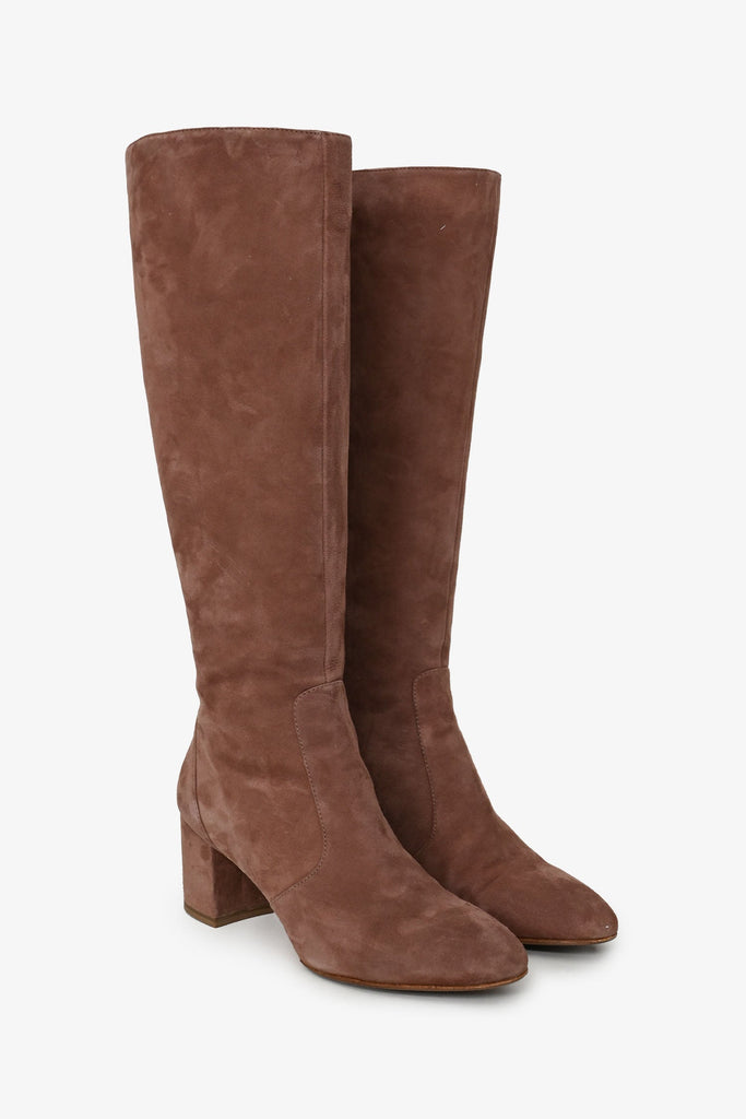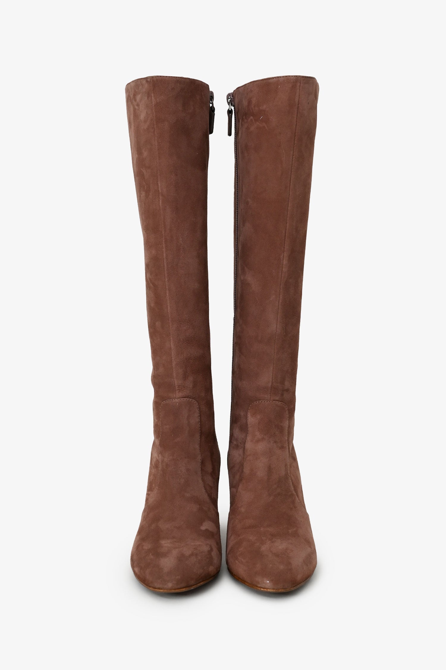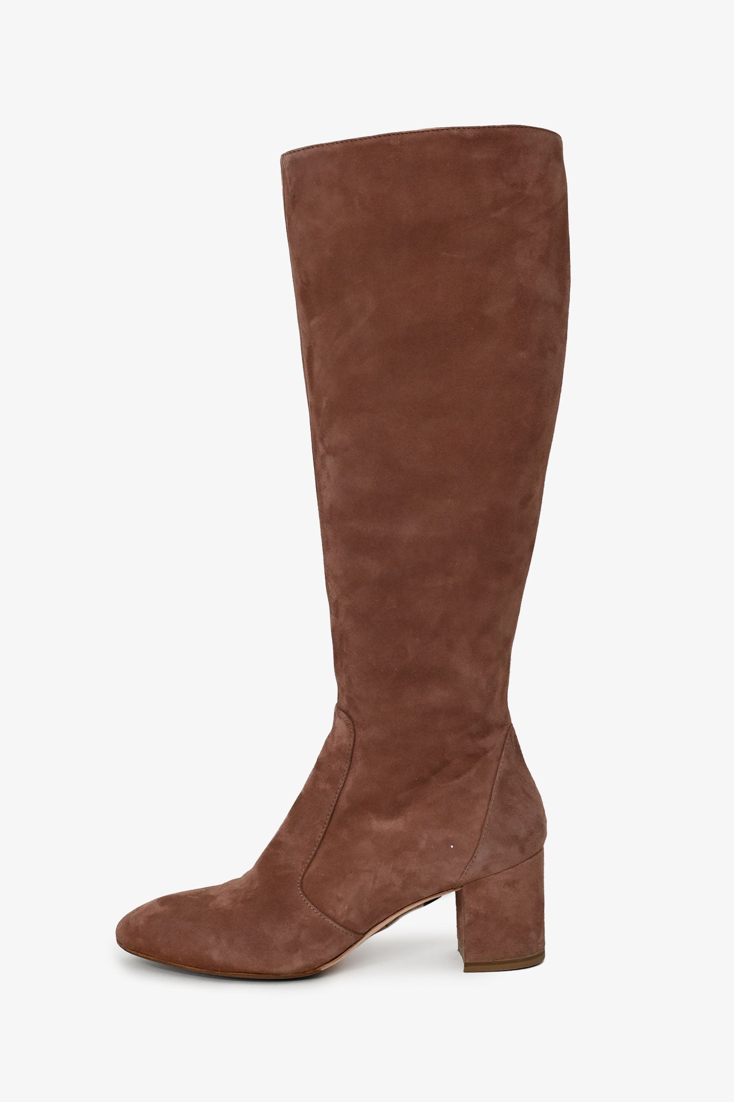 Stuart Weitzman Brown Suede Knee High Block Heel Boots. Pull-on. Side zip closure. Tonal stitching.