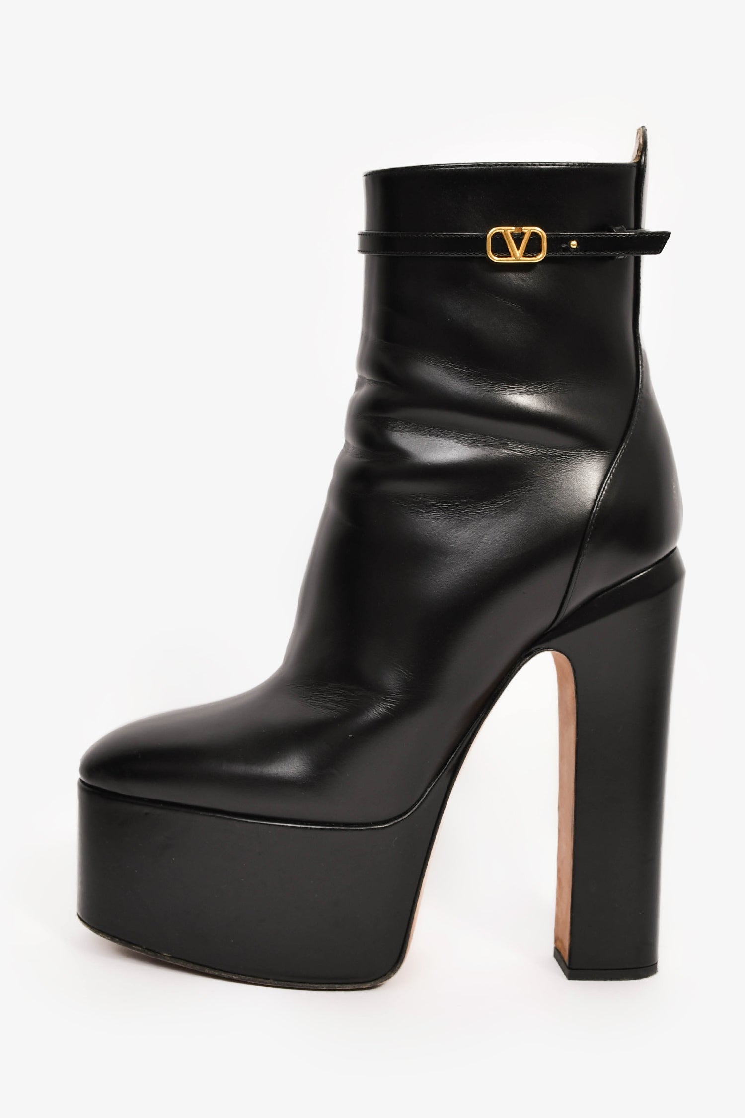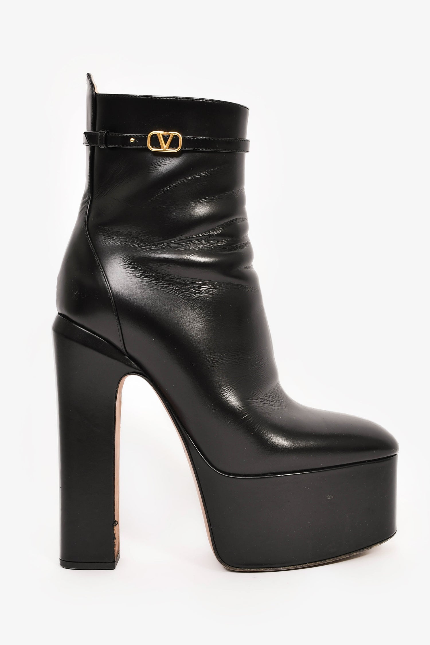Valentino Black Leather 'V' Platform Heeled Boots. Pull-on. Round toe. Side zip closure. Gold-tone hardware. Tonal stitching.