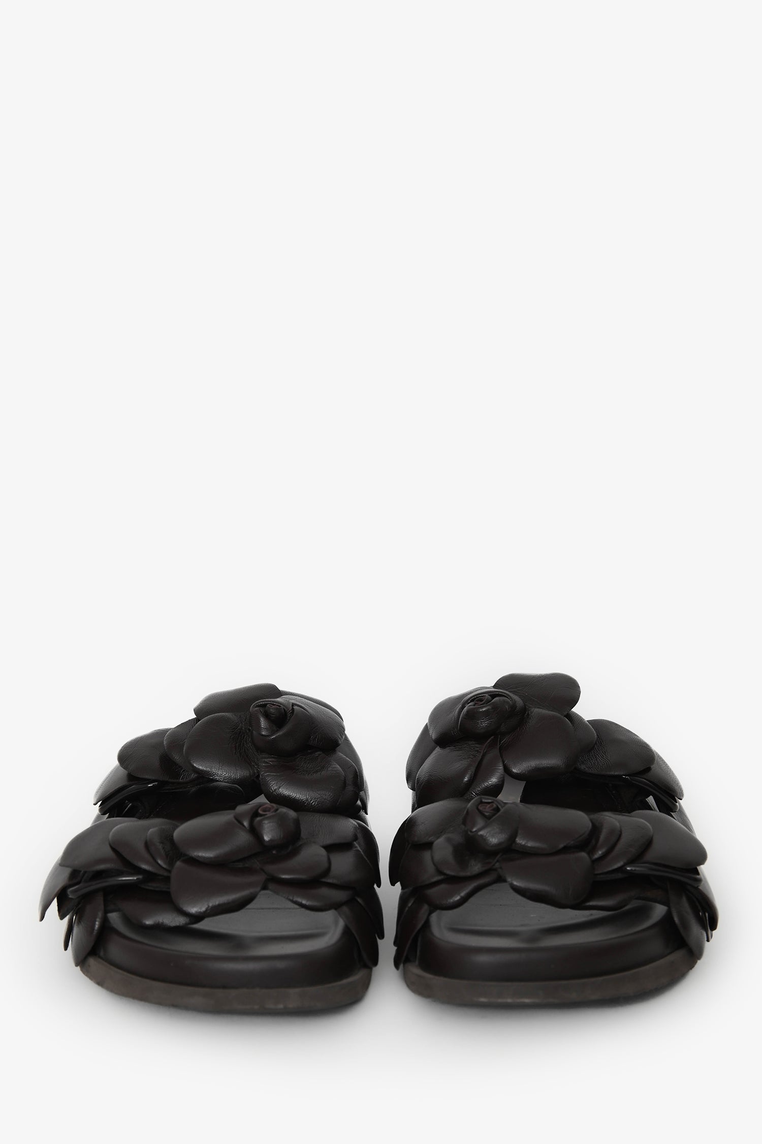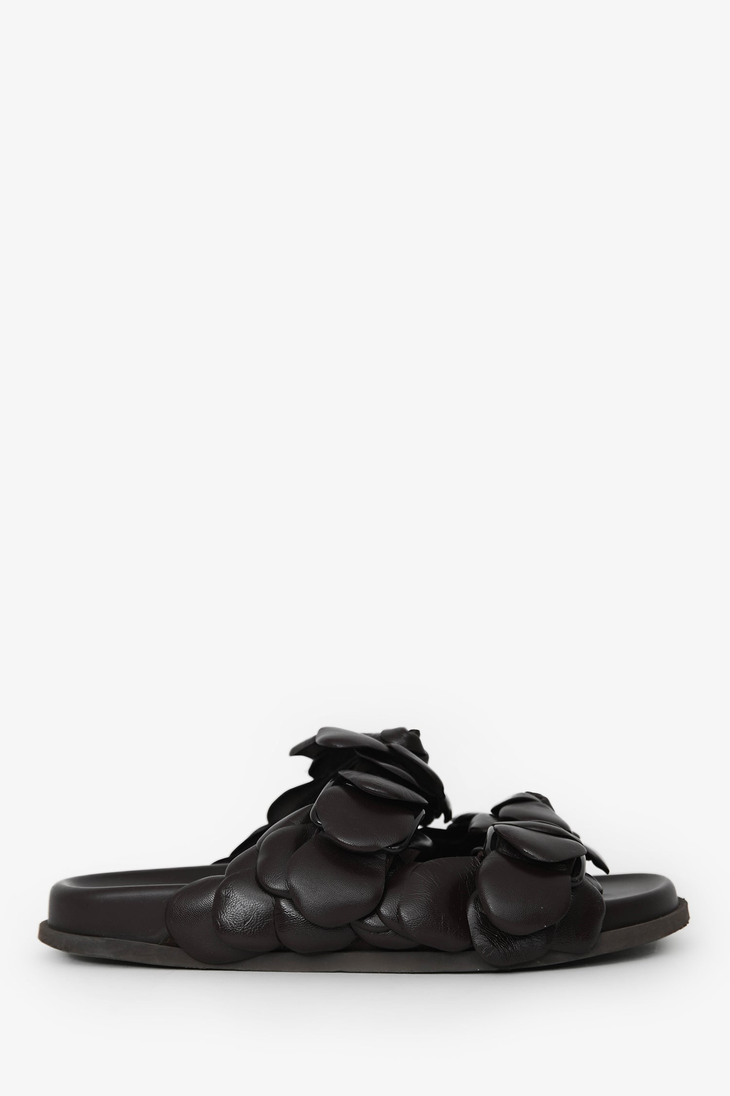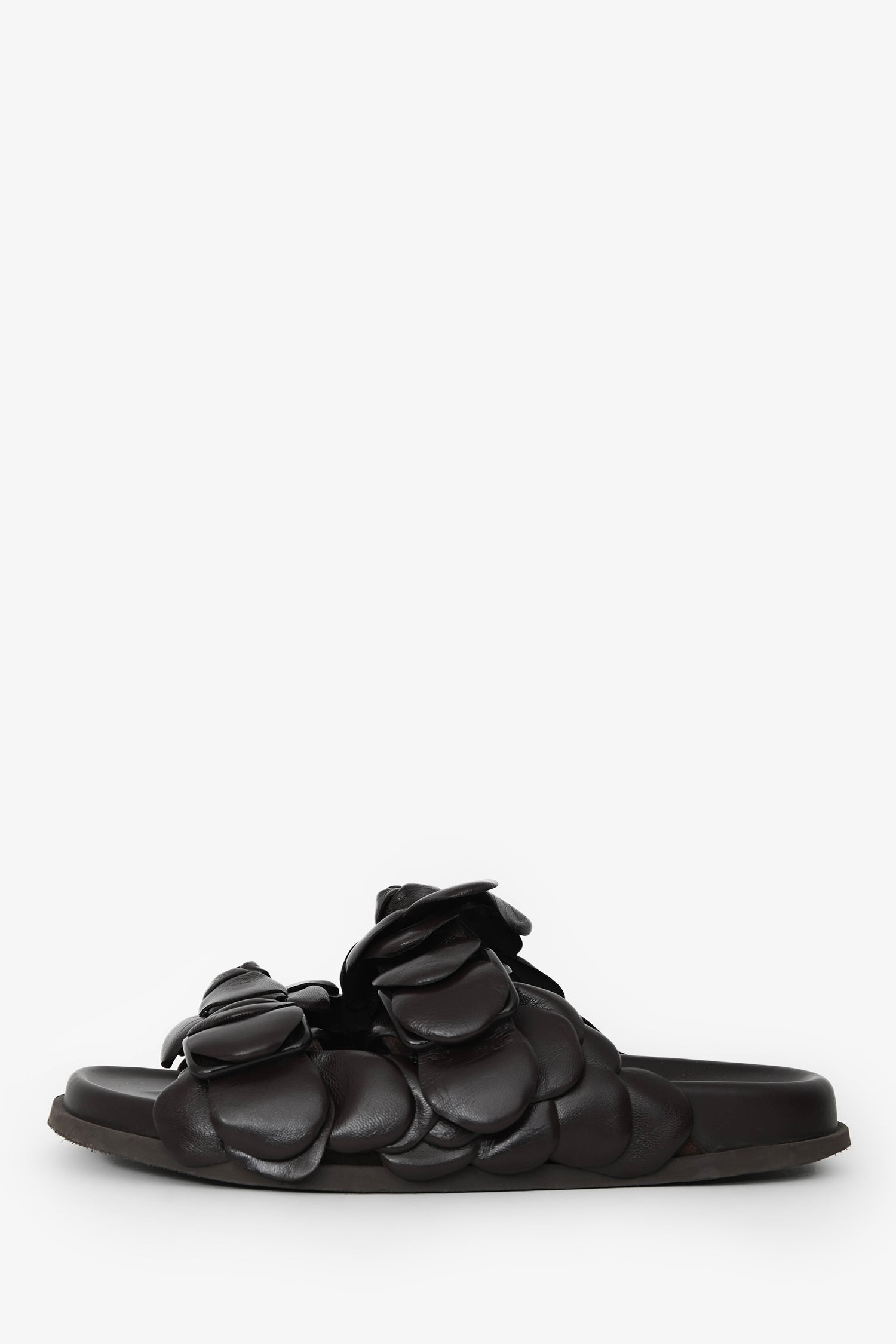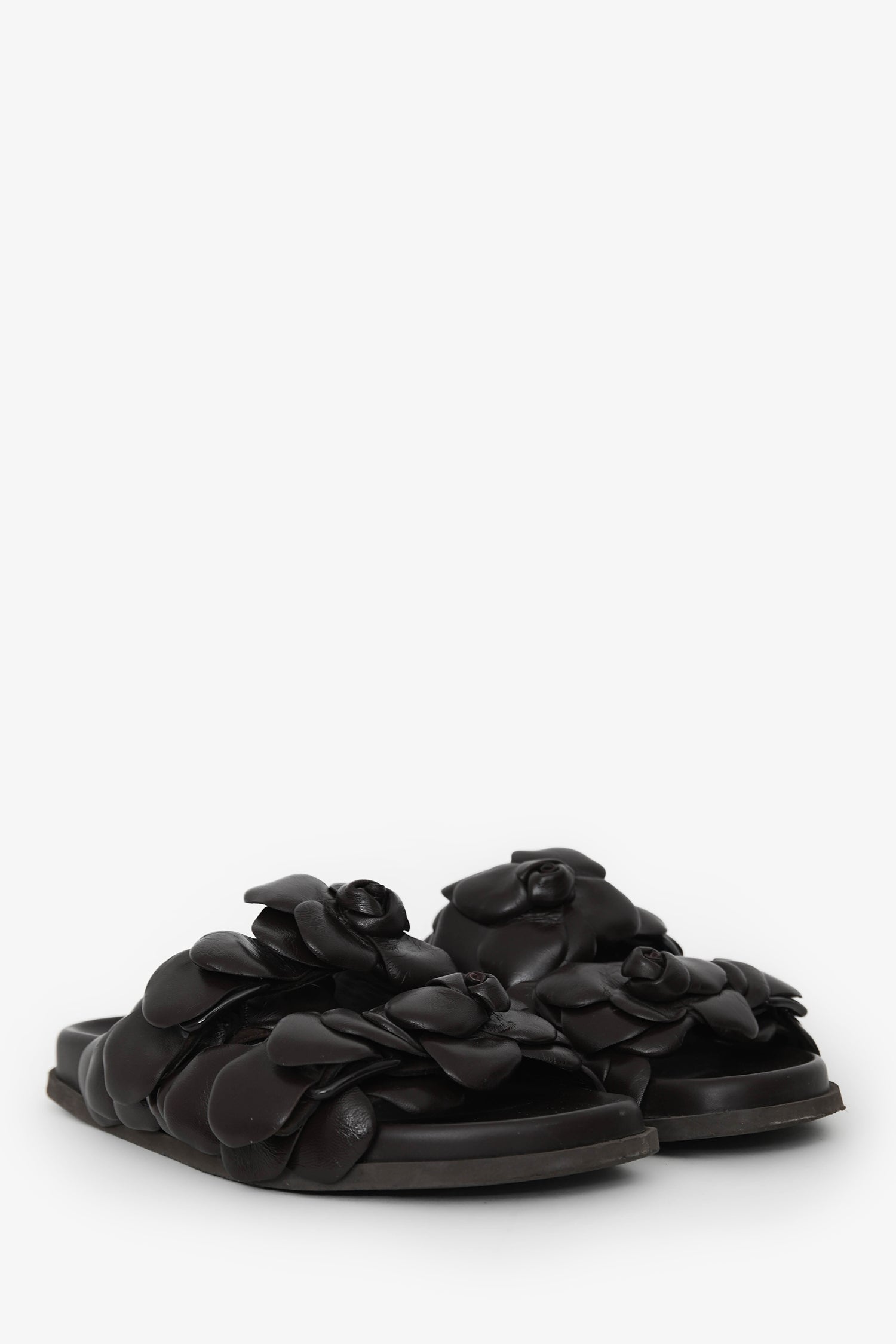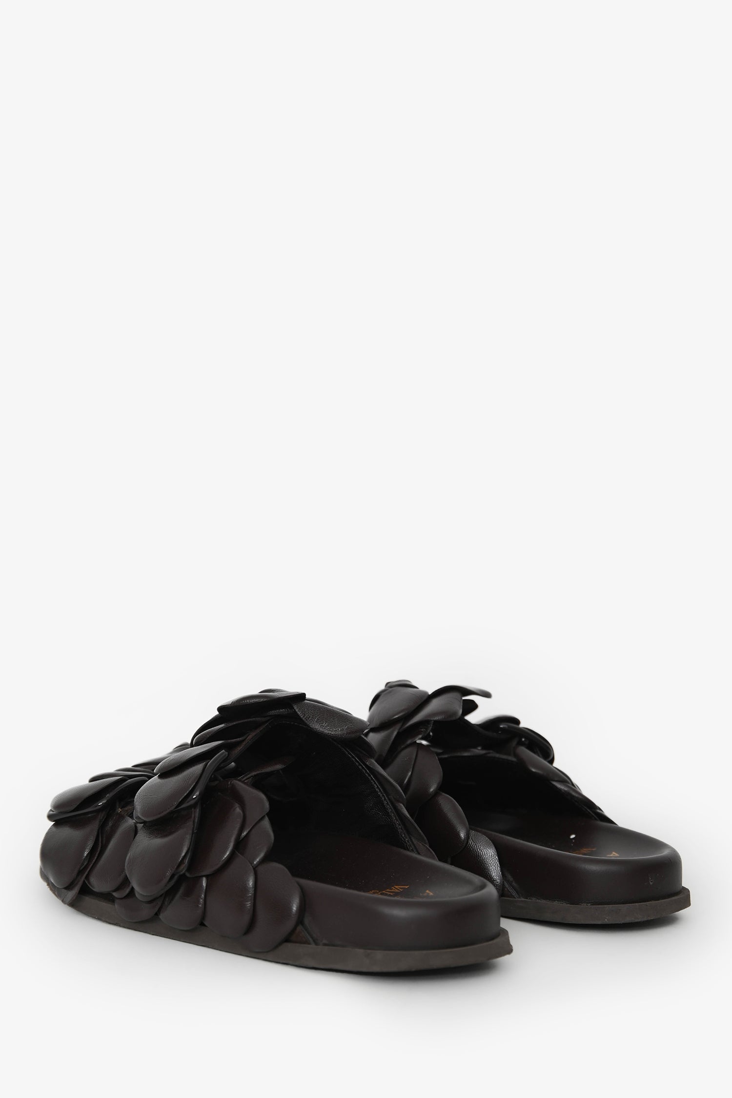 Valentino Brown Leather Rosette Sandals. Slip-on. Leather rosettes. Stacked soles. Tonal stitching.