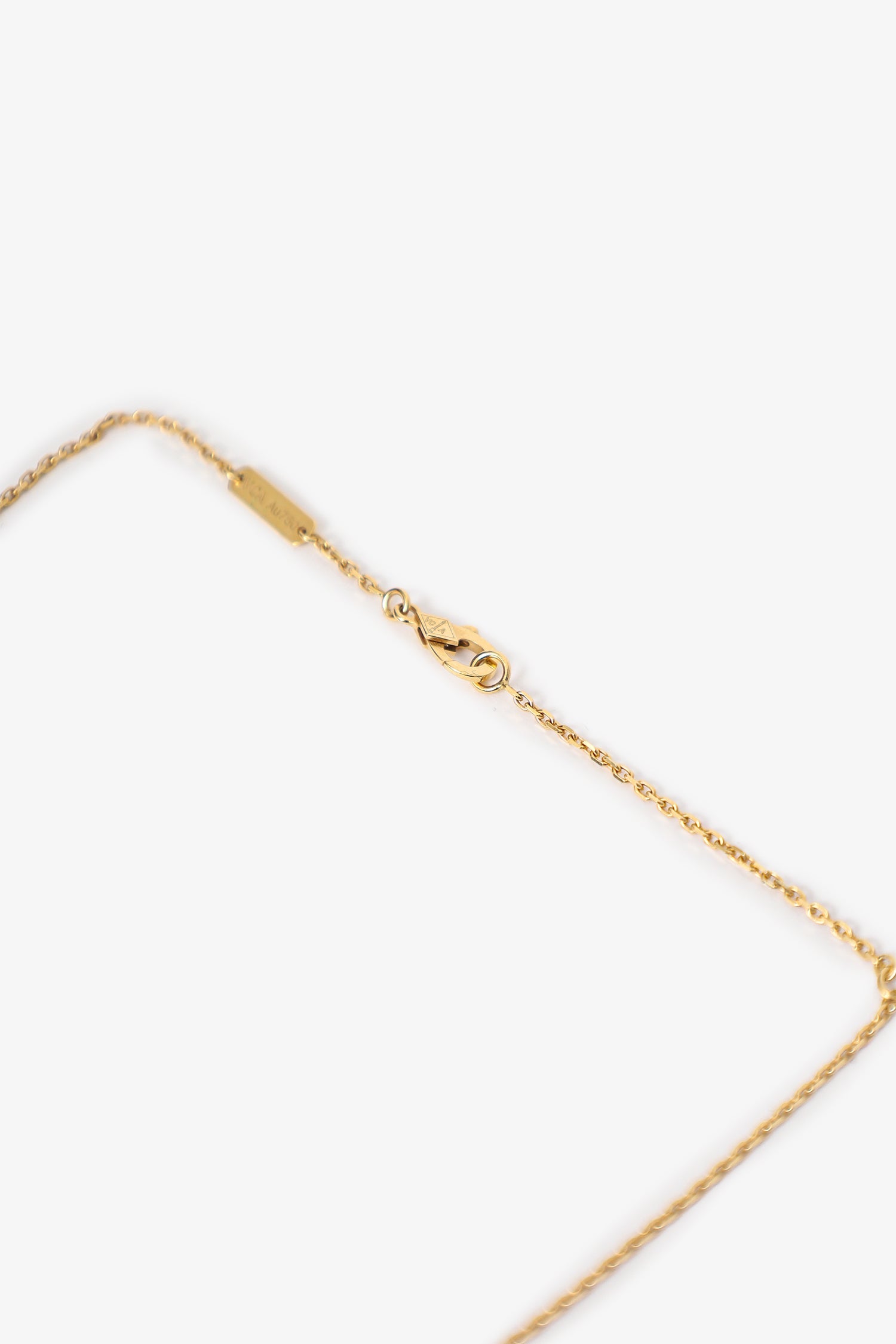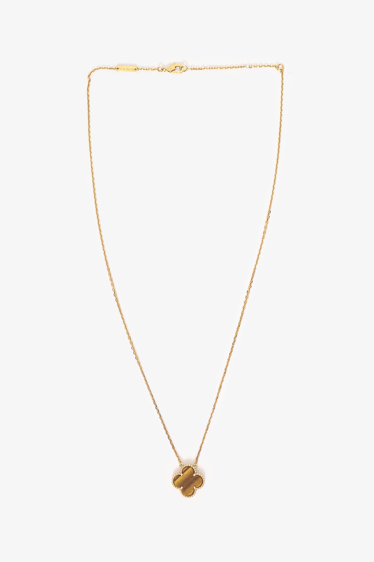 Van Cleef & Arpels 18K Yellow Gold Tiger Eye Vintage Alhambra Pendant Necklace. One ladies machine made polished 18K yellow gold modern-style square cable link chain. Stamped "JC558419" and "750". The"VCA" trademark (or hallmark) can also be found on the item. Attached with one ladies designer made polished 18K yellow gold floral motif, tiger's eye quartz modern-style pendants. Gold-tone hardware.