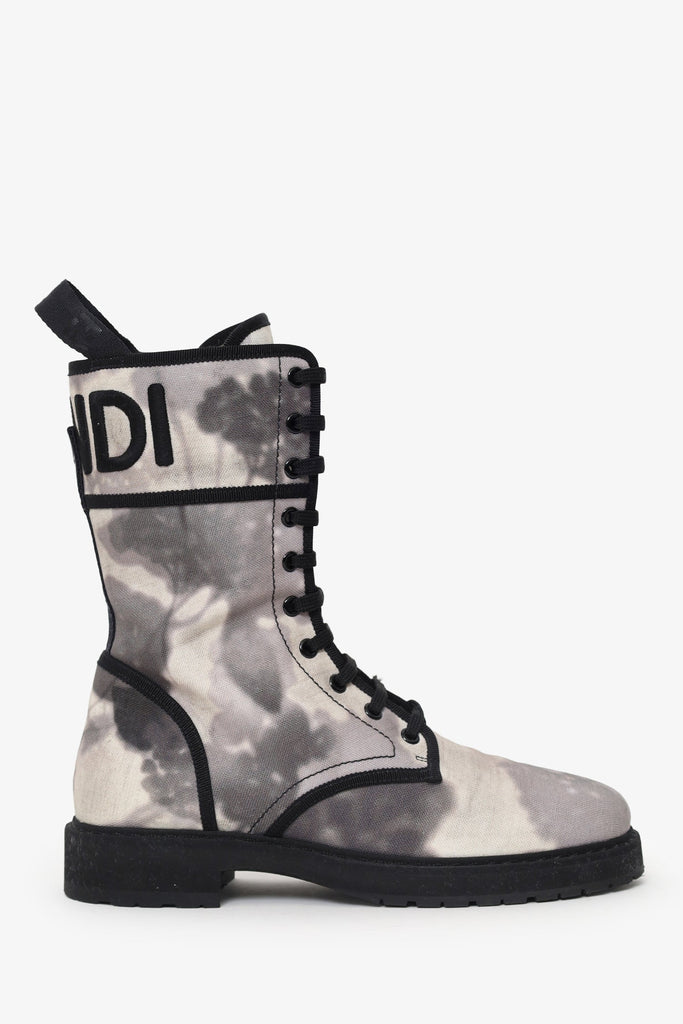 Fendi White/Grey Canvas Printed Combat Boots Size 39.5