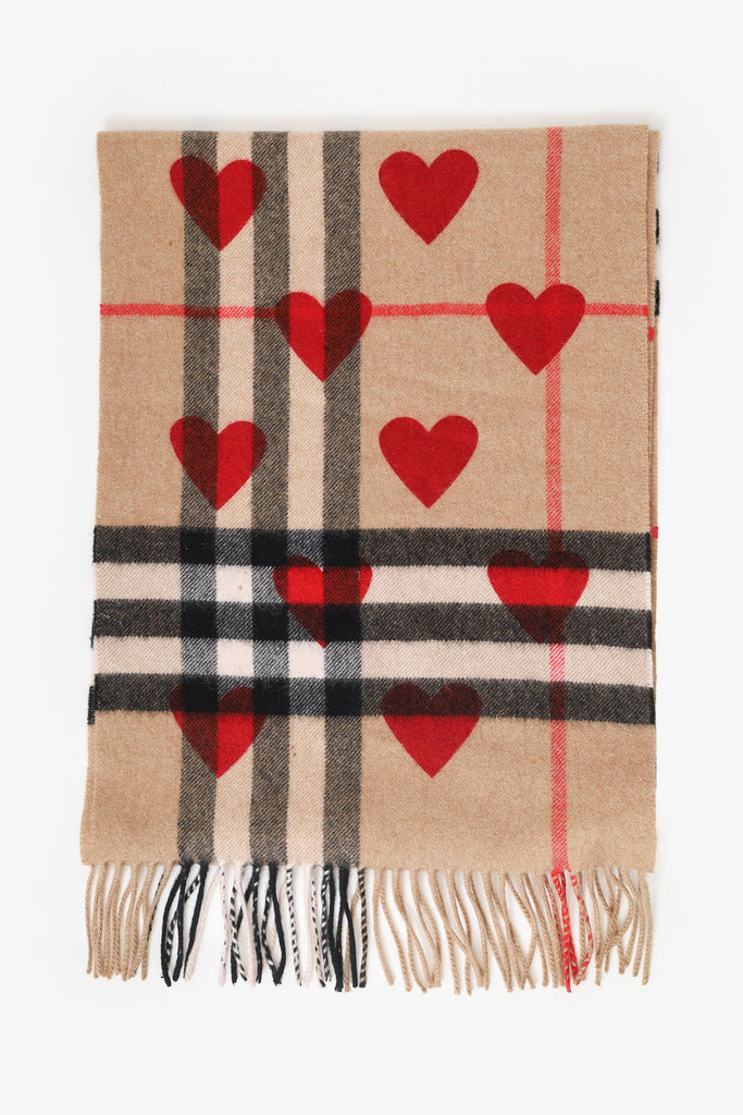 Burberry Brown Cashmere Nova Check Heart Print Fringe Scarf