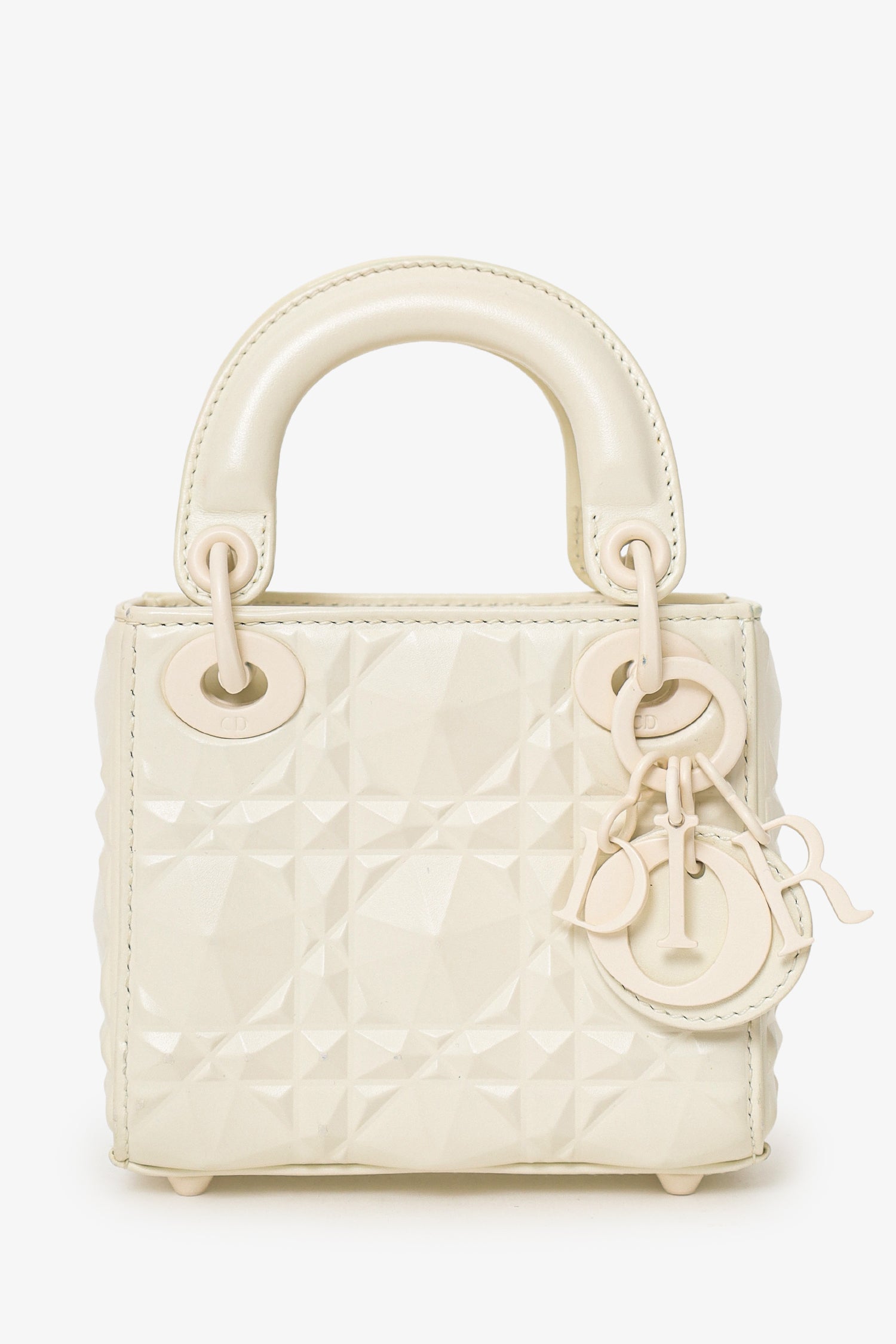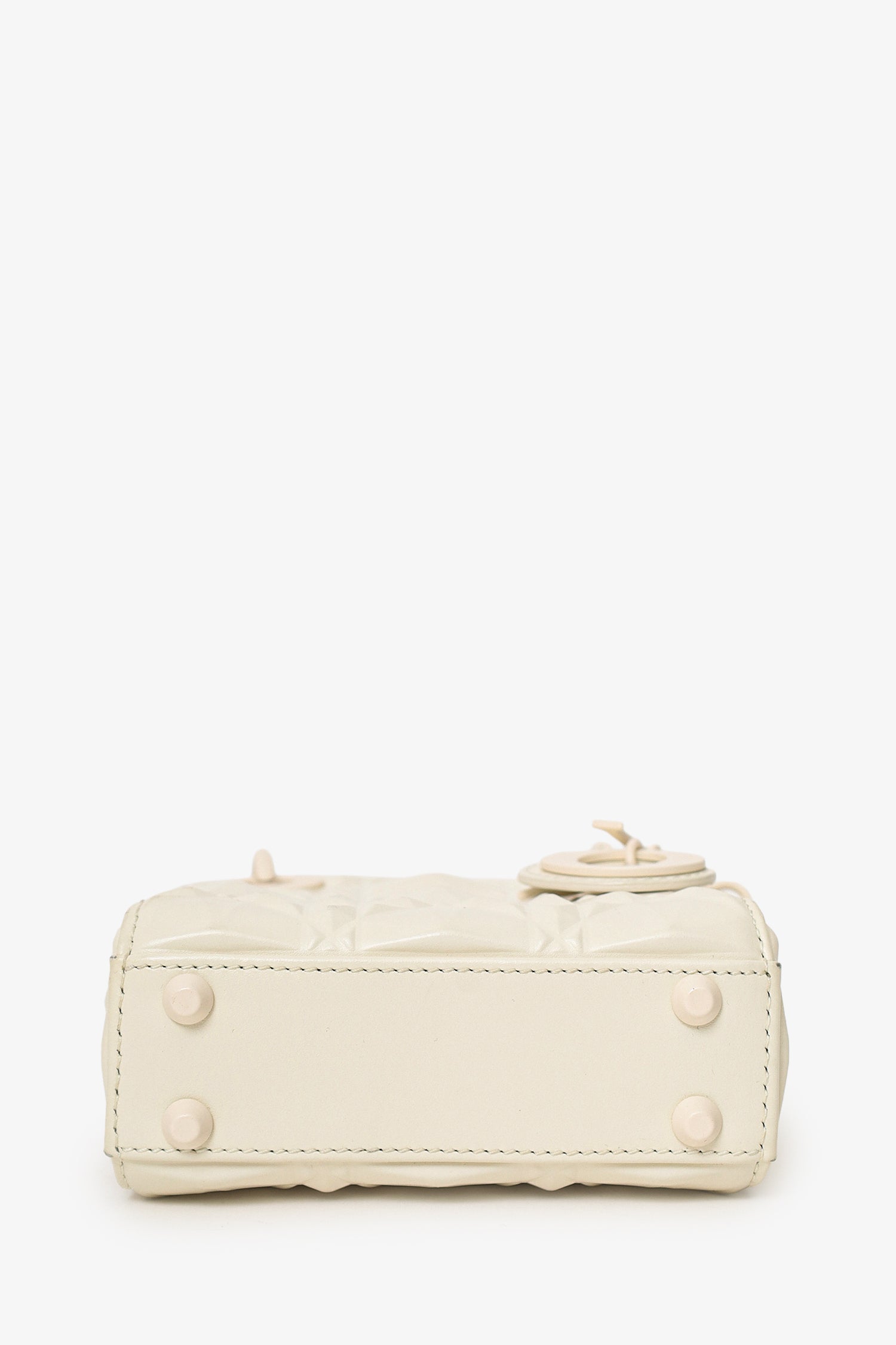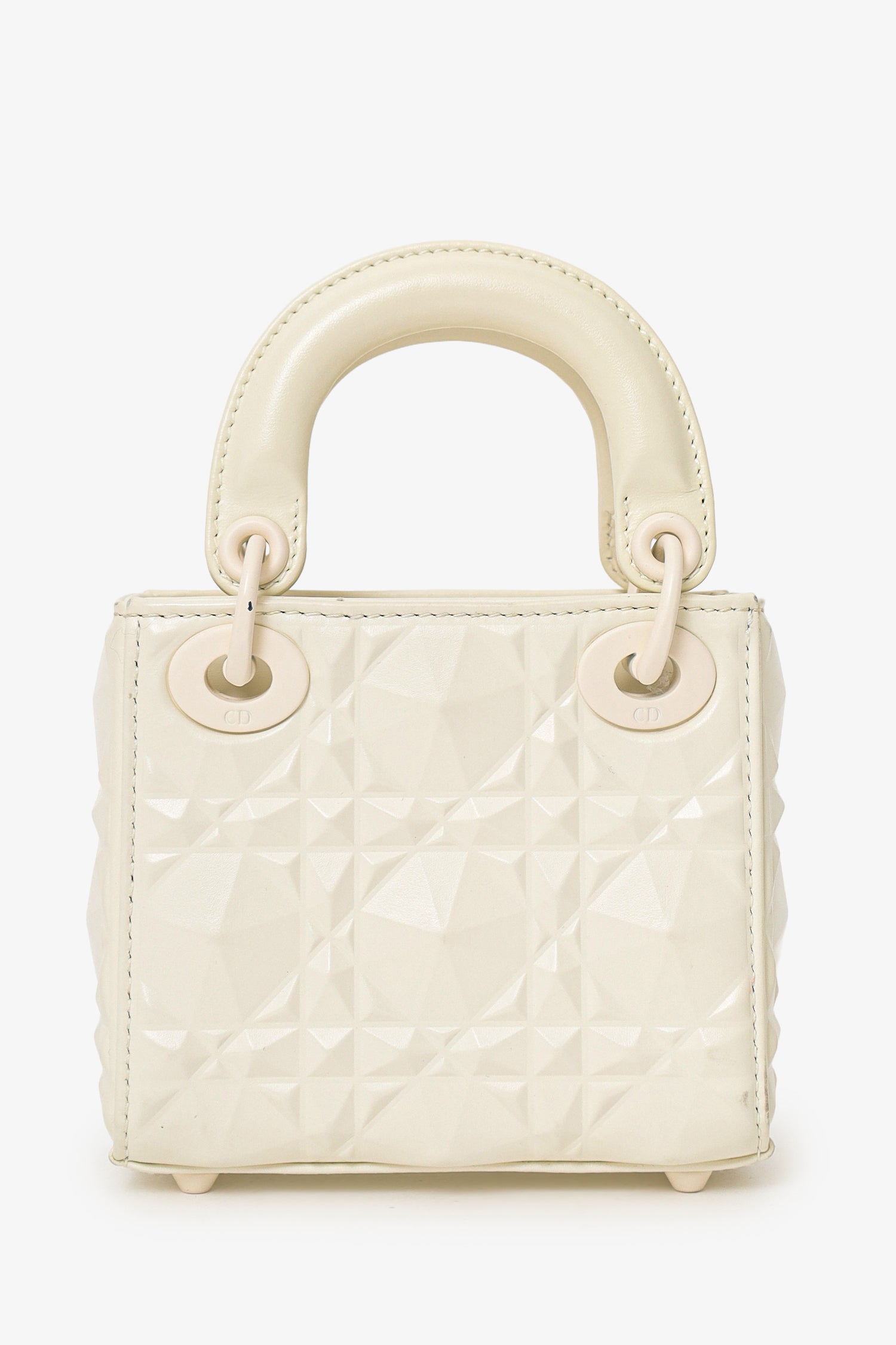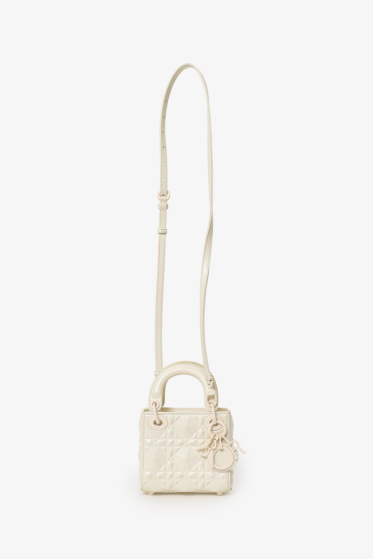 Christian Dior 2022 White Ultra Matte Calfskin Cannage Diamond Motif Micro Lady Dior. Interior fold-over flap closure. Twin top handles. Adjustable and removable shoulder strap. Protective base studs. Lined interior. Tonal stitching.