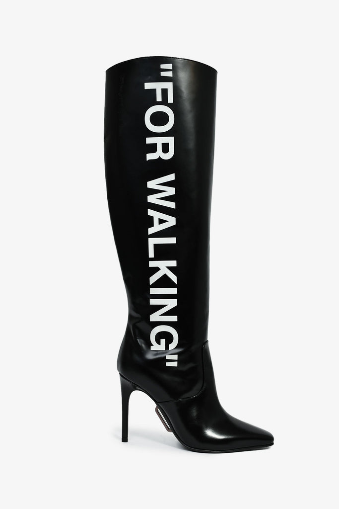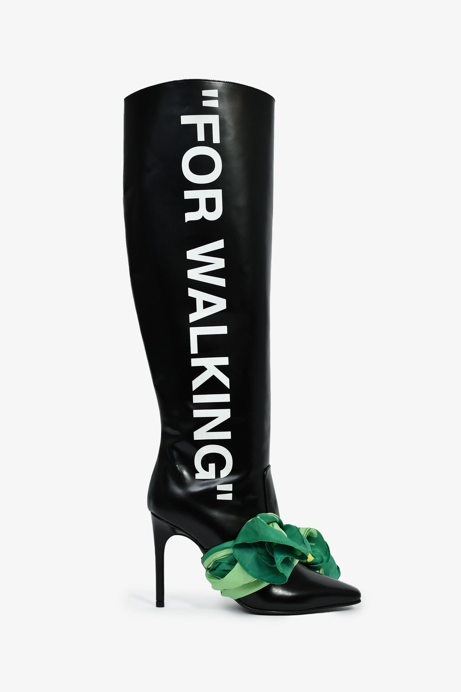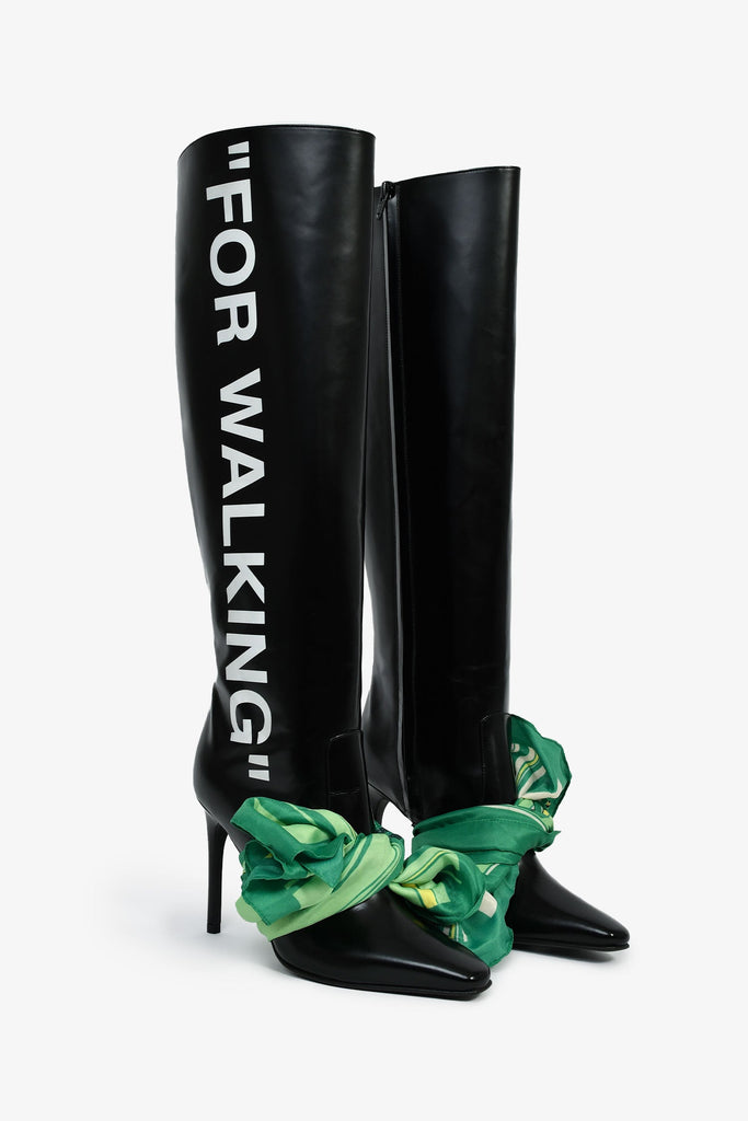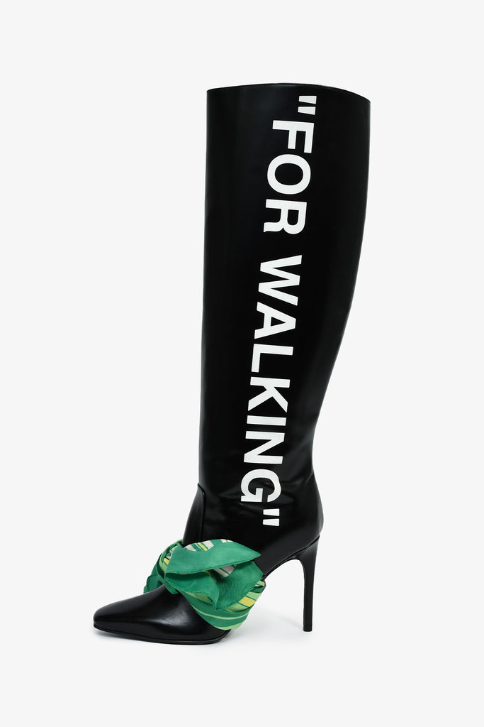 Off-White Black Leather Green Scarf Detail 'For Walking' Heeled Boots Size 36