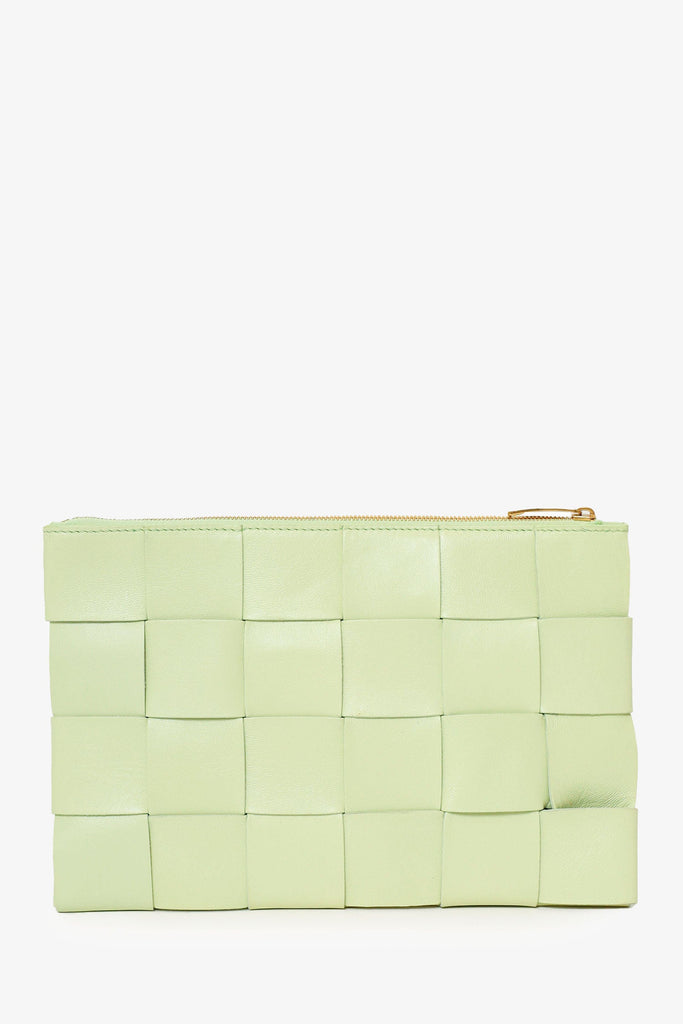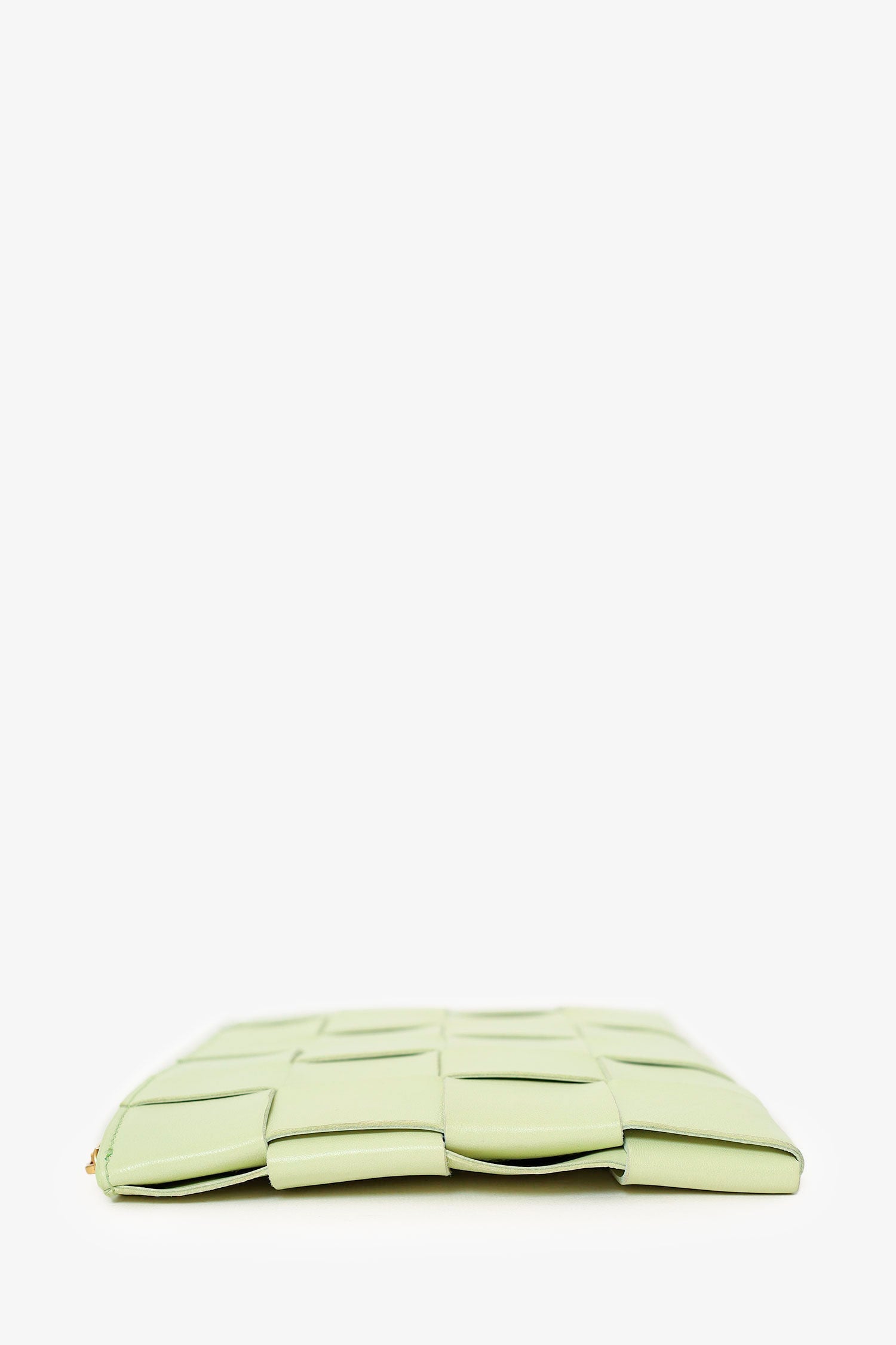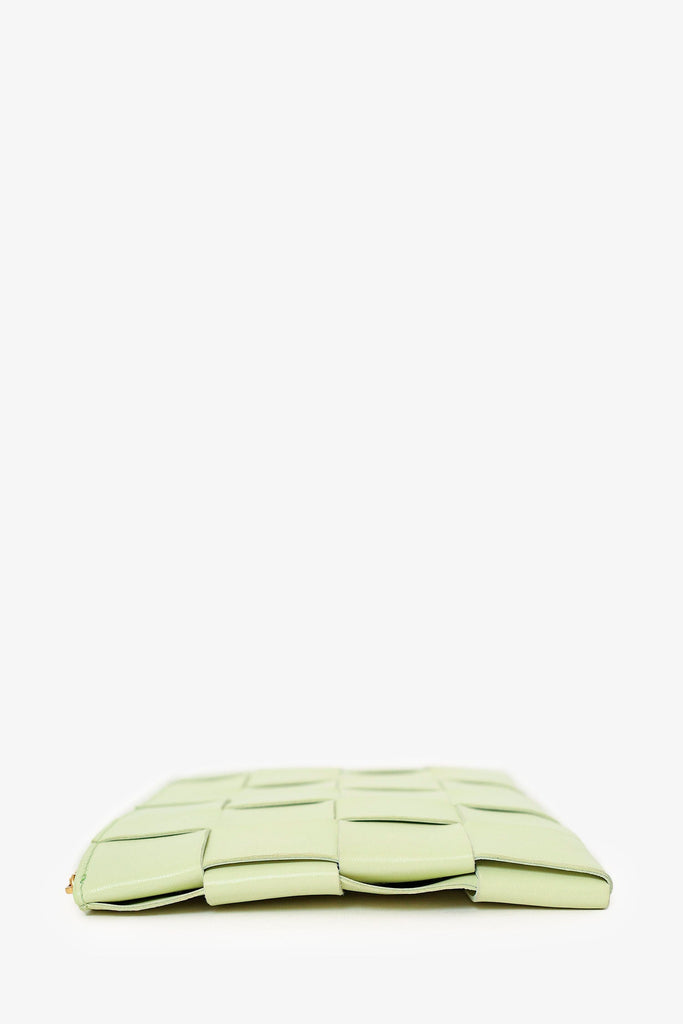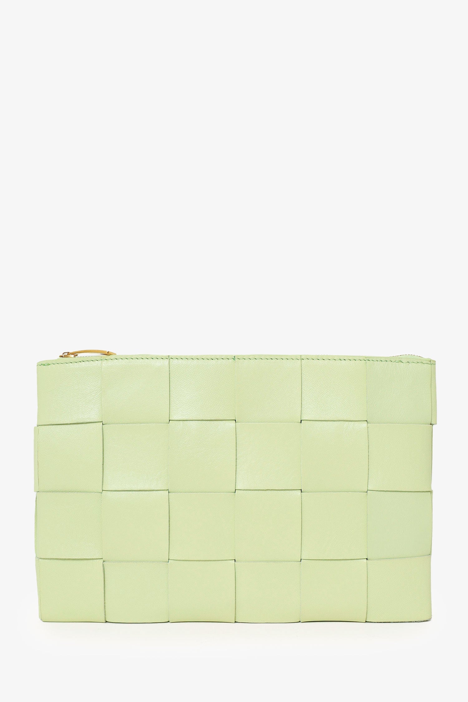 Bottega Veneta Green Leather Small Intreccio Pouch. Top zip closure. Open interior with no lining. 1 interior rear wall slip pocket. Gold-tone hardware. Tonal stitching.