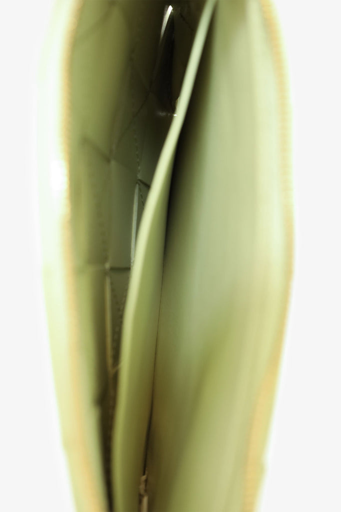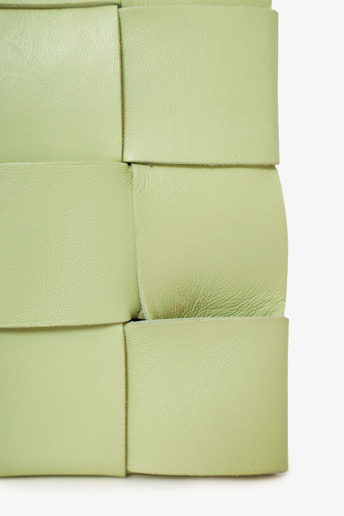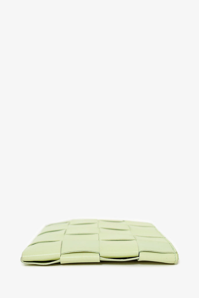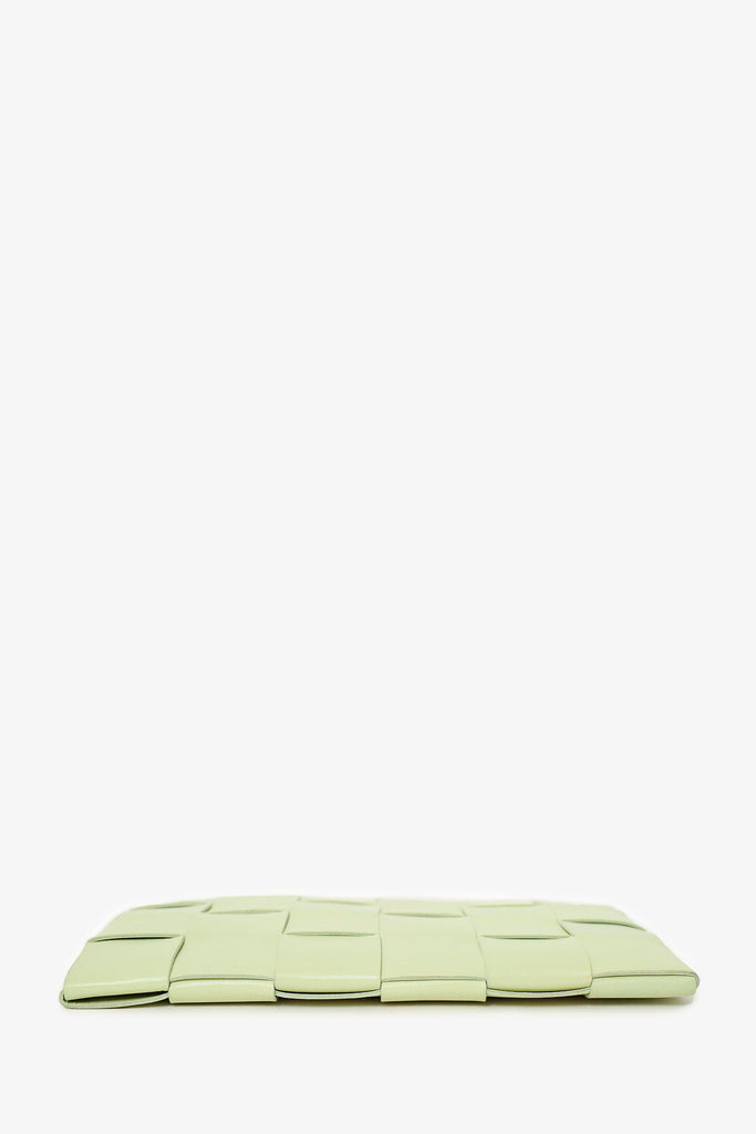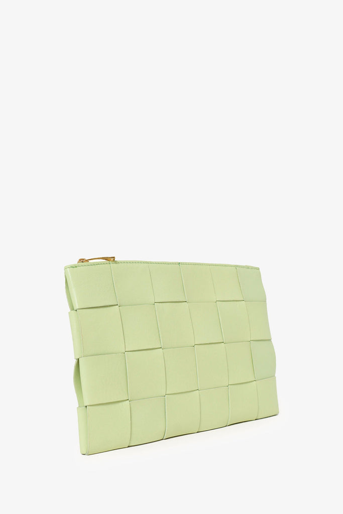 Bottega Veneta Green Leather Small Intreccio Pouch. Top zip closure. Open interior with no lining. 1 interior rear wall slip pocket. Gold-tone hardware. Tonal stitching.