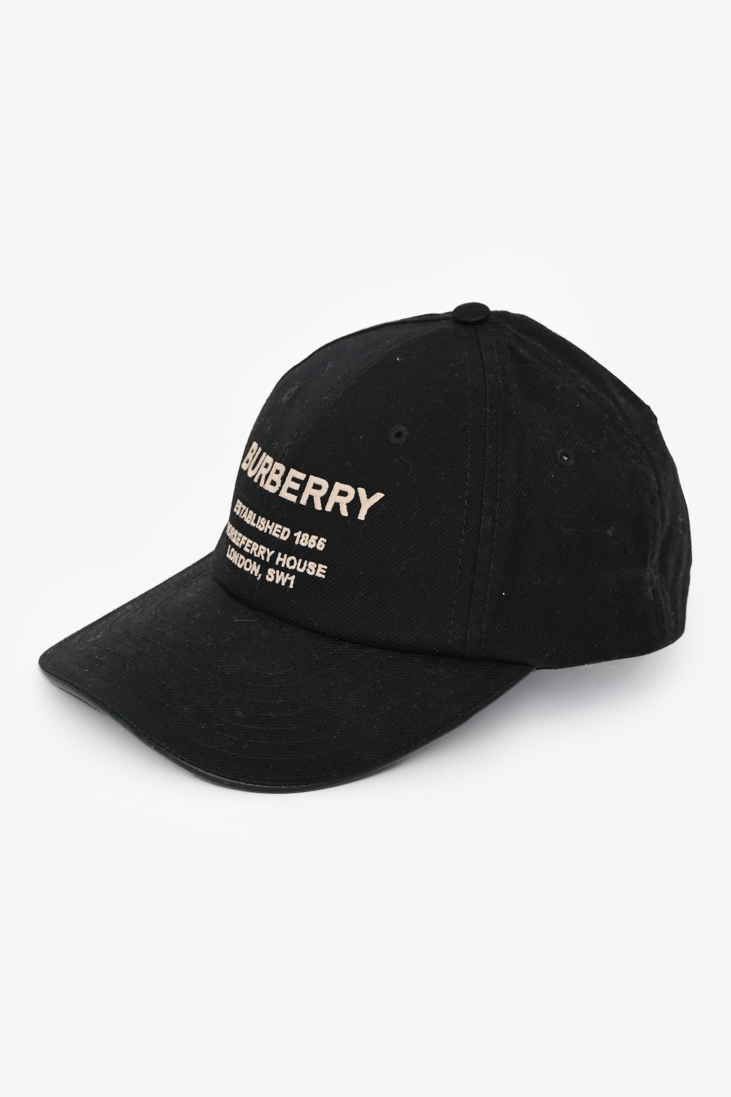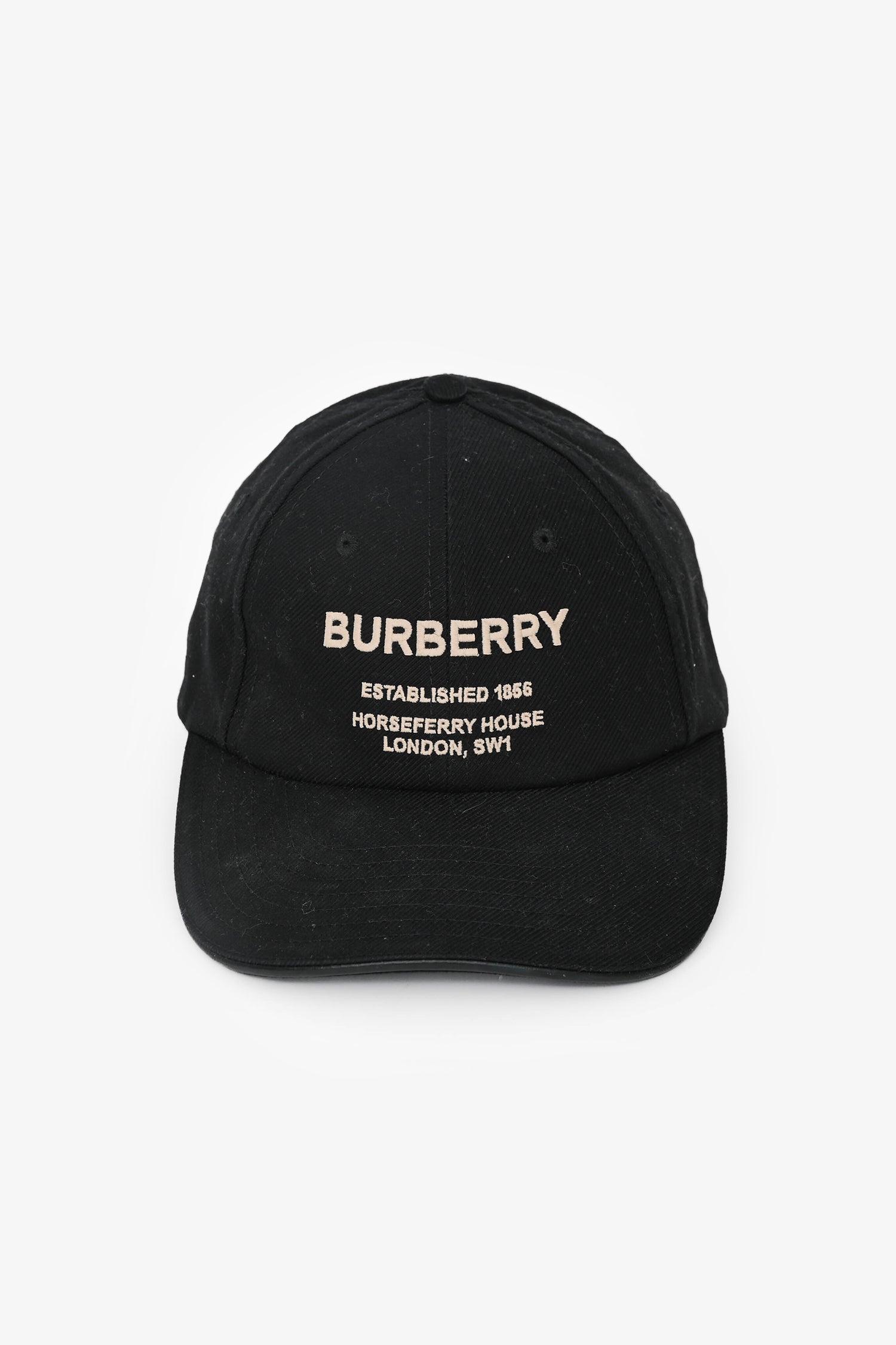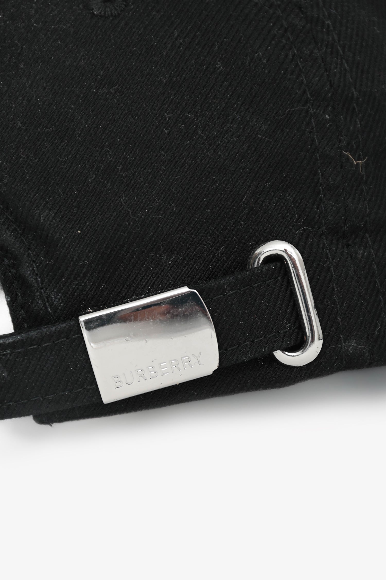 Burberry Black Logo Embroidered Cap. Adjustable back strap. Front logo embroidery. Tonal stitching.