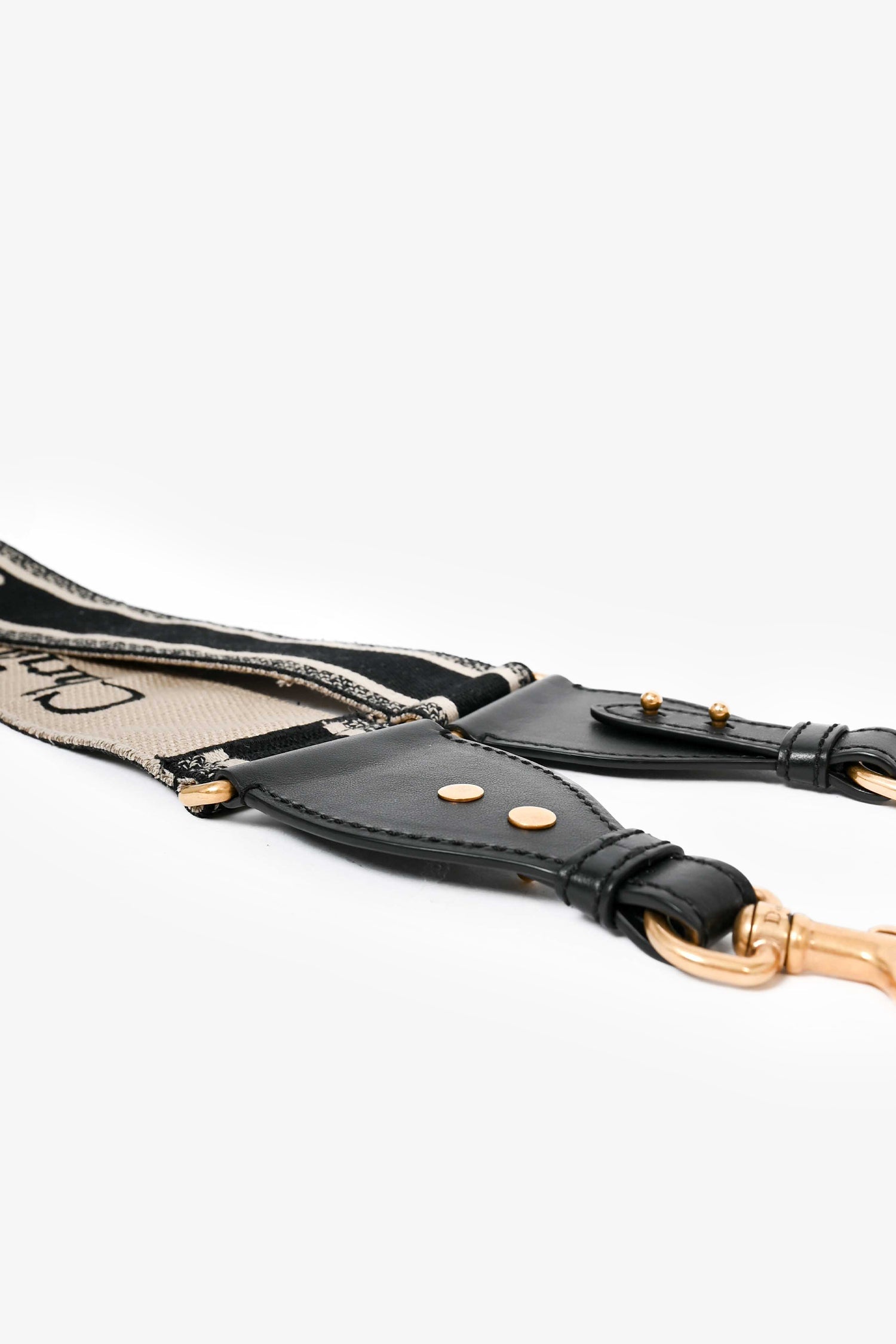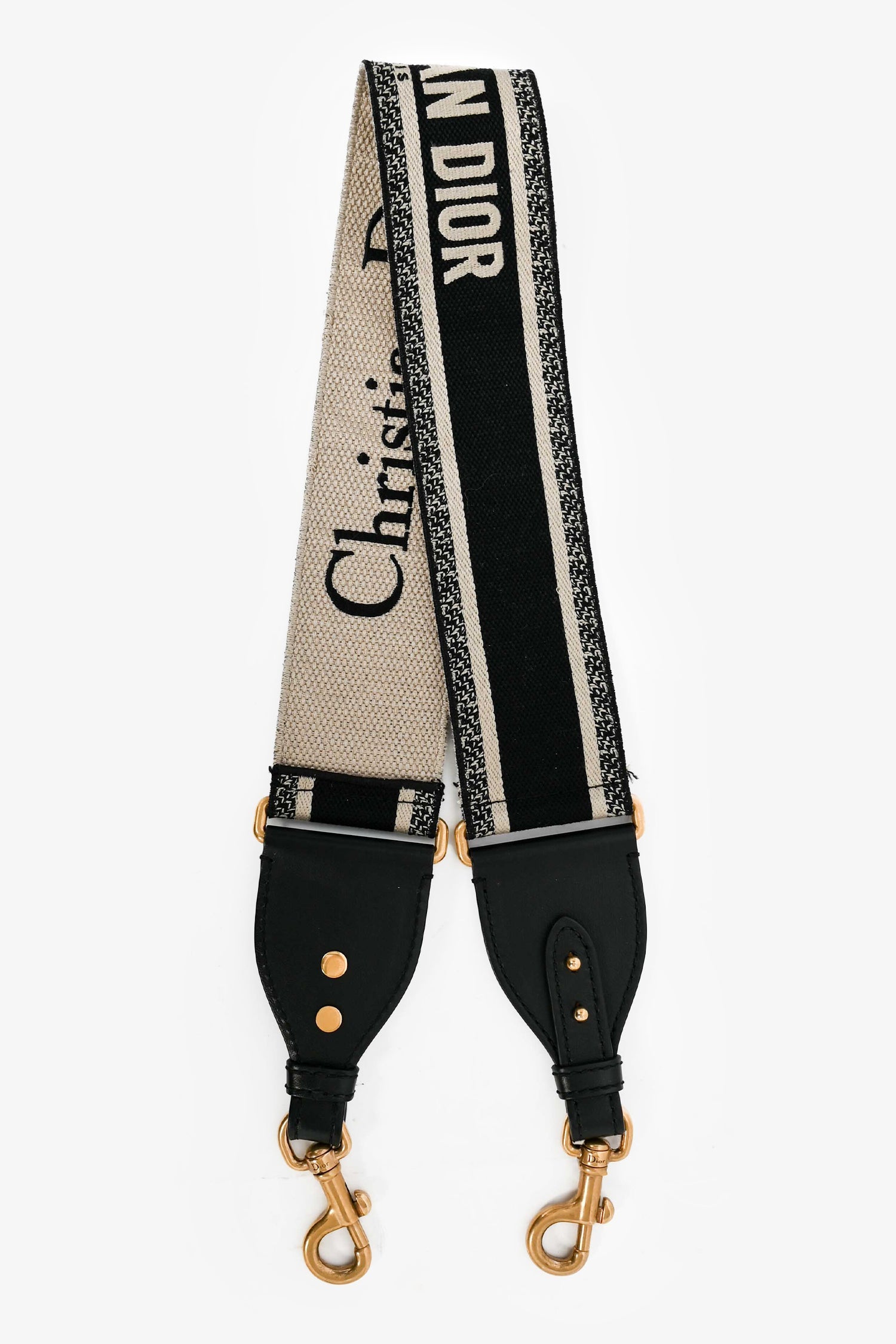 Christian Black Logo Canvas Guitar Strap. Lobster clasp closure. Leather trimmings. Tonal and contrast stitching. Antiqued gold-tone hardware.