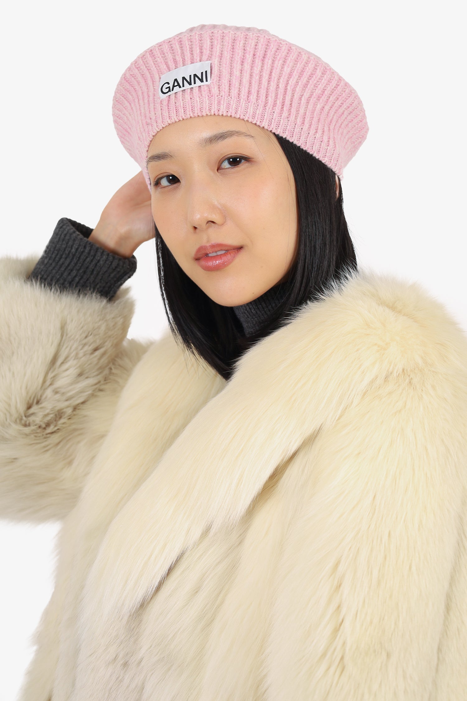 Ganni Pink Knit Wool Hat. Tonal stitching.
