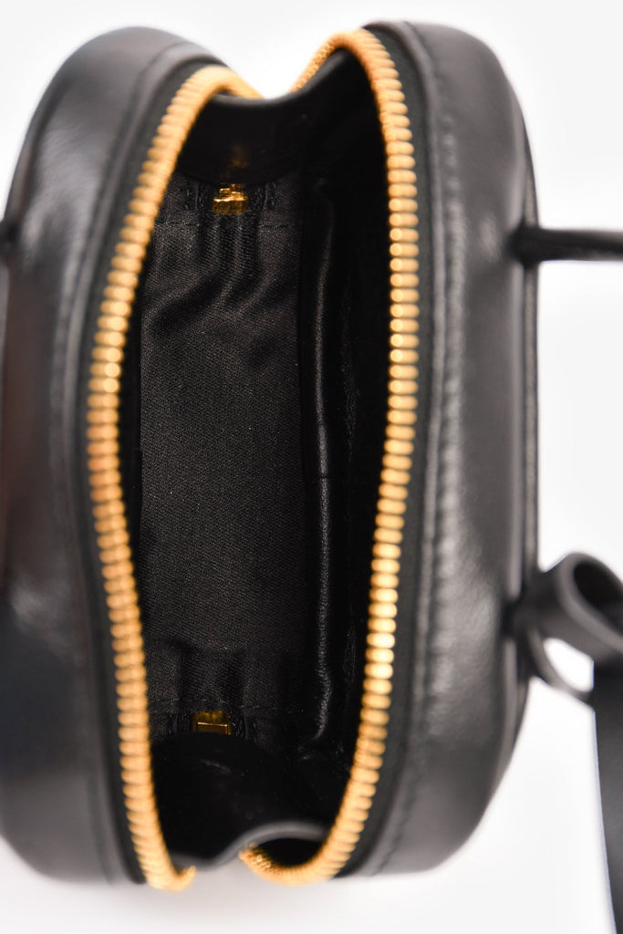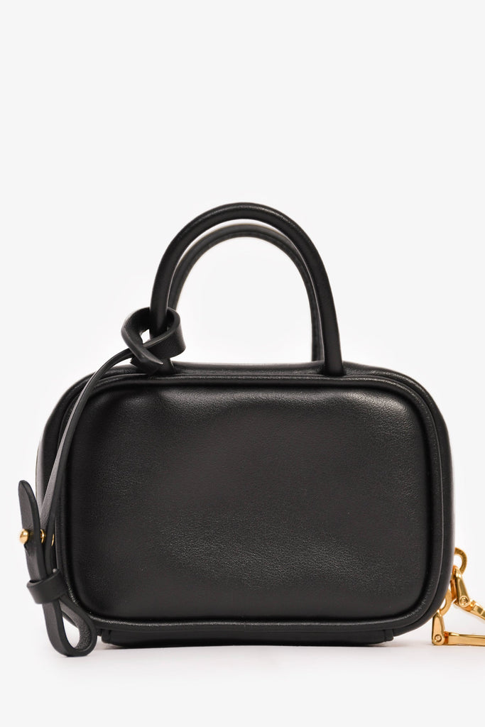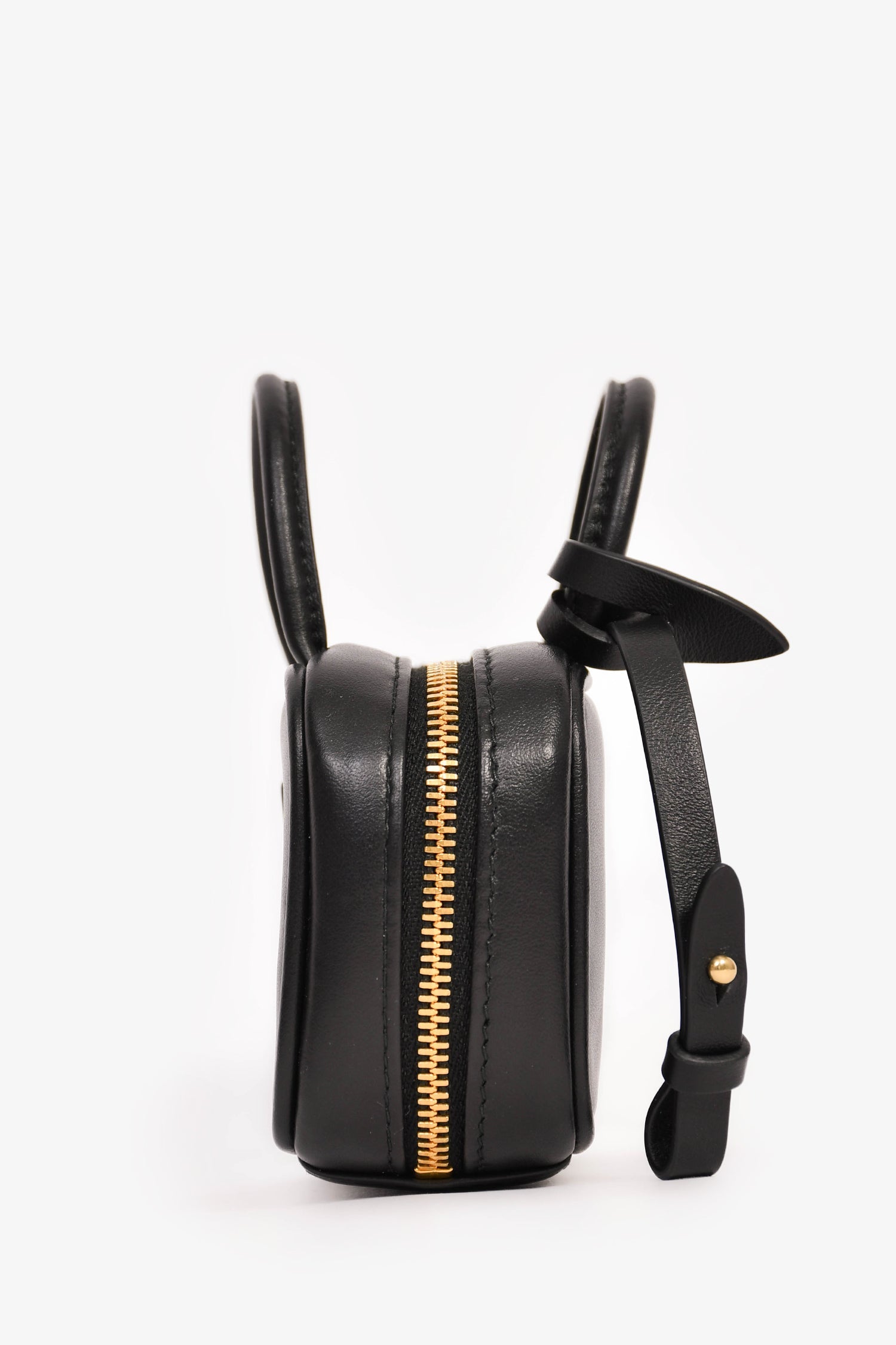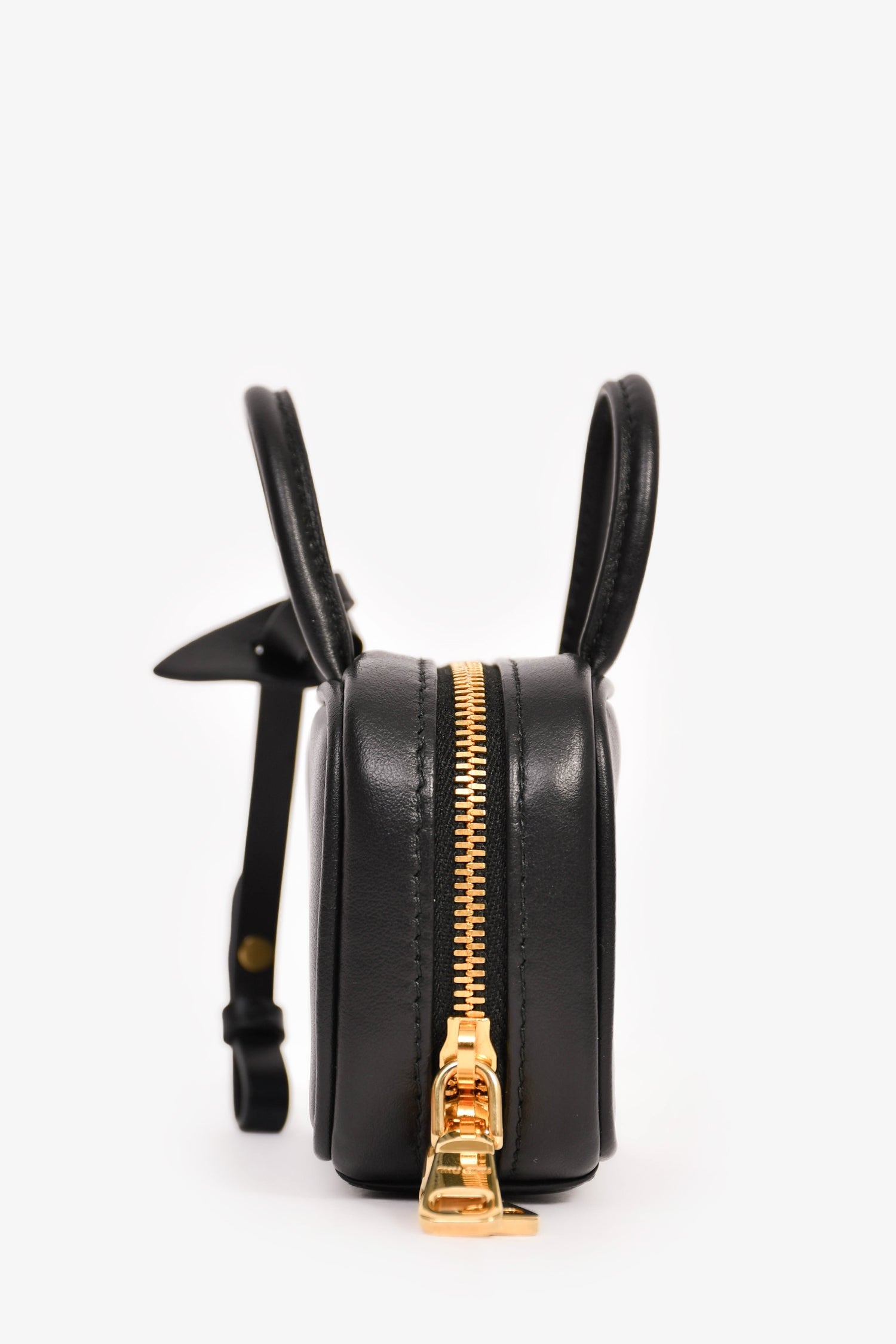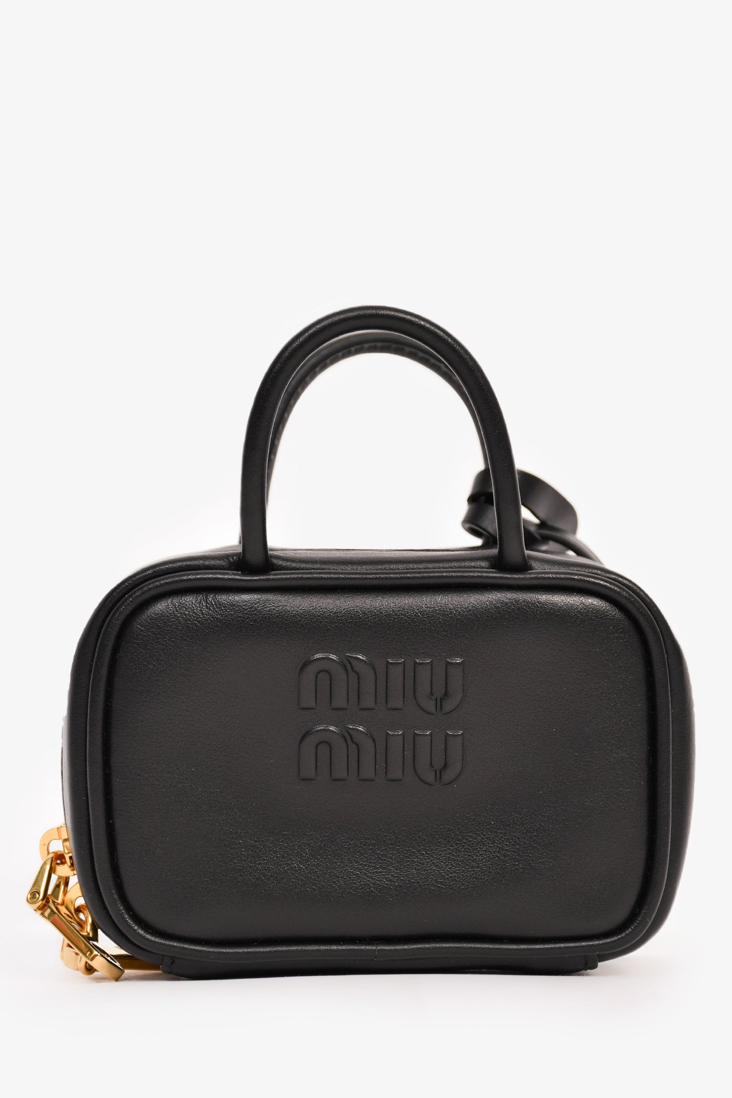 Miu Miu Black Leather Logo Mini Top Handle Keychain. Dual top handles. Top 2-way zip closure. Single interior compartment. Textile-lined interior. Gold-tone hardware. Tonal stitching.