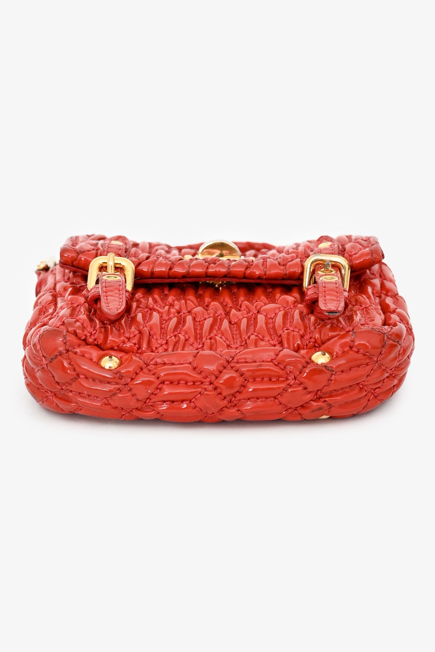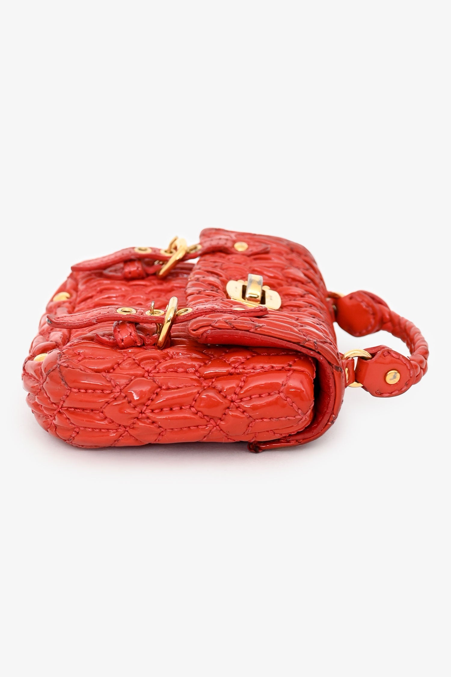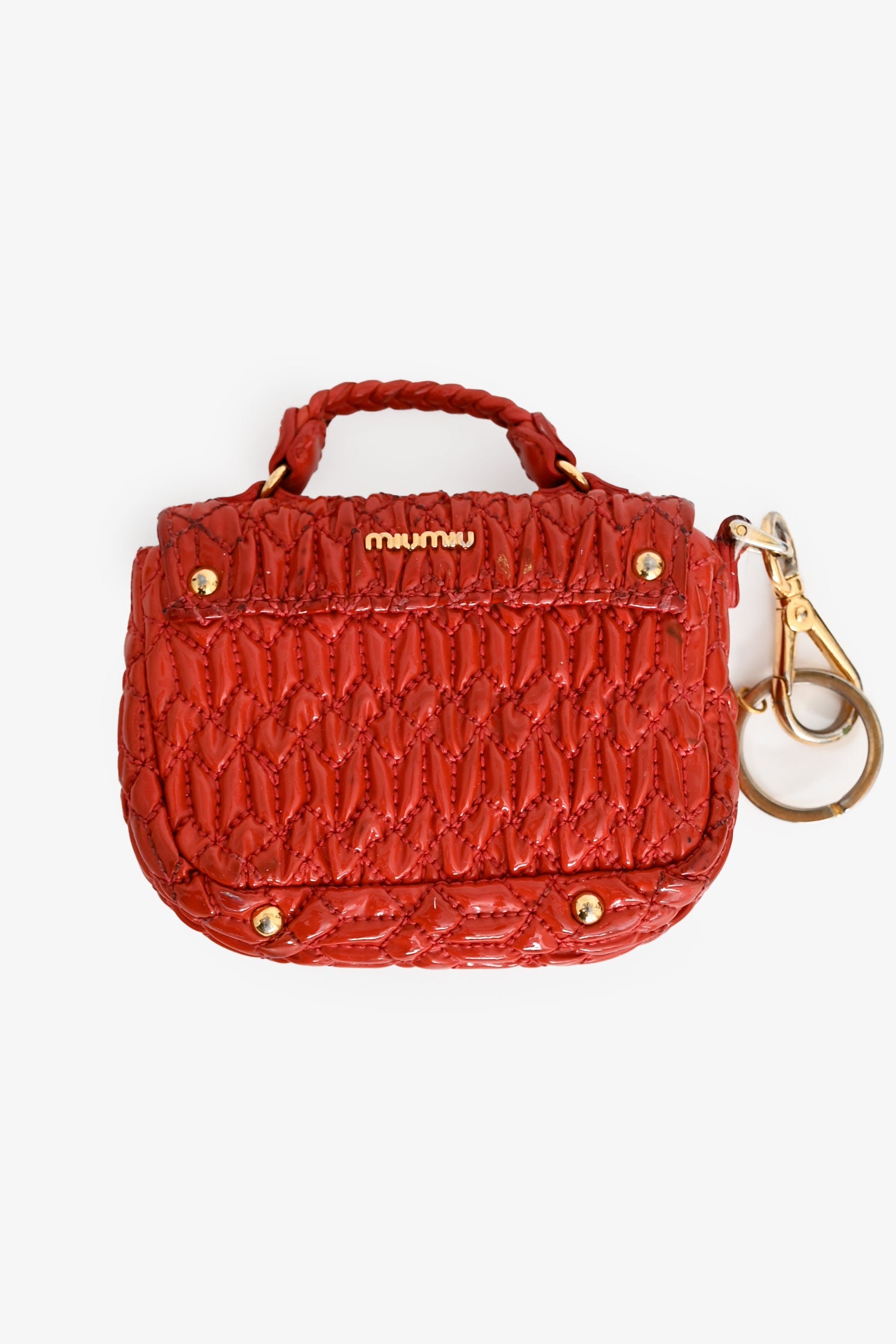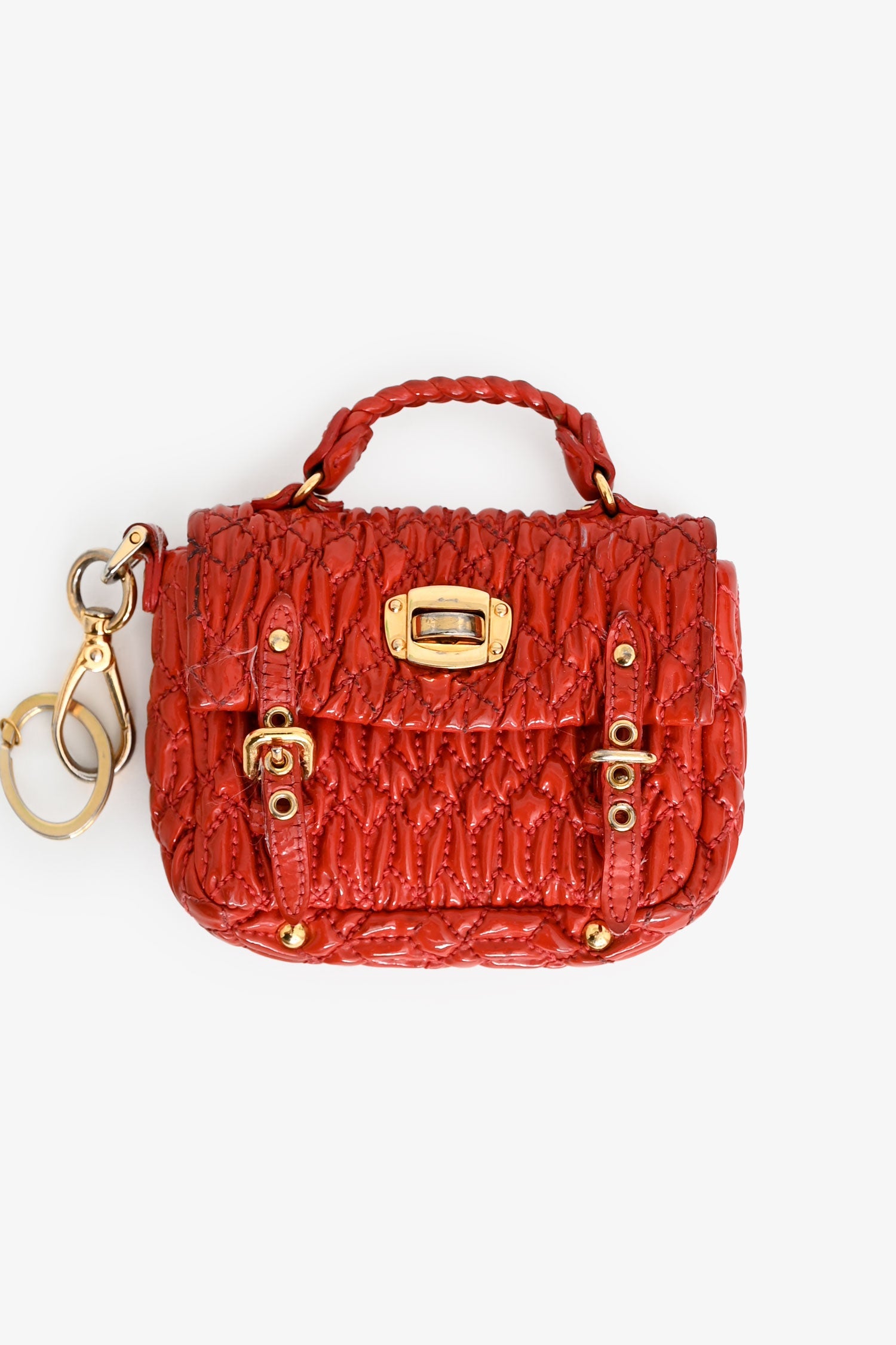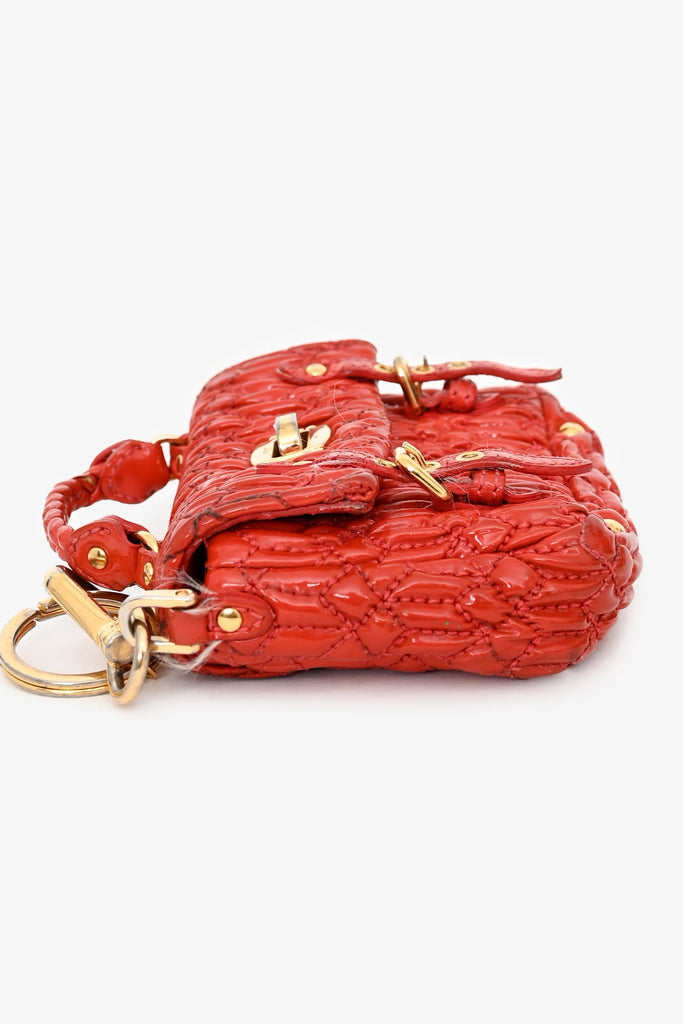Miu Miu Red Patent Leather Bag Charm. Front fold-over flap with double buckle closure. Front lobster clasp fastening. Gold-tone hardware. Tonal stitching.