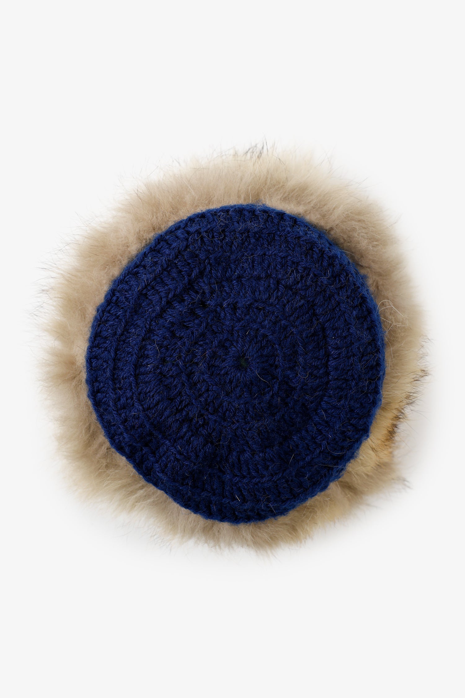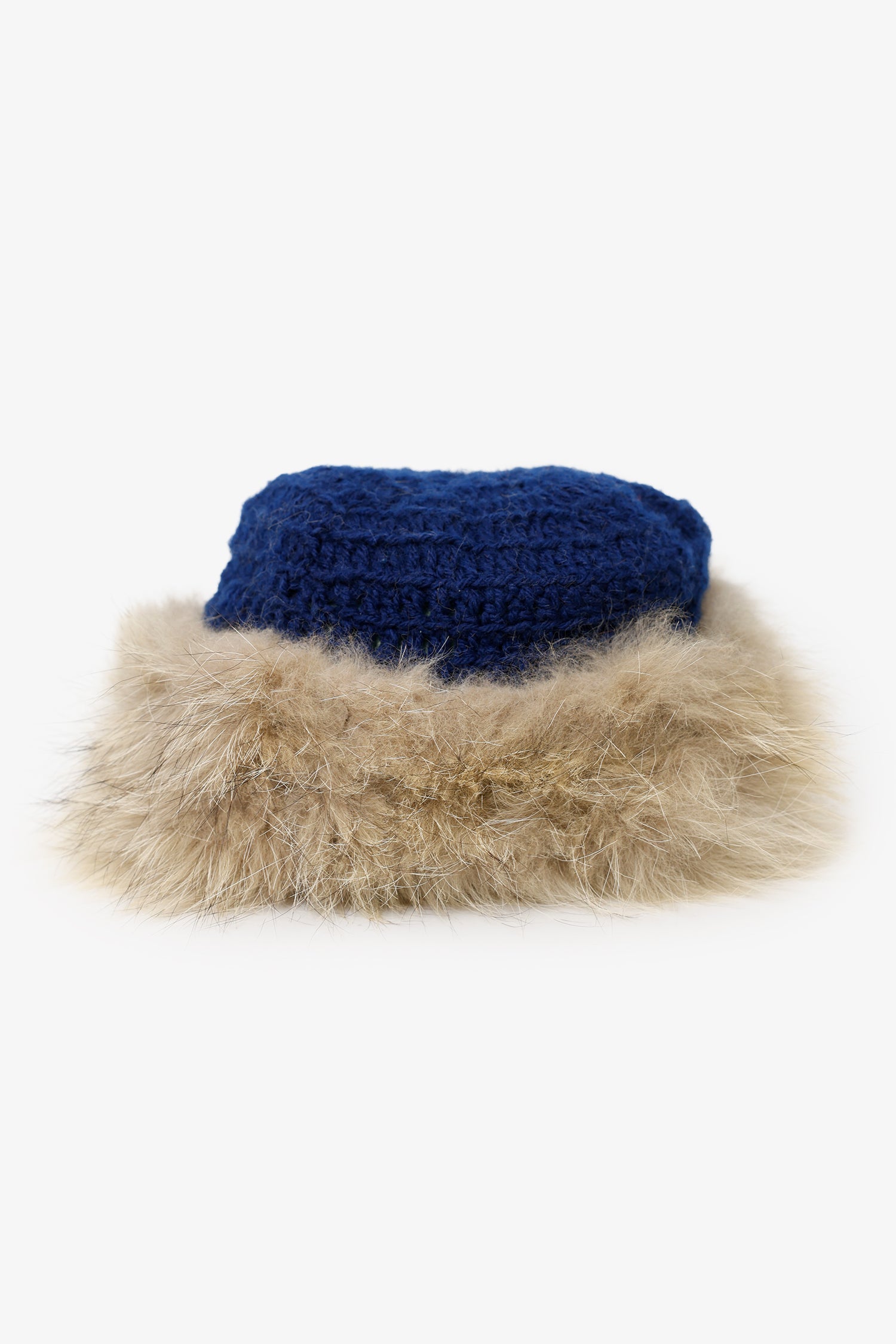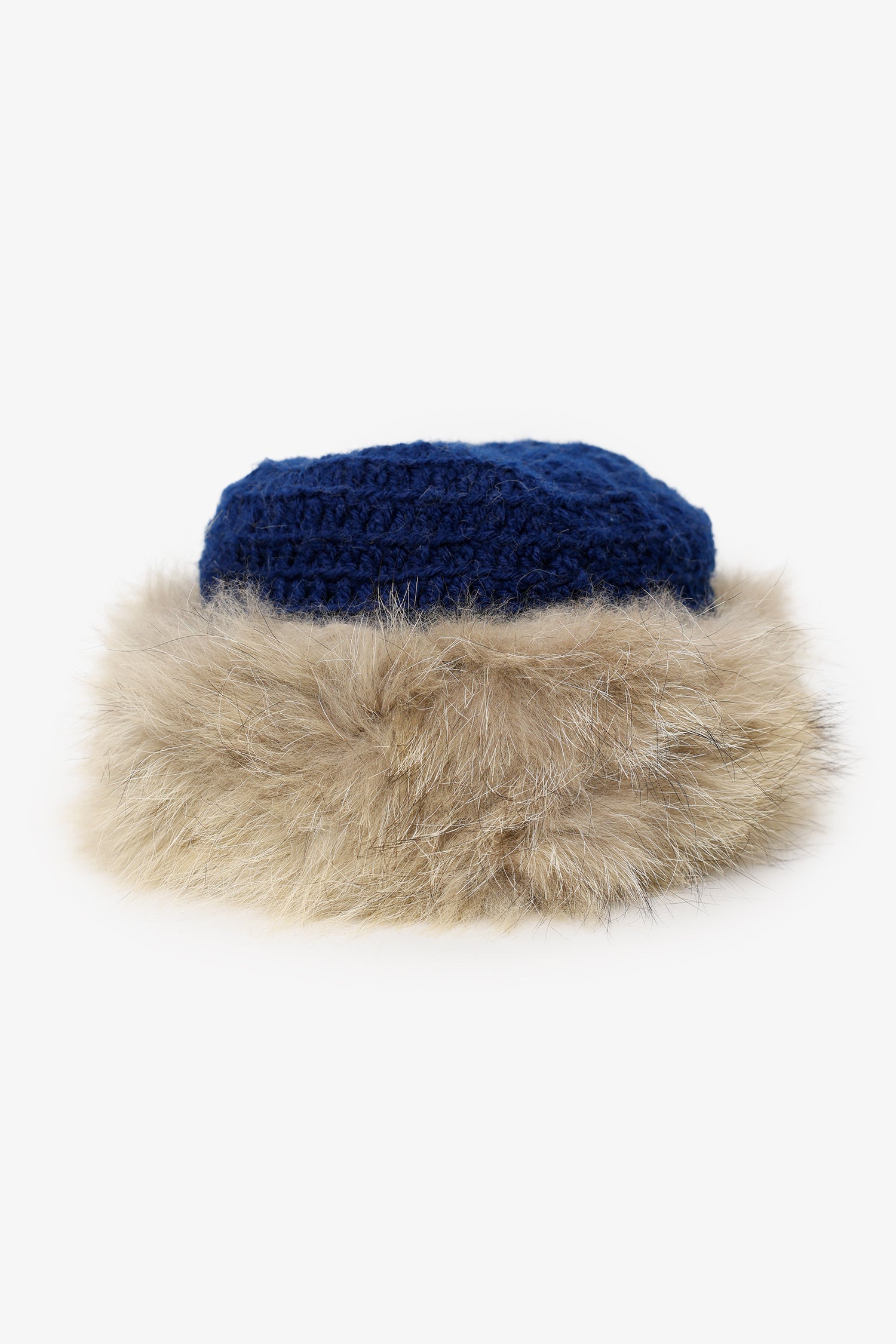 Vintage Coyote Fur & Blue Knitted Hat Cap Women. Tonal stitching.