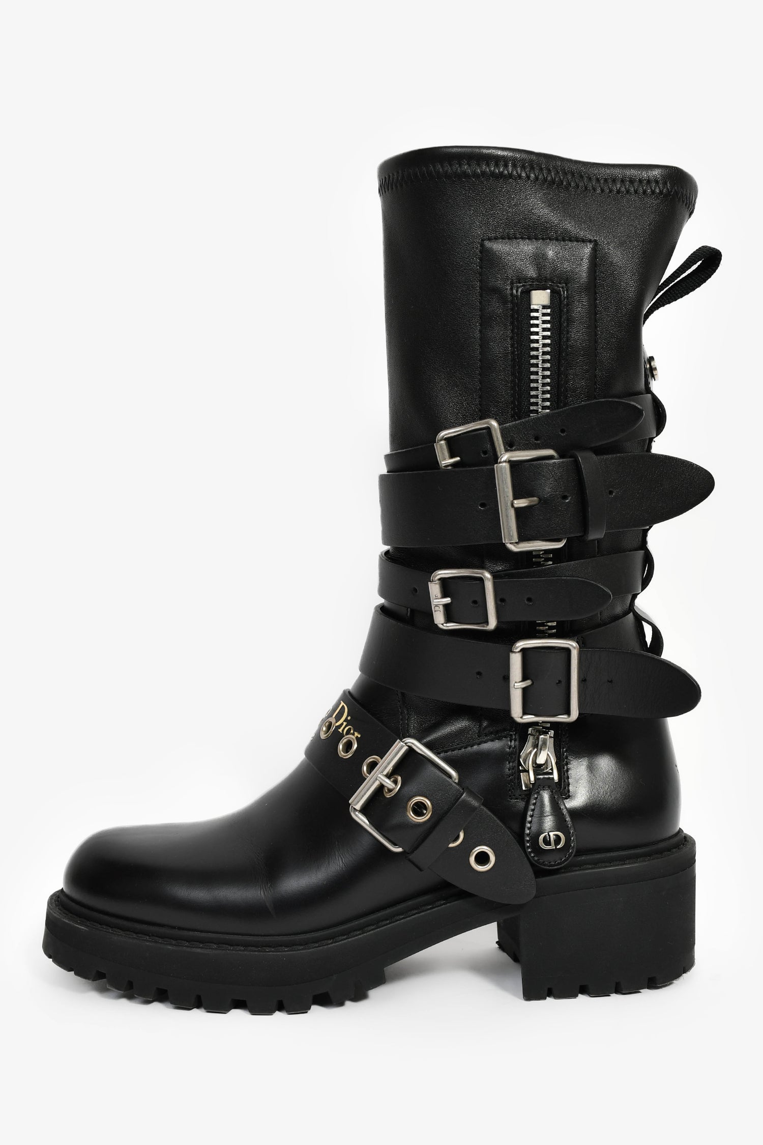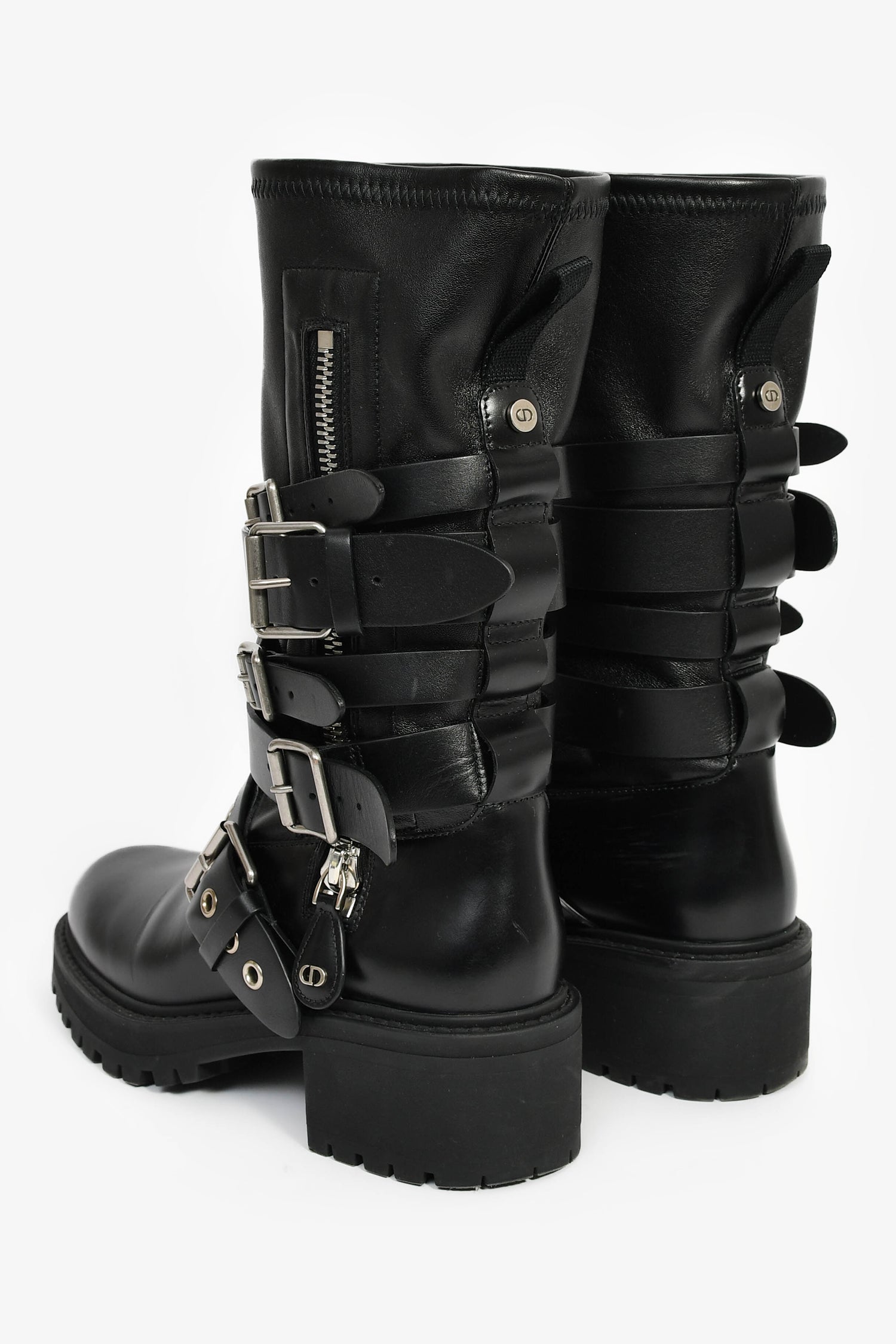 Christian Dior Black Leather Buckle 'Fight' Combat Boots. Pull-on. Round toe. Side zip closure. Silver-tone hardware. Tonal stitching.