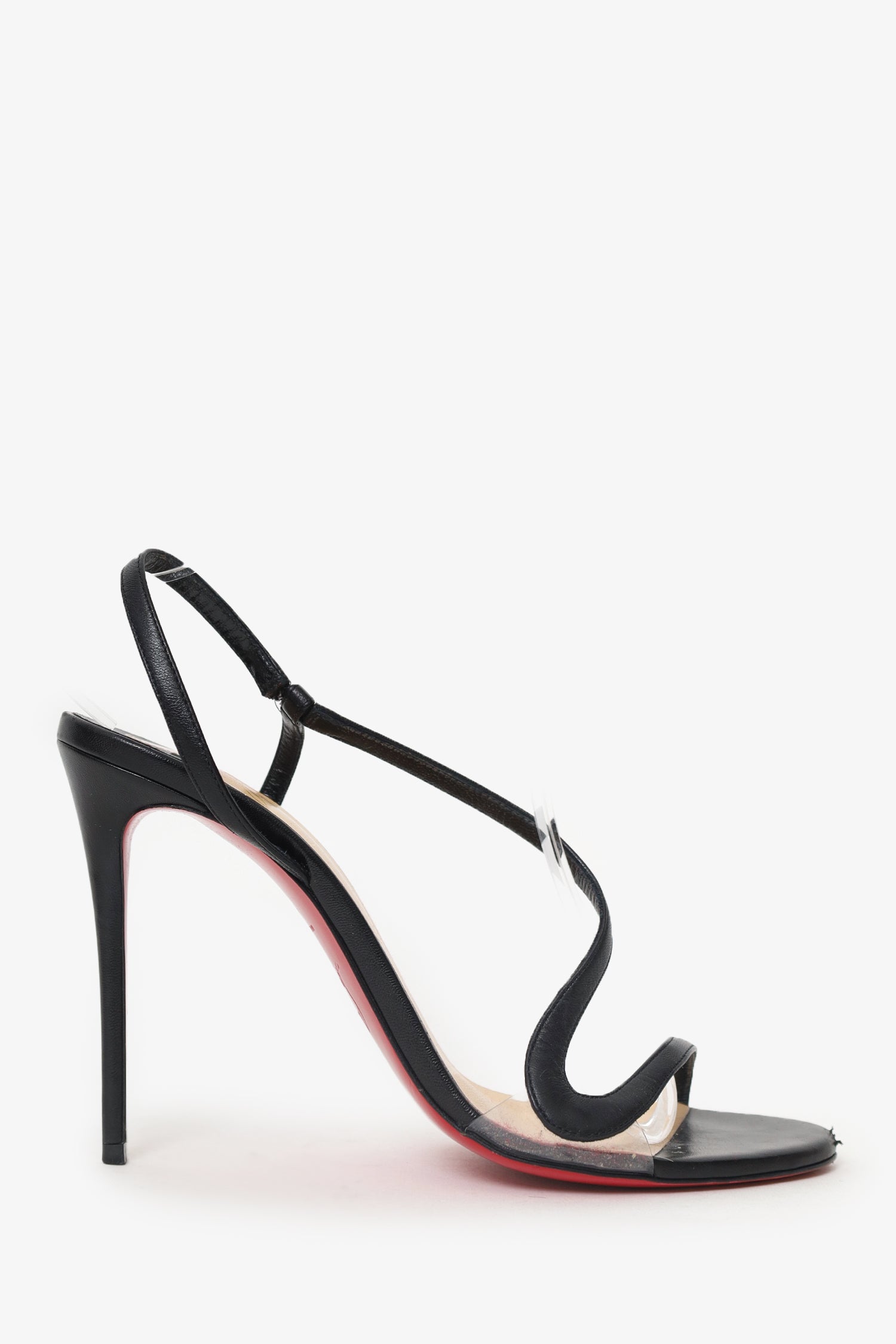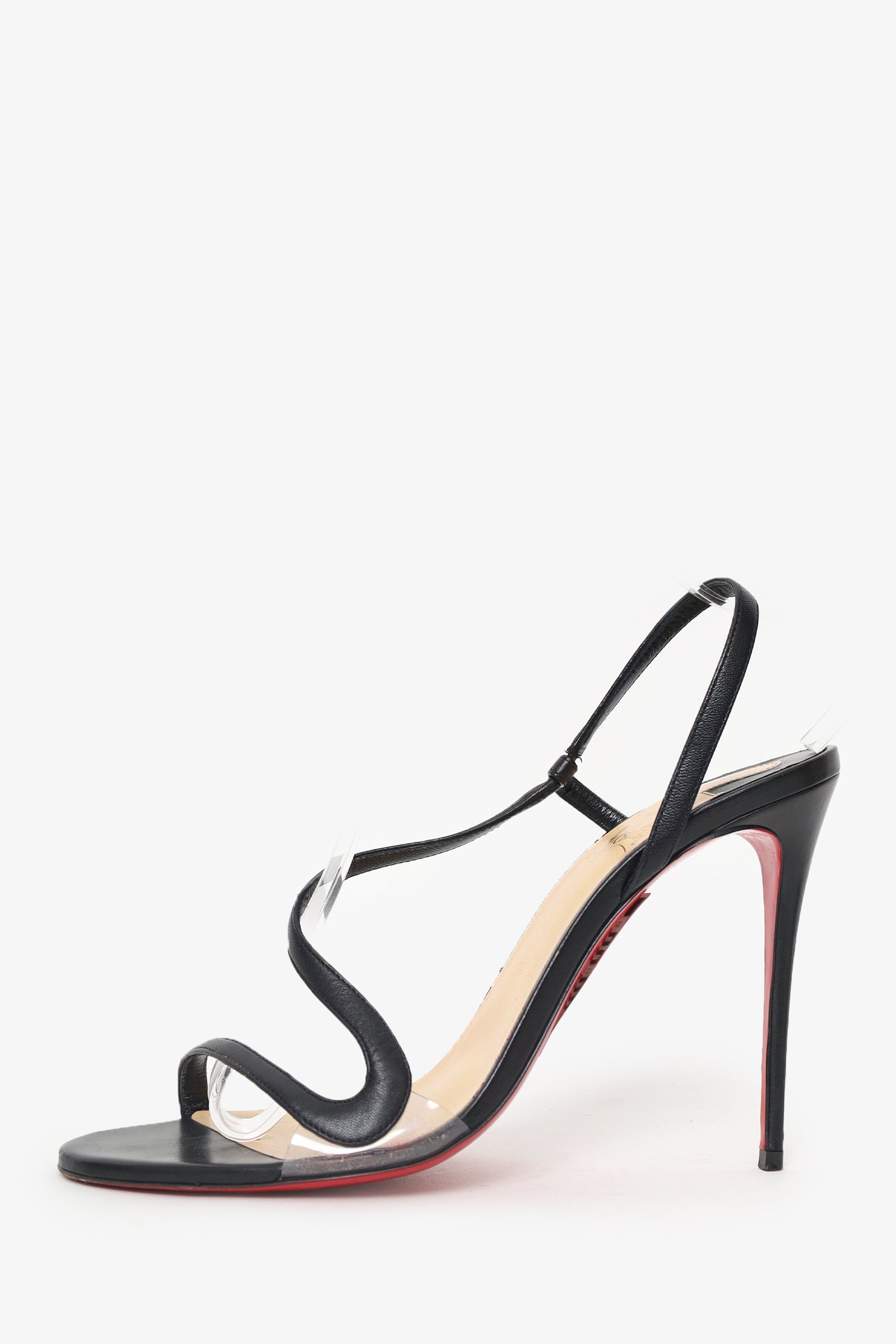 Christian Louboutin Black Leather Rosalie Heels. Slip-on. Round-open toe. Leather-lined interior. Tonal stitching.