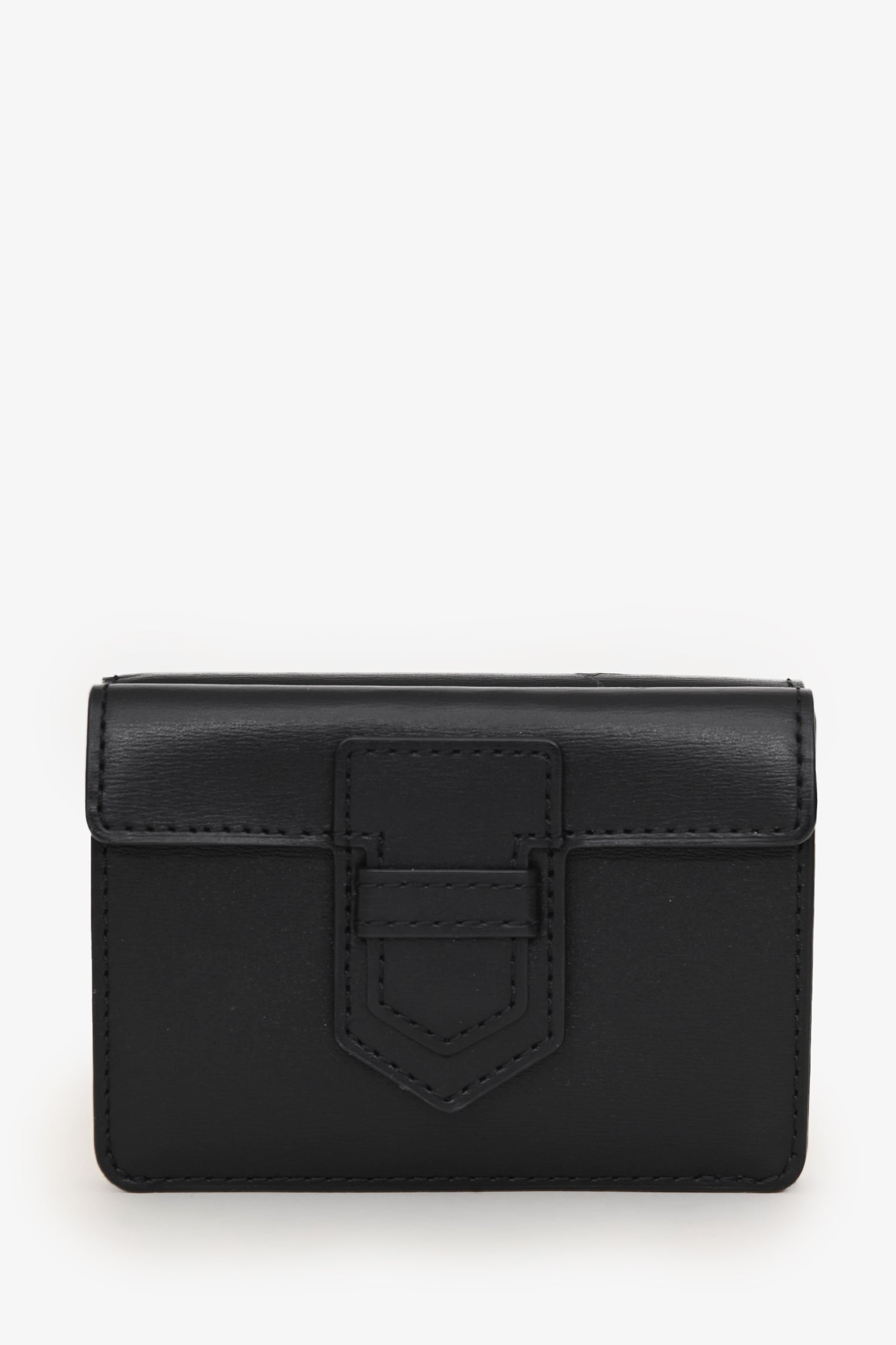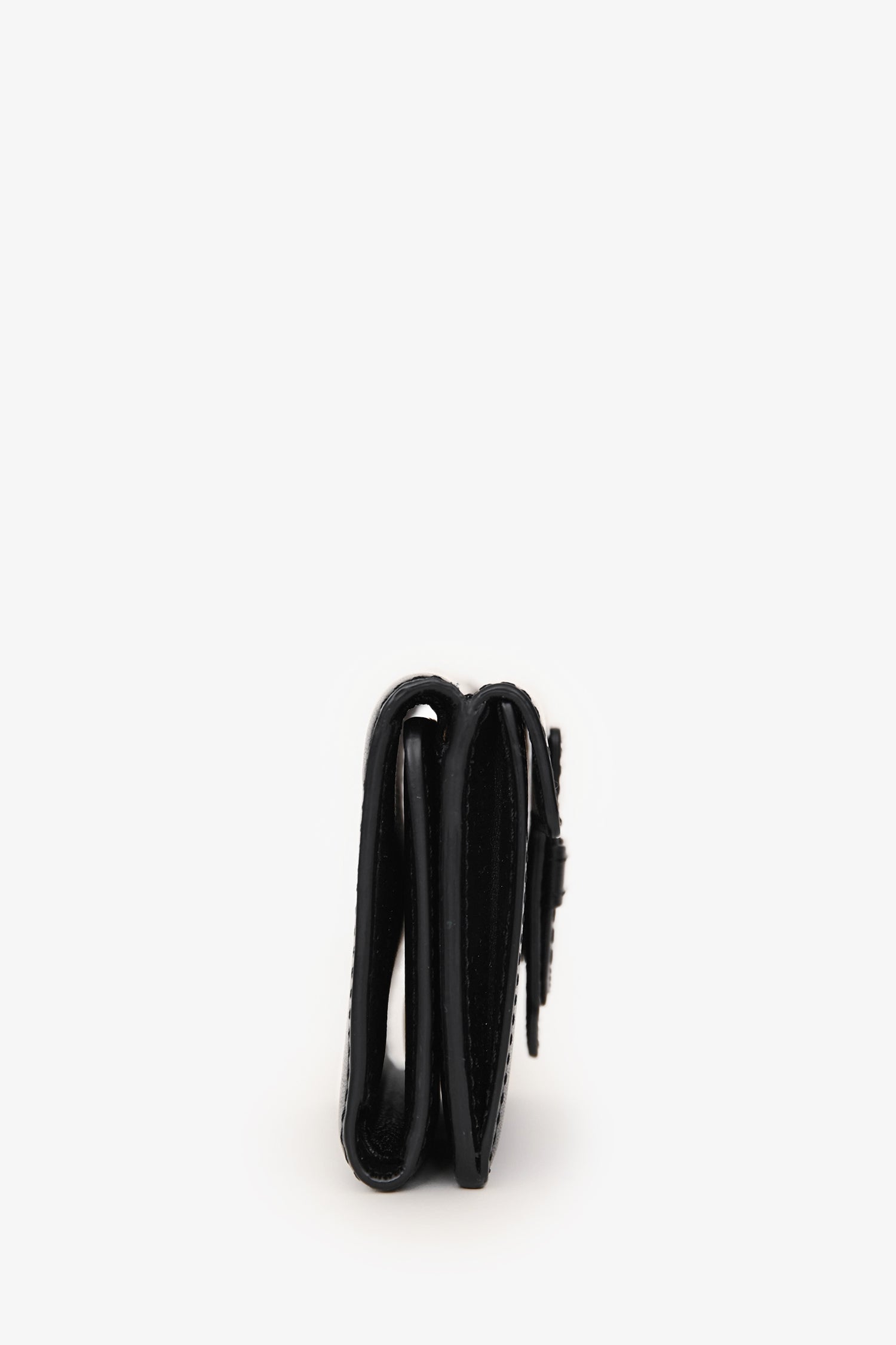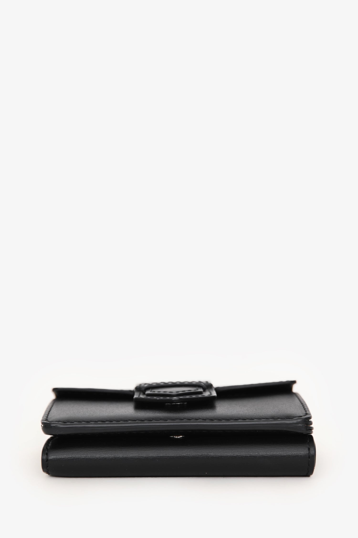 Delvaux Black Leather Presse Trifold Wallet. Snap closure. Exterior coin pouch. 1 bill compartment and 3 card slots. Silver-tone hardware. Tonal stitching.