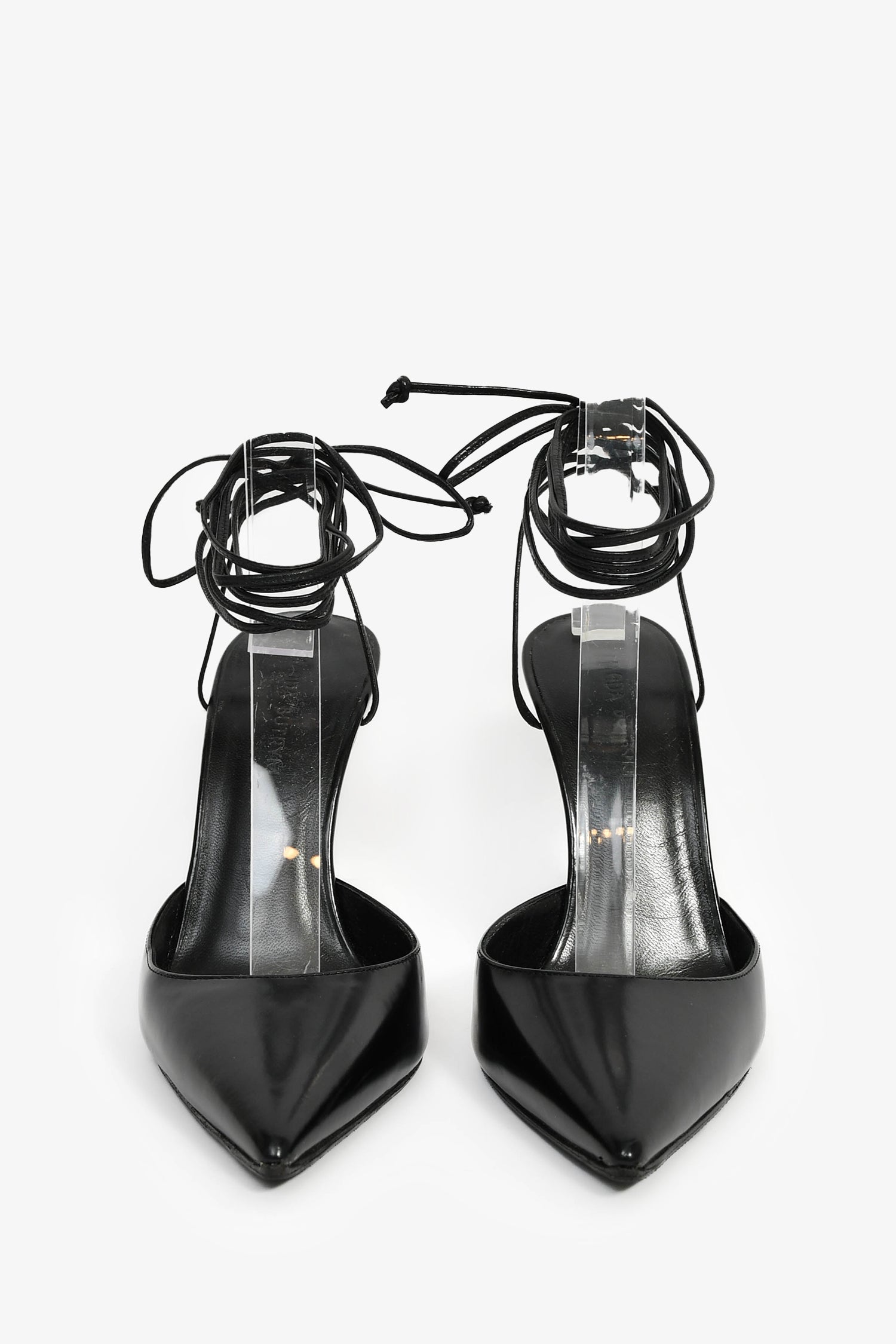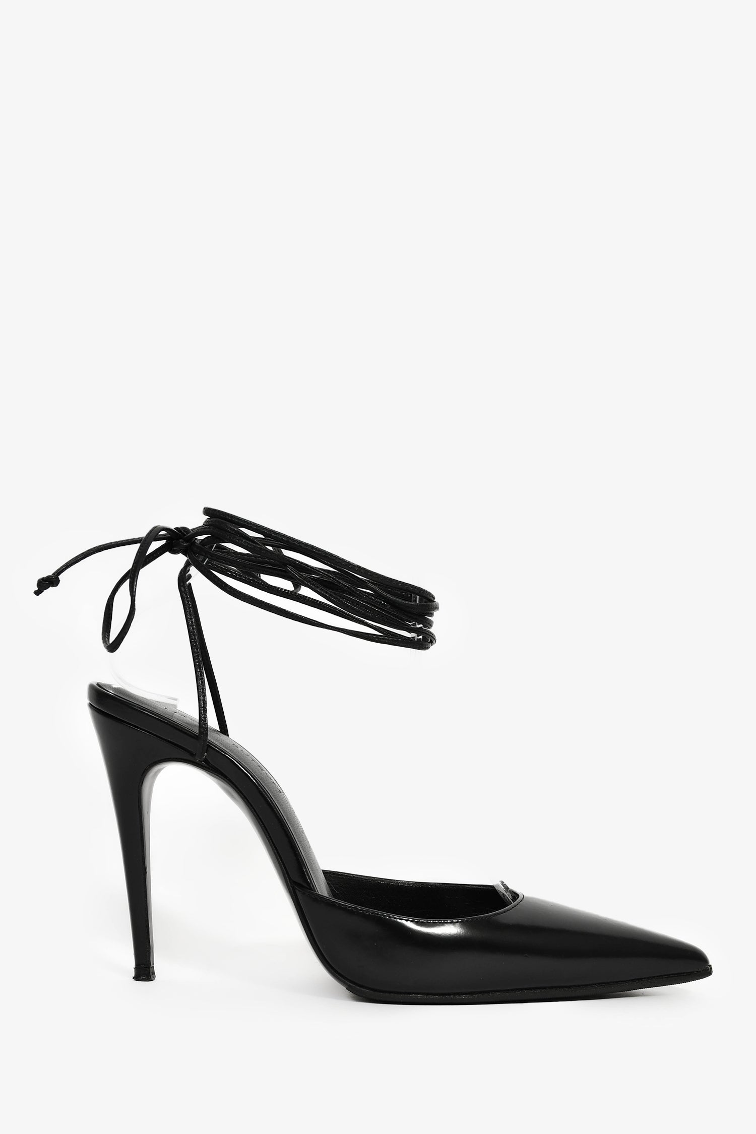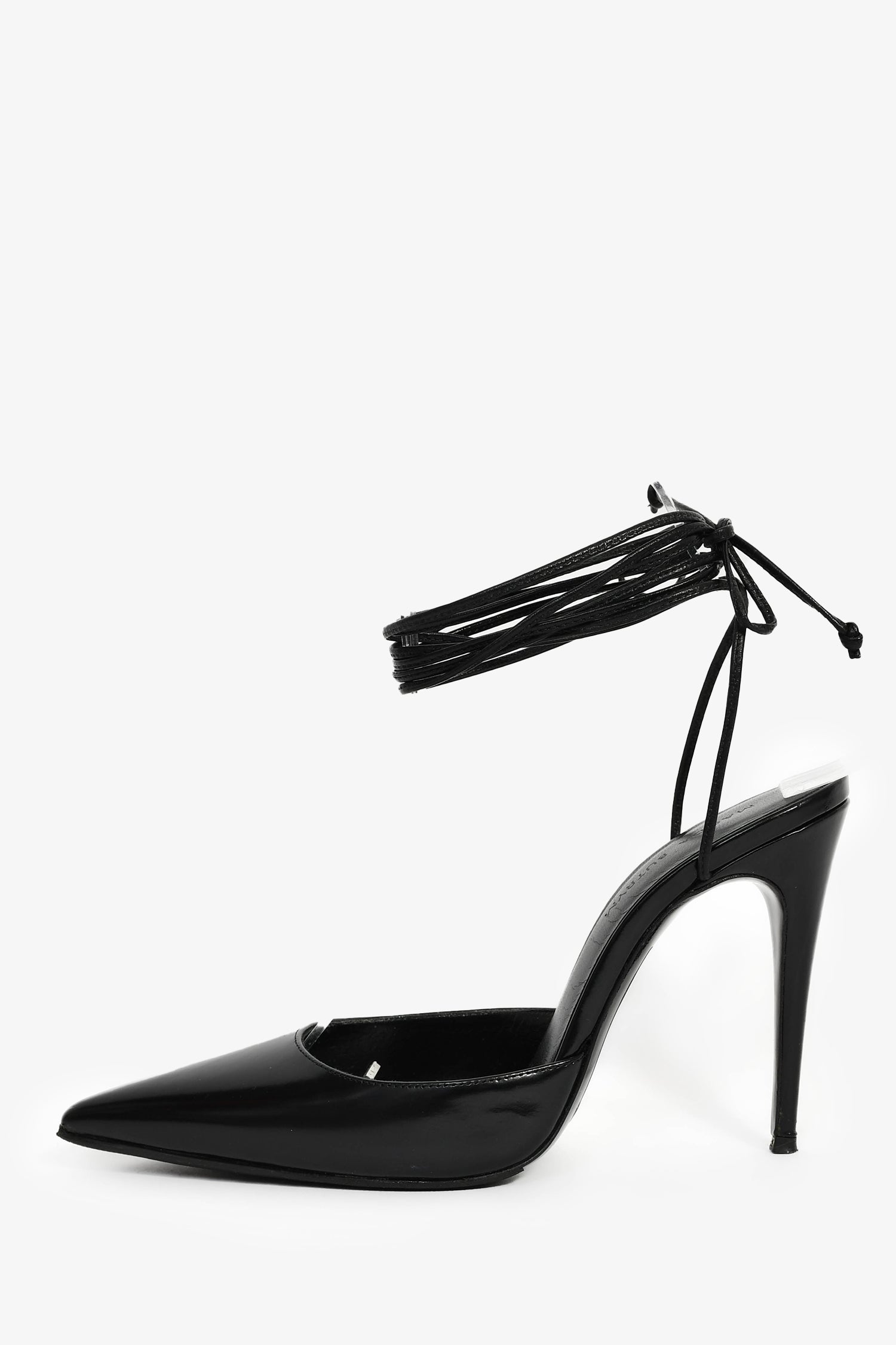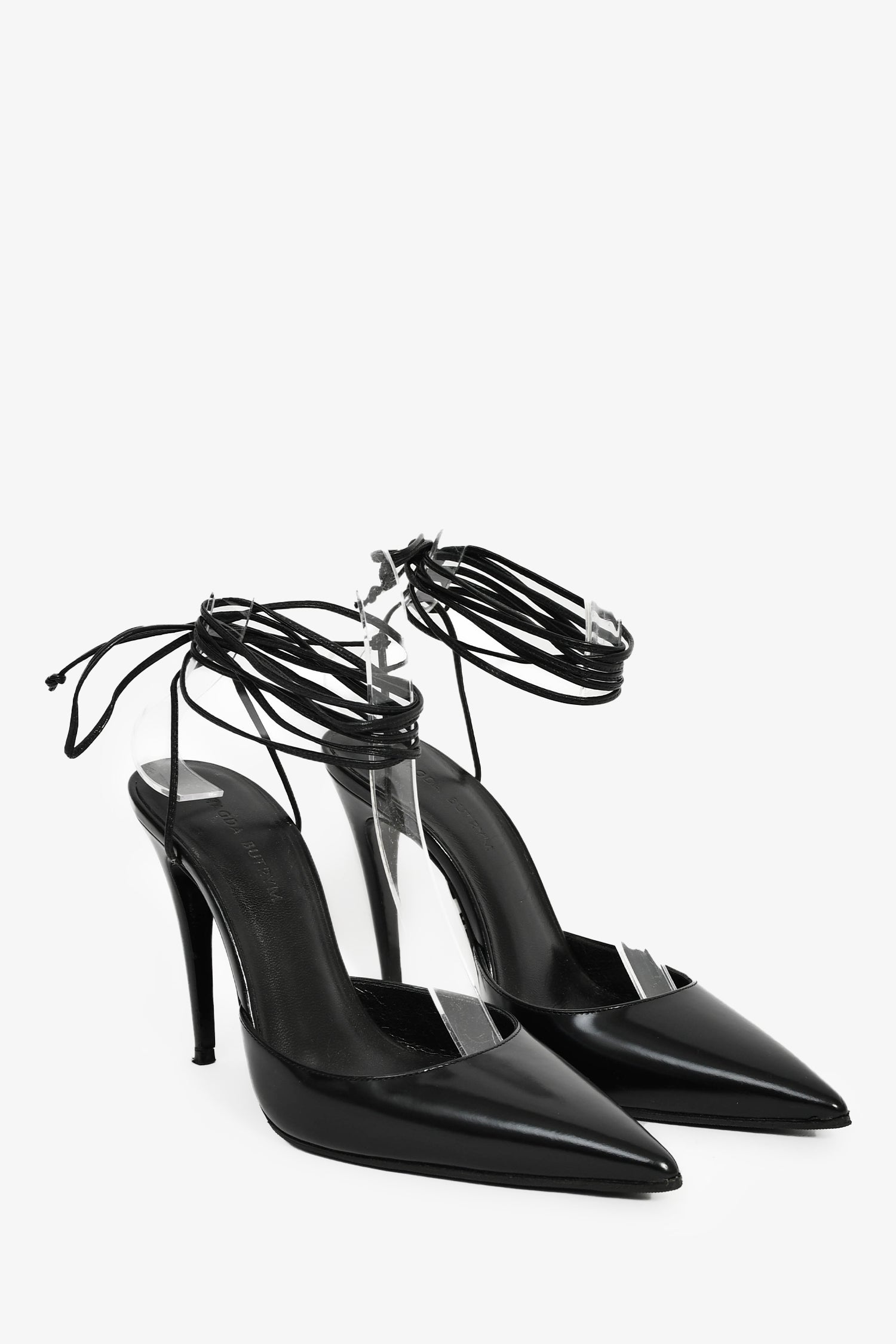 Magda Butrym Black Leather Pointed Toe Ankle Wrap Heels. Slip-on. Pointed toe. Ankle lace-up closure. Leather insoles. Tonal stitching.