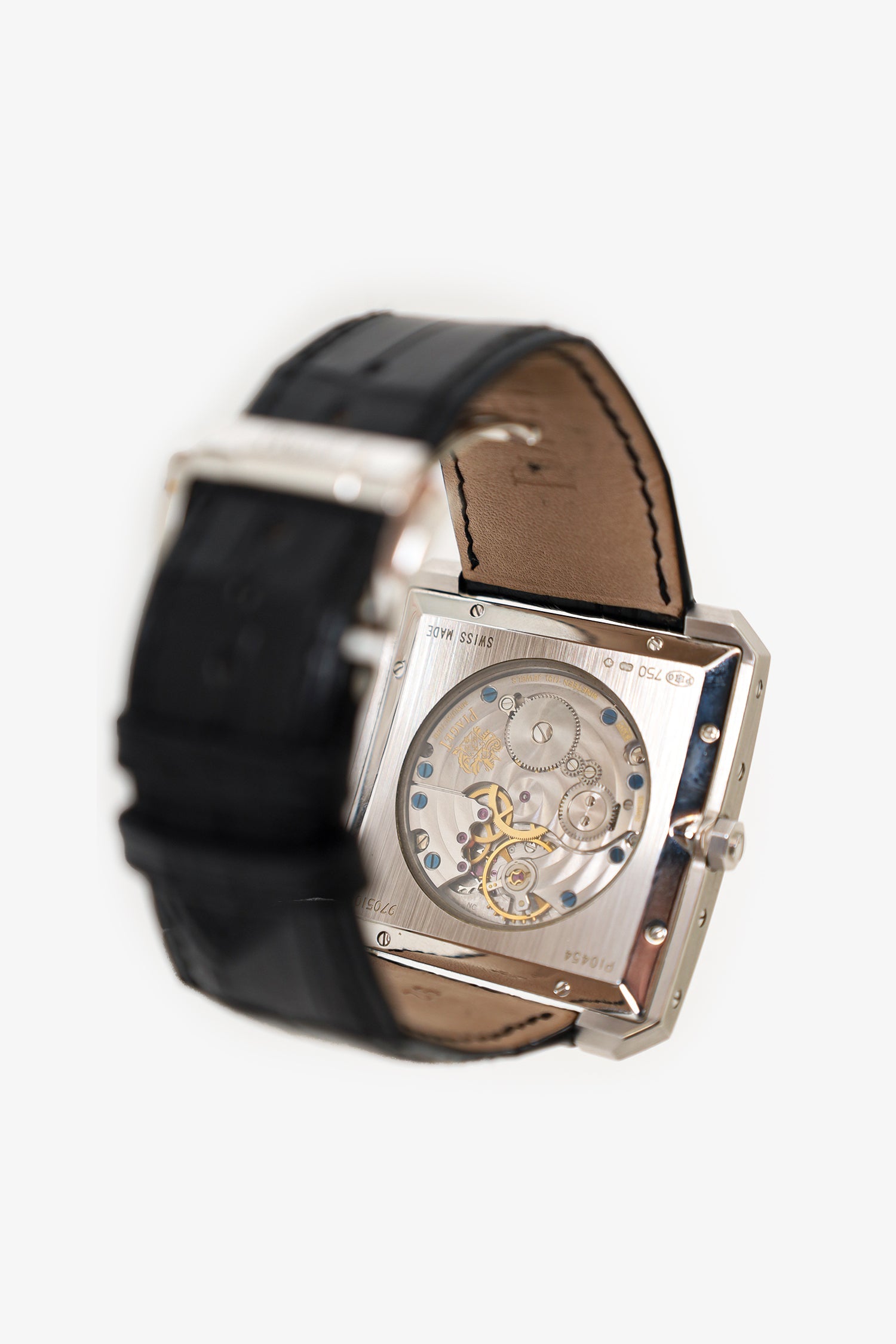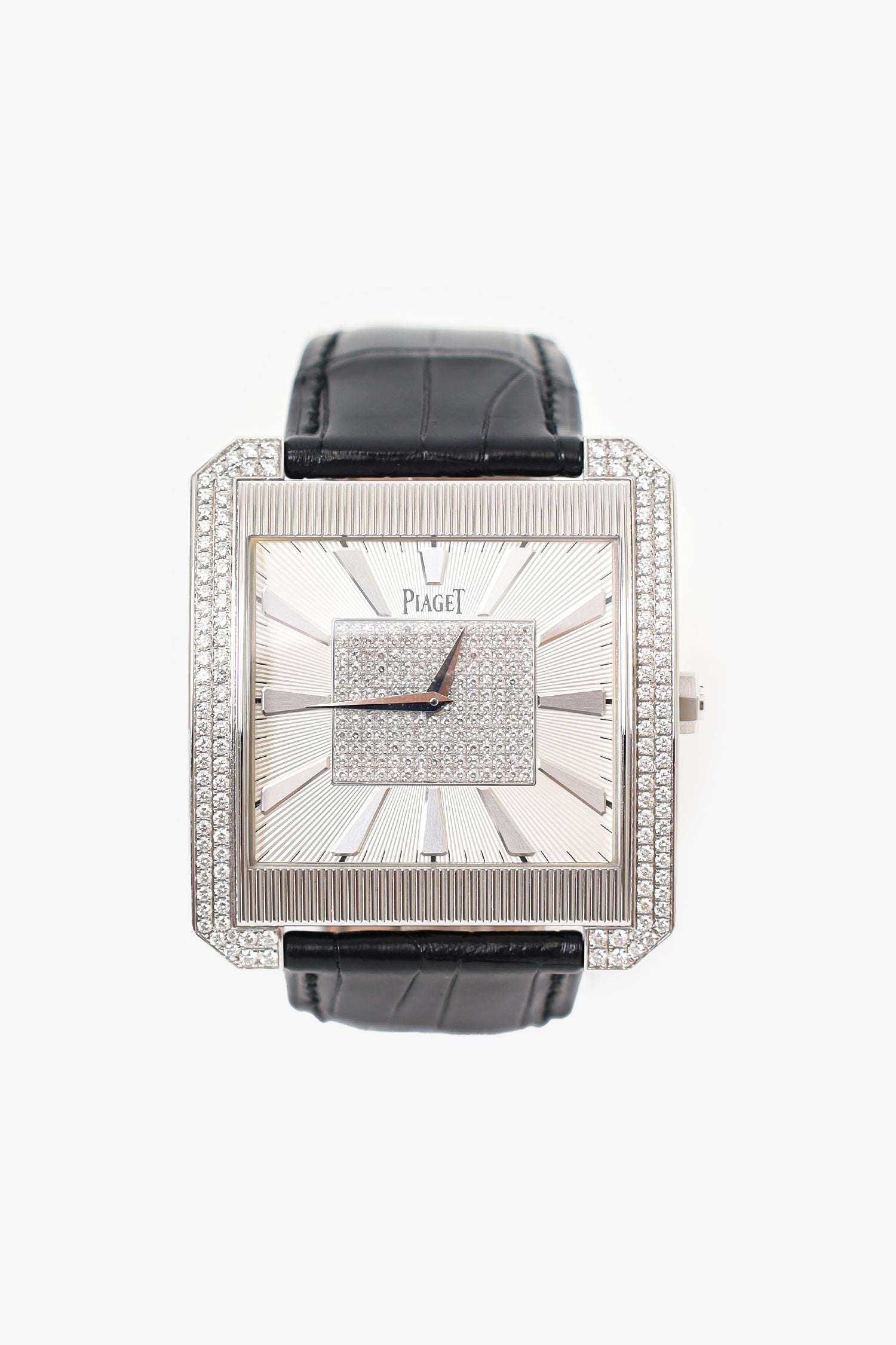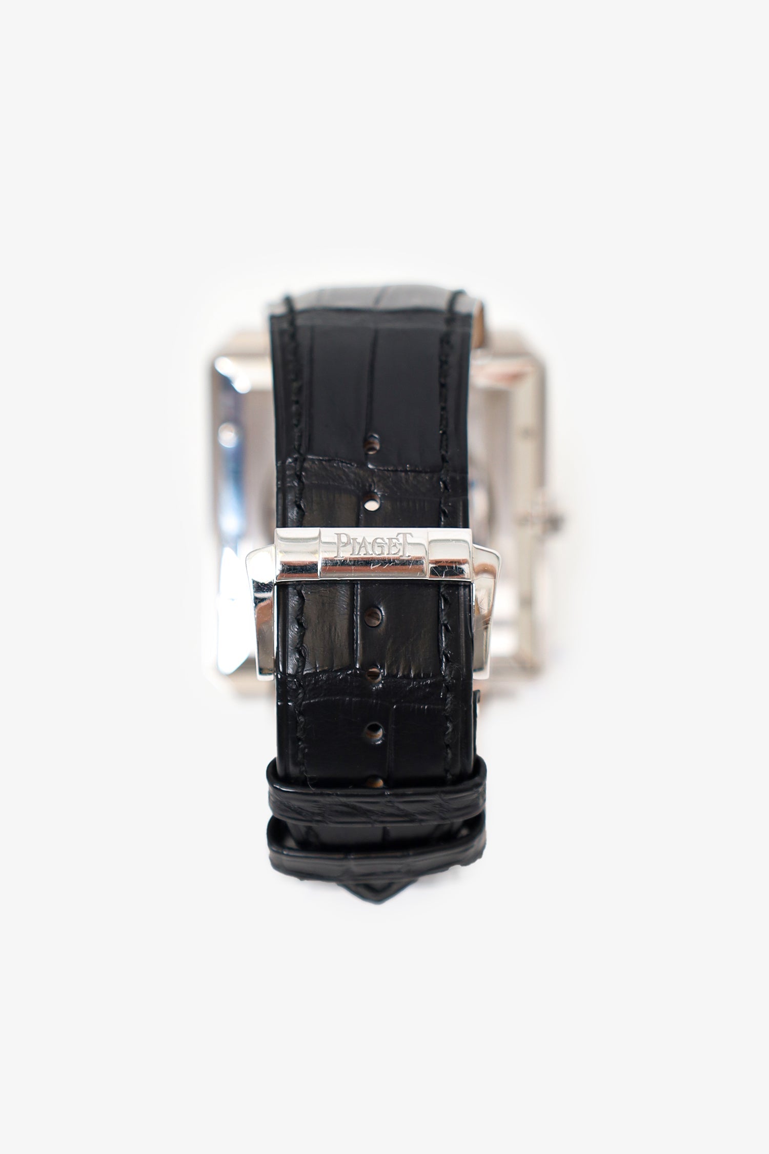 Piaget 18K White Gold Diamond Black Tie Manual Winding Crocodile Leather Strap Watch. Leather strap with folding clasp closure. Silver-tone hardware. Tonal stitching.