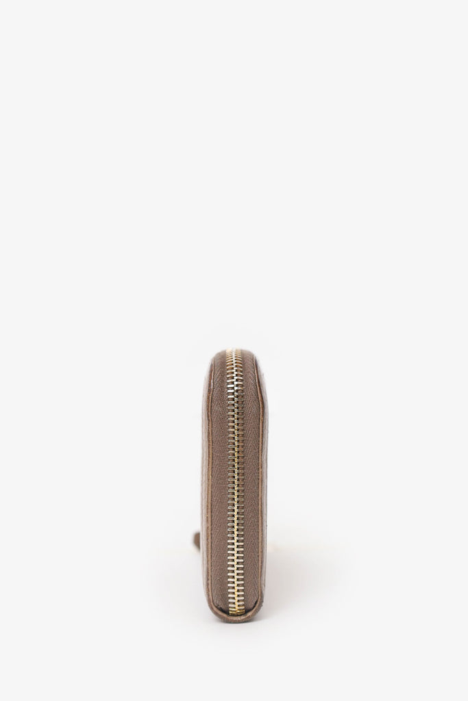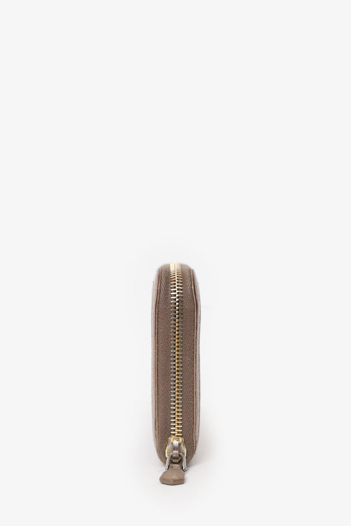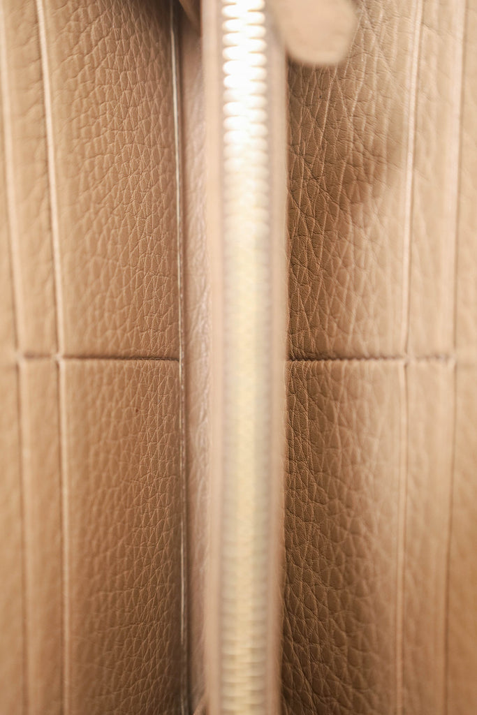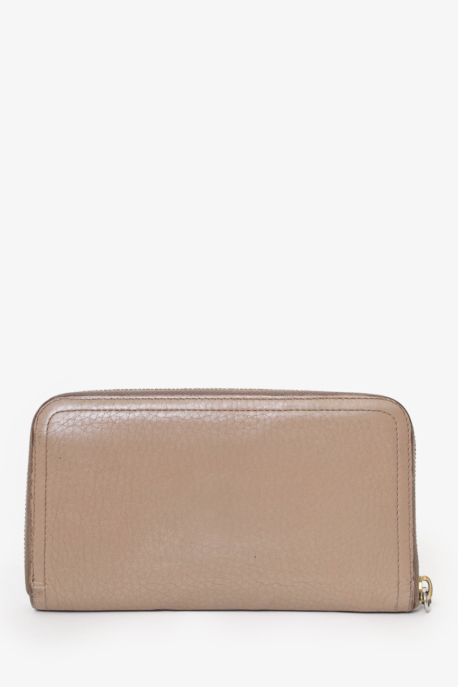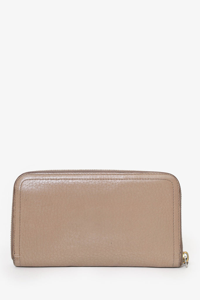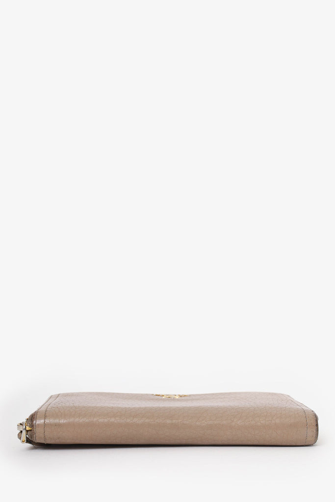 Prada Beige Leather Continental Wallet. Top zip closure. Lined interior with 13 pockets; 8 card, 2 slip, 2 bill, and 1 zip. Gold-tone hardware. Tonal stitching.