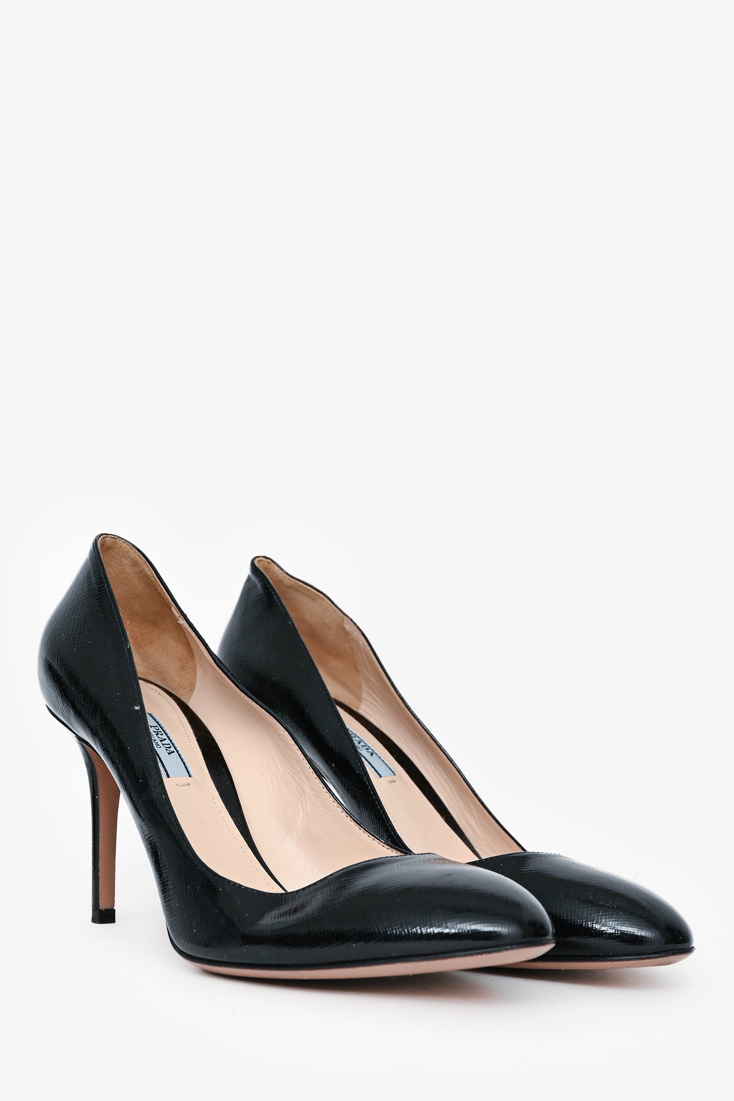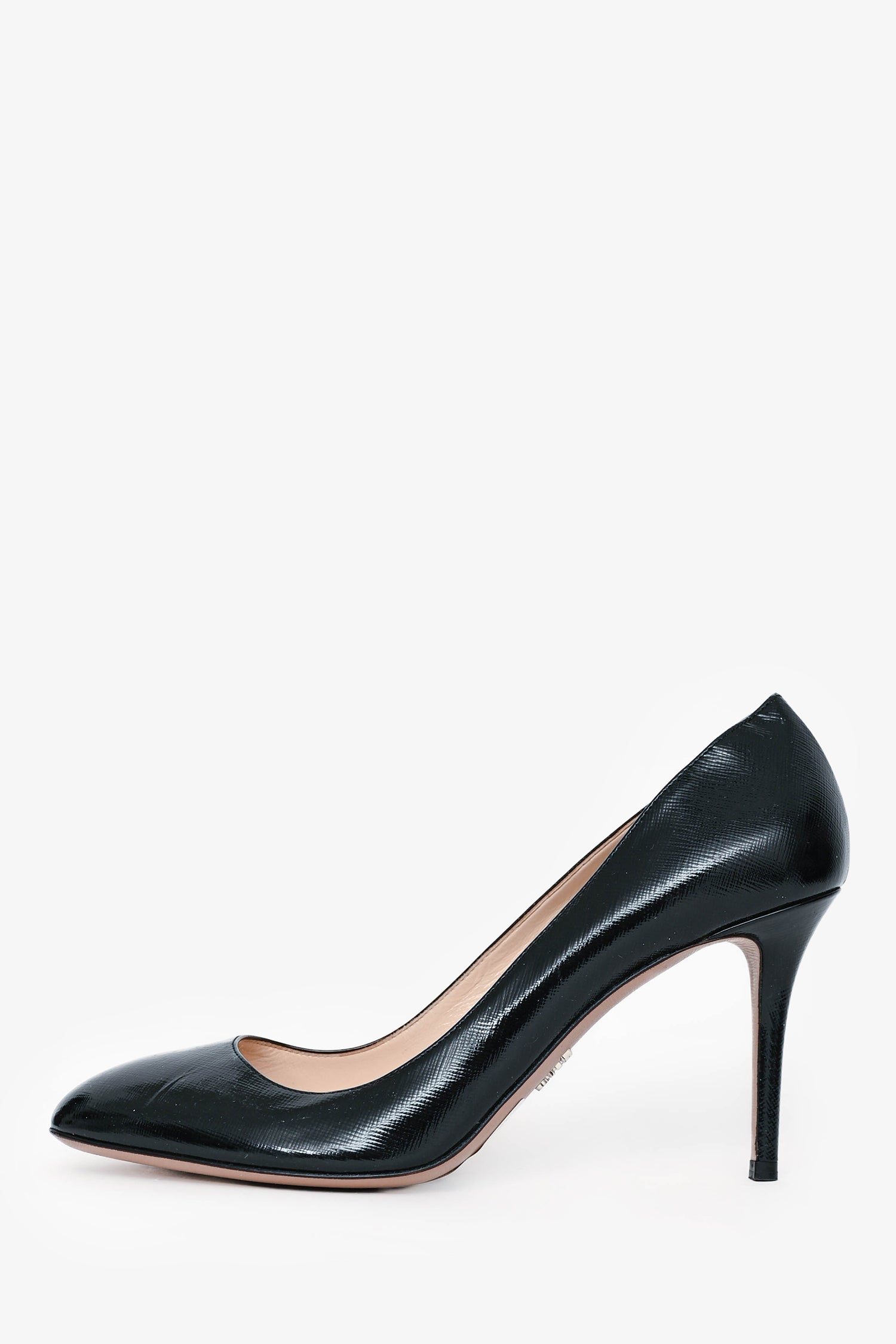 Prada Black Coated Saffiano Leather Pump Heels. Slip-on. Pointed toe. Leather lining and insole. Stiletto heel. Silver-tone hardware. Tonal stitching.