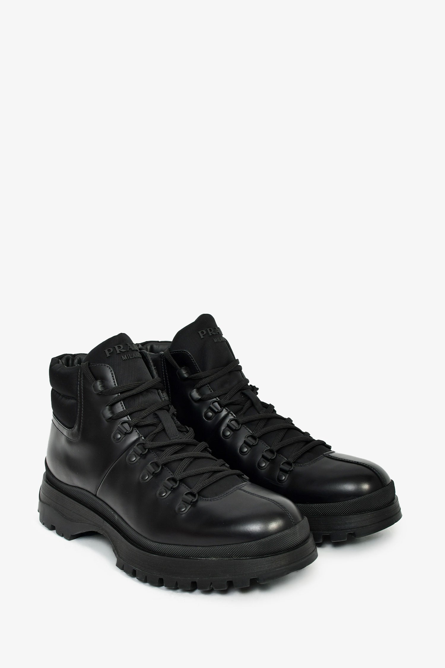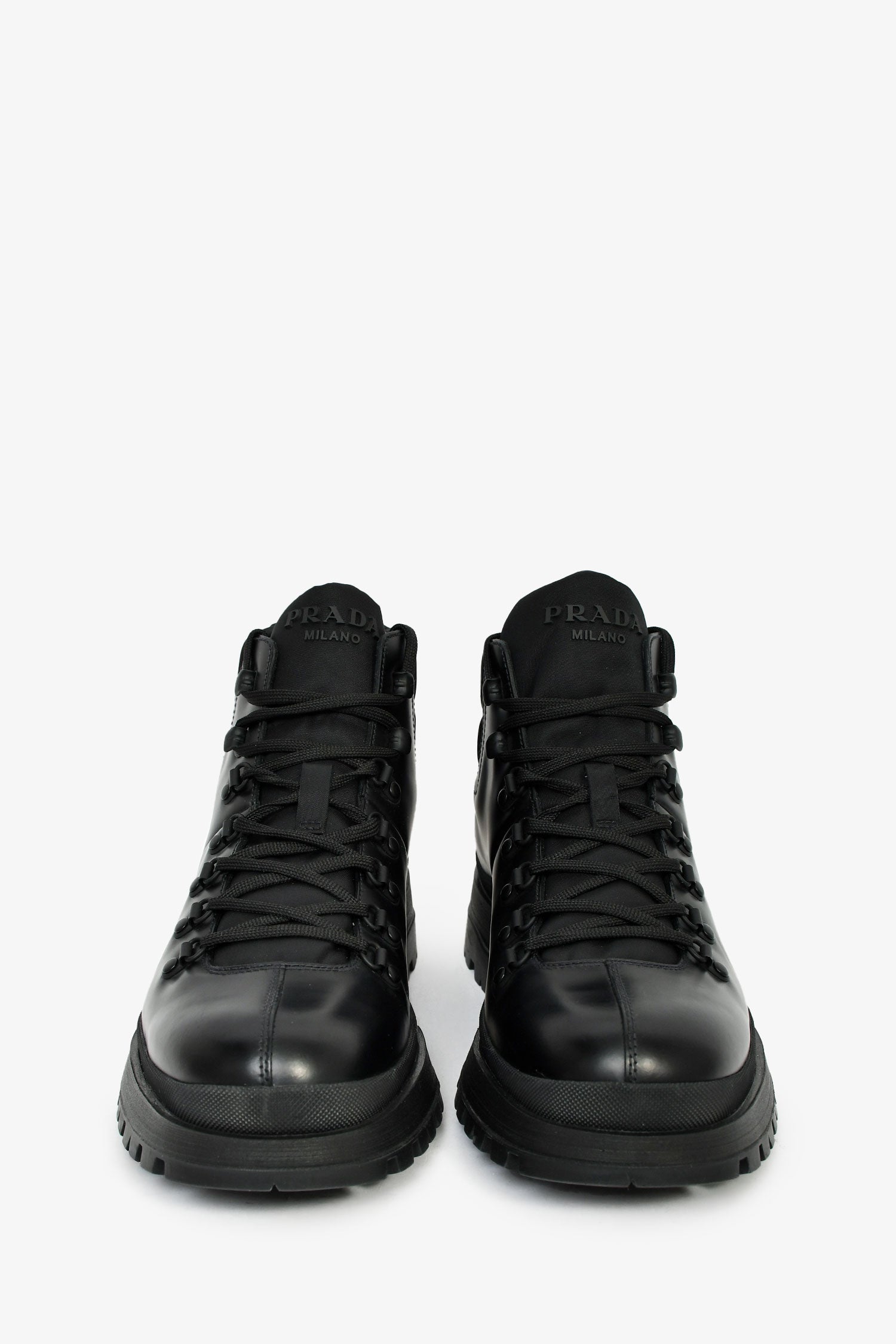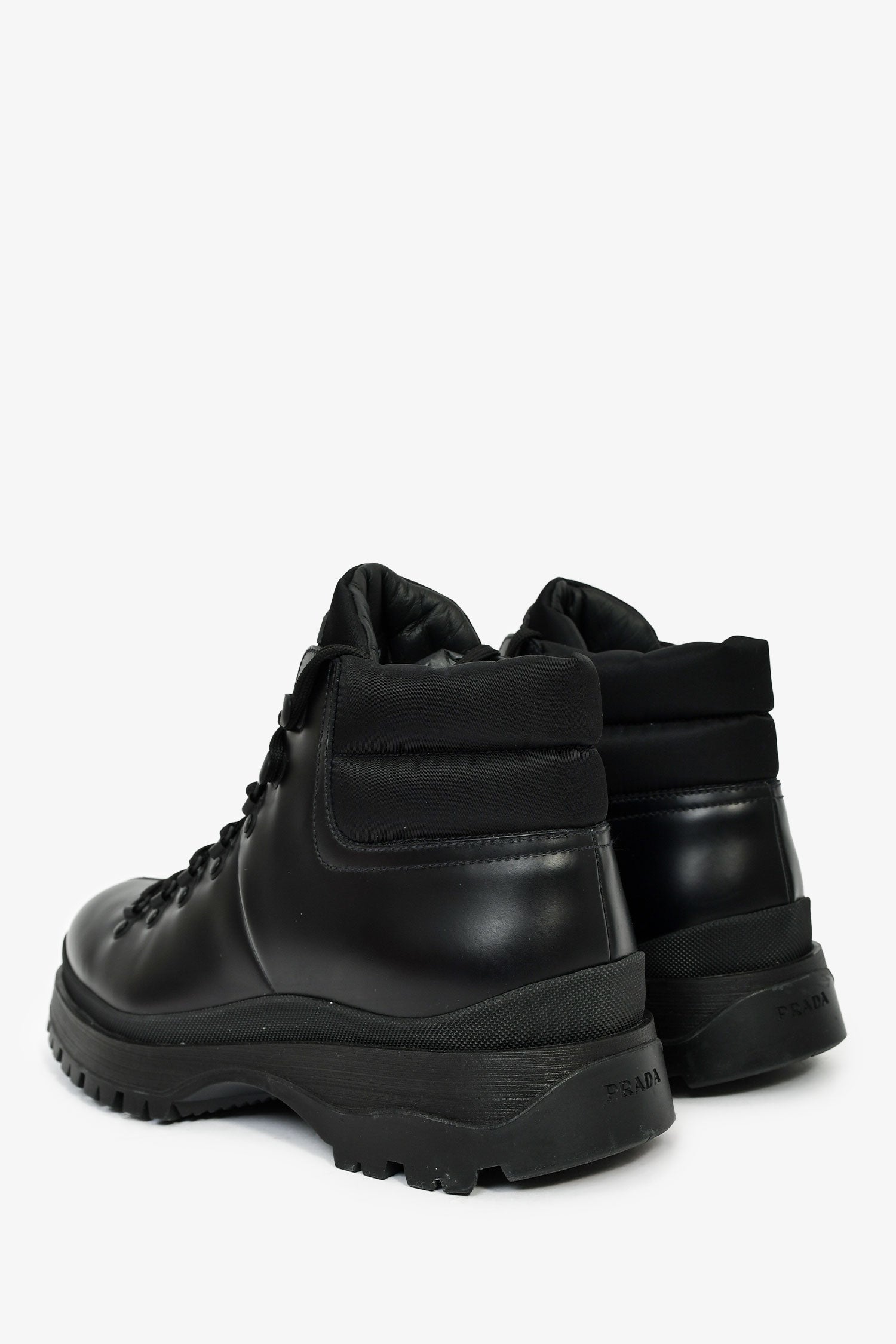 Prada Black Leather/Nylon Combat Logo Boots. Round toe. Front lace-up closure. Tonal stitching.