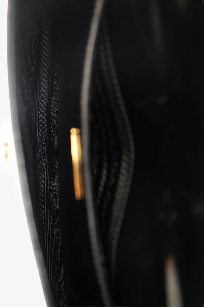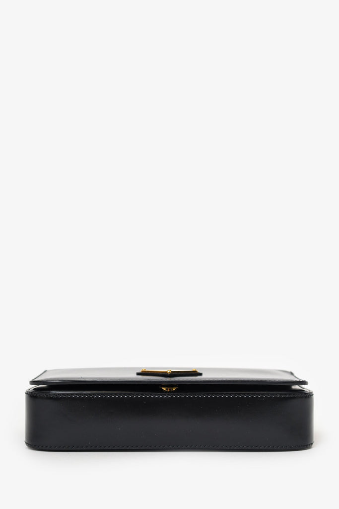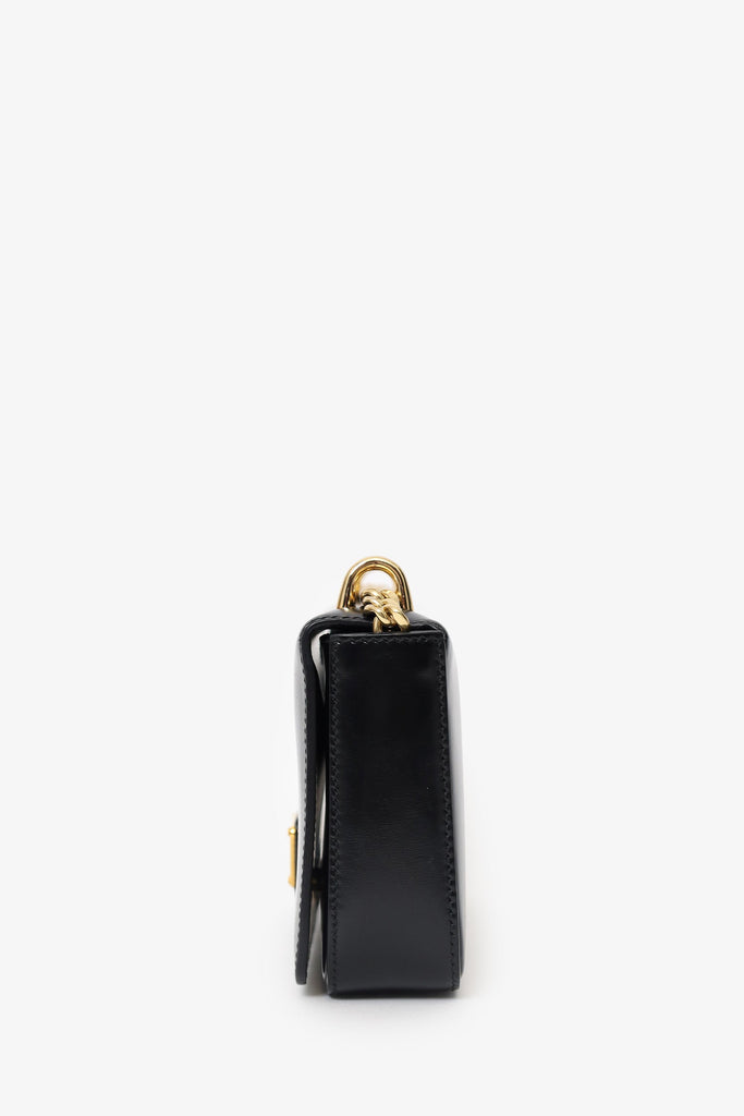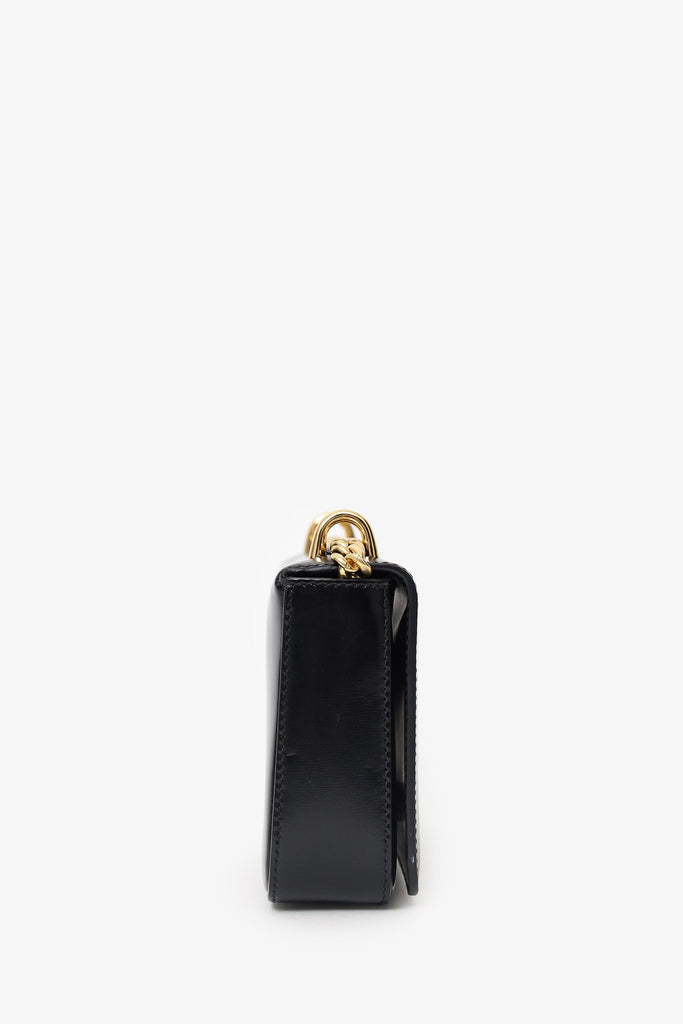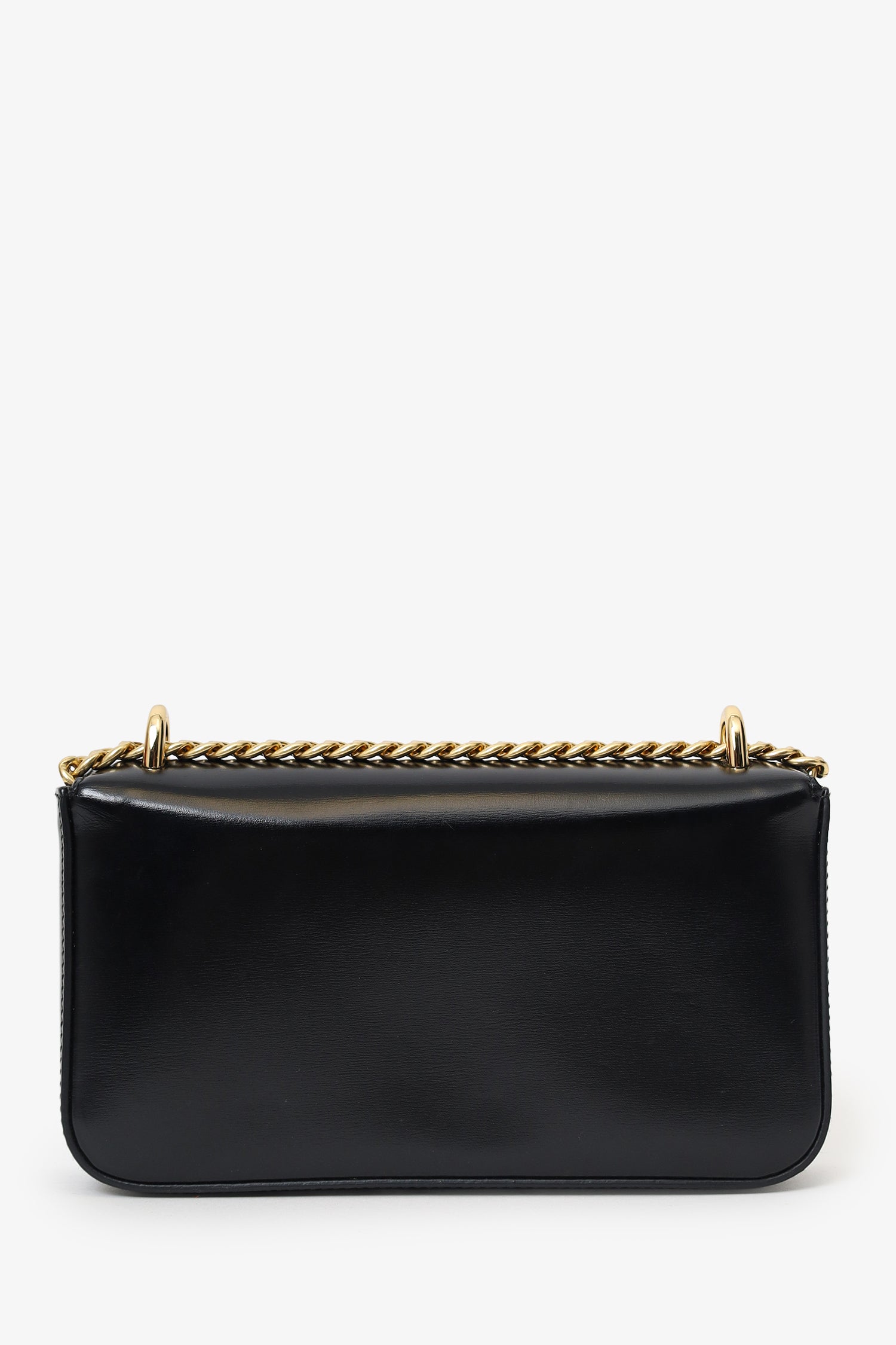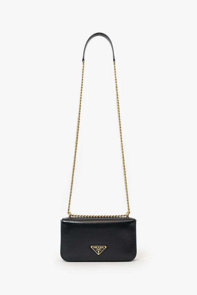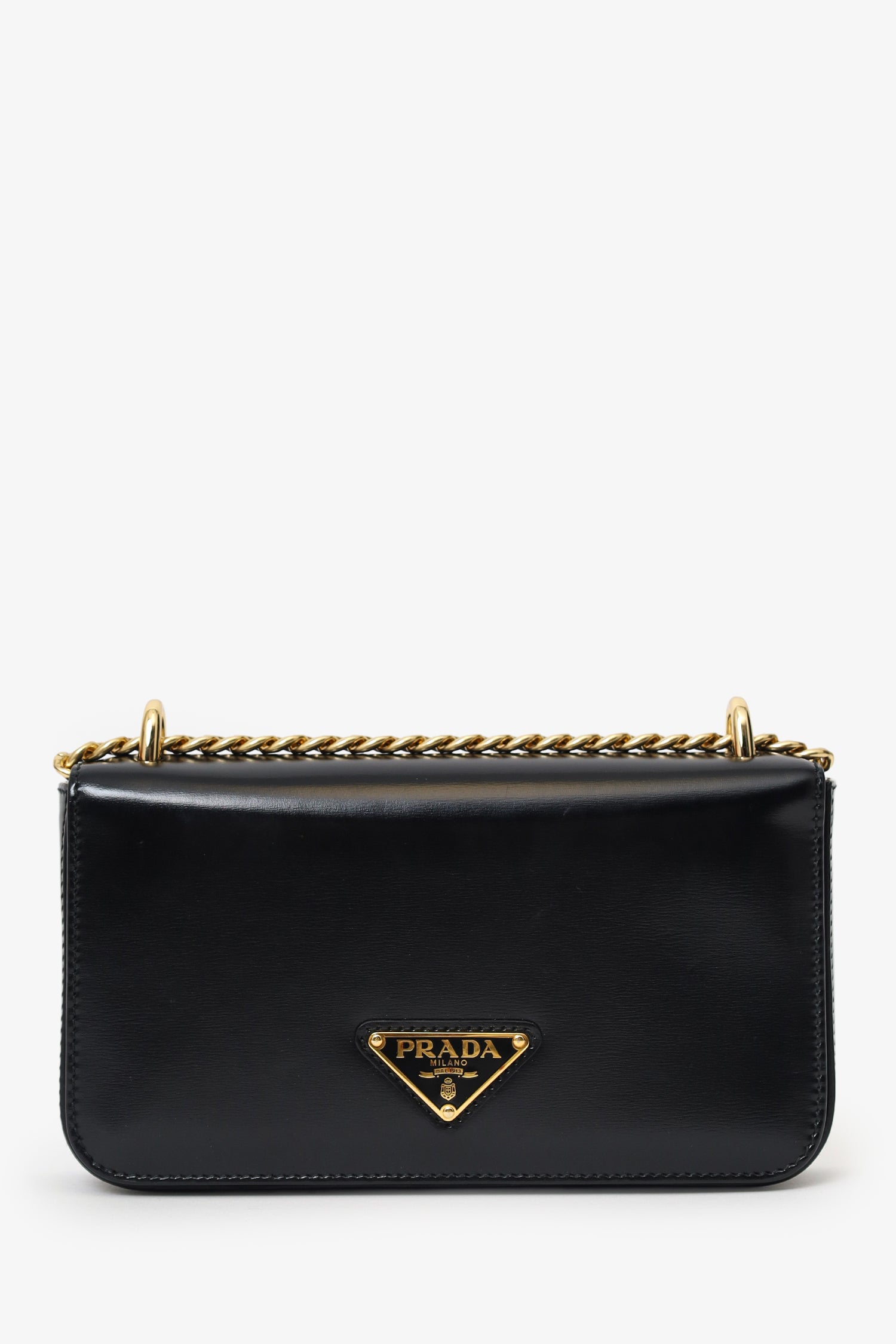 Prada Black Leather Triangle Logo Chain Shoulder Bag. Front fold-over flap with snap button-up closure. Chainlink shoulder strap. Lined interior with single slip pocket. Gold-tone hardware. Tonal stitching.