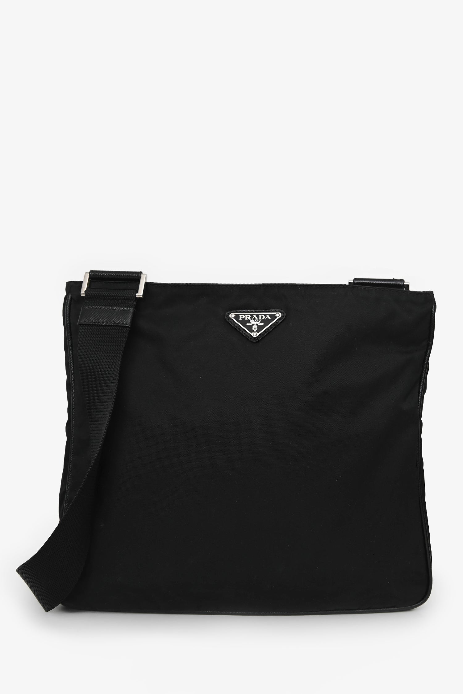 Prada Black Nylon Messenger Bag. Concealed zipper. Webbed crossbody strap. Lined interior with a zip pocket. Silver-tone hardware. Tonal stitching.