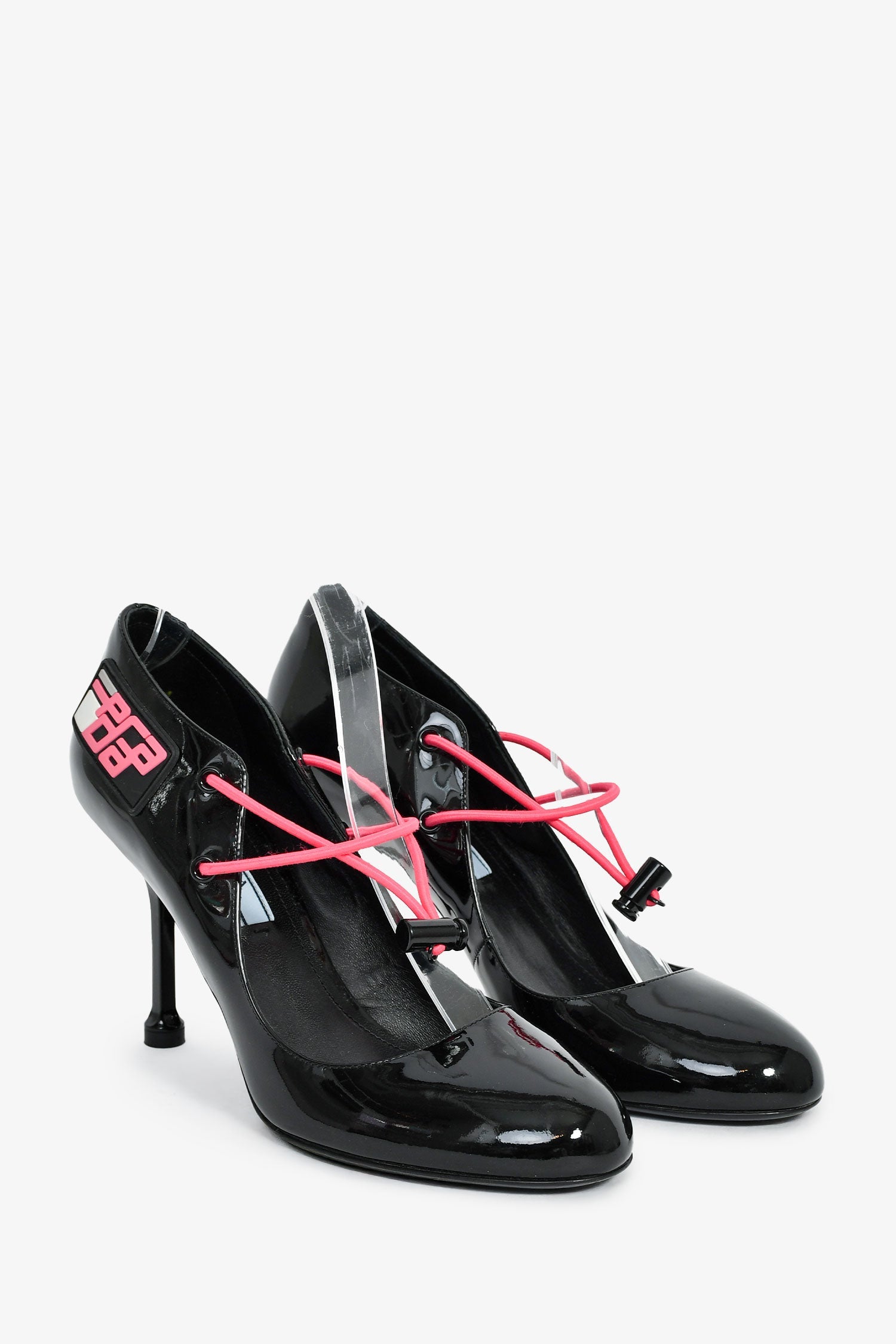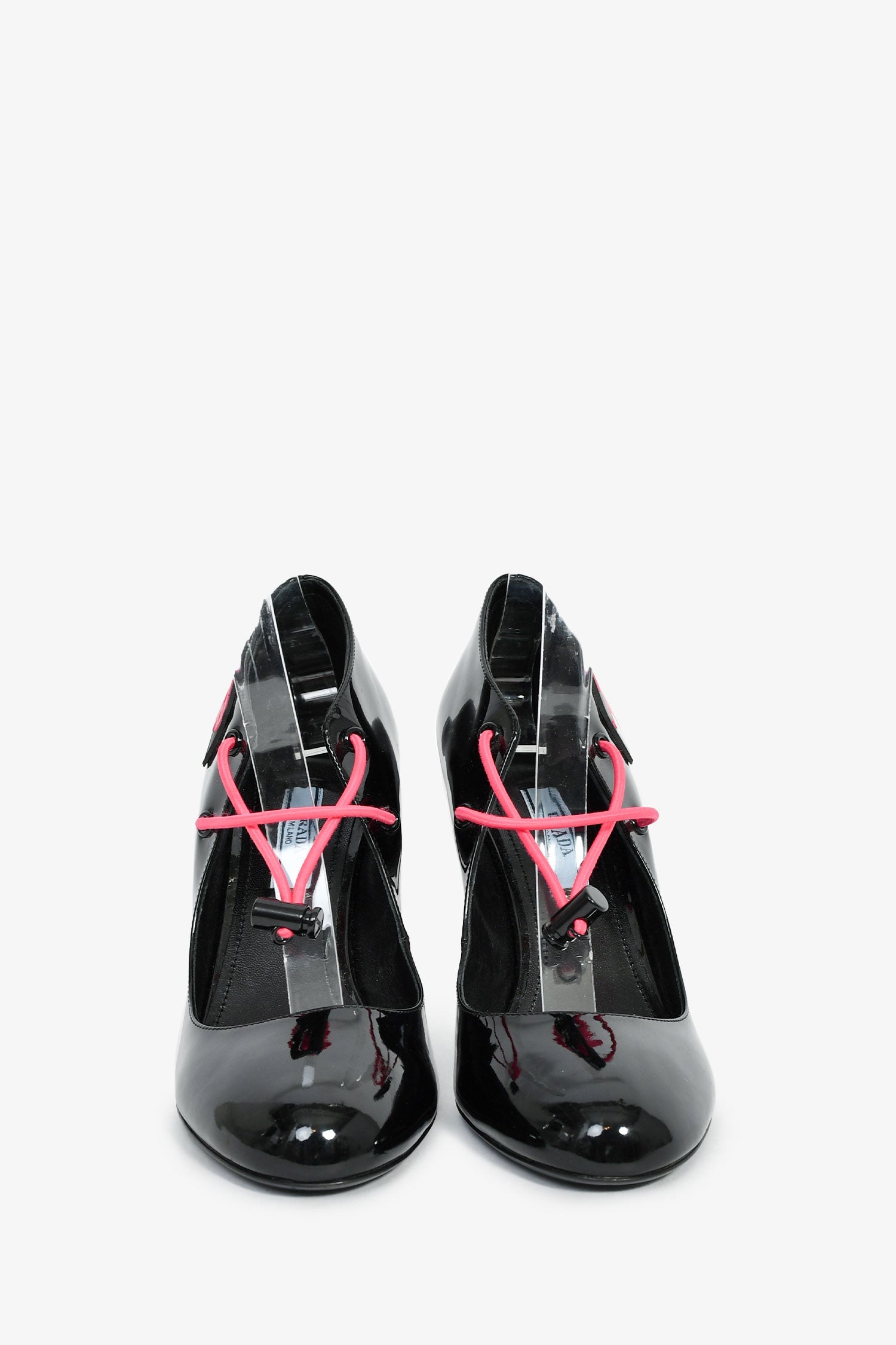 Prada Black Patent Pink Cord Mary Jane Heels. Slip-on. Round toe. Front elasticized drawstring closure. Tonal stitching.