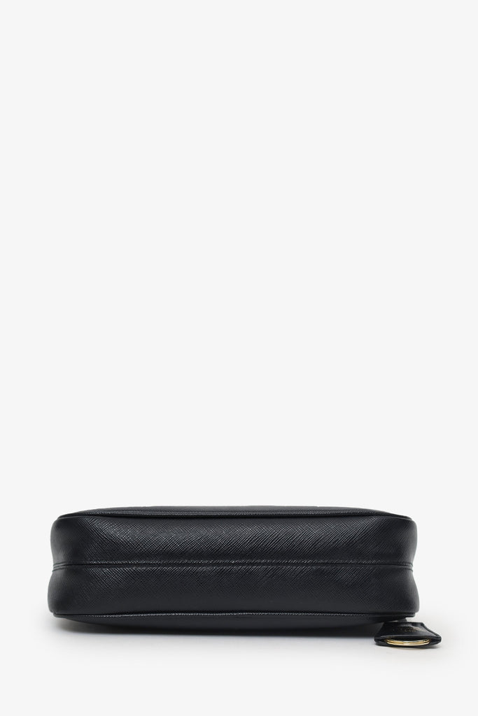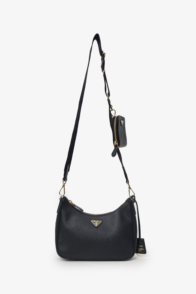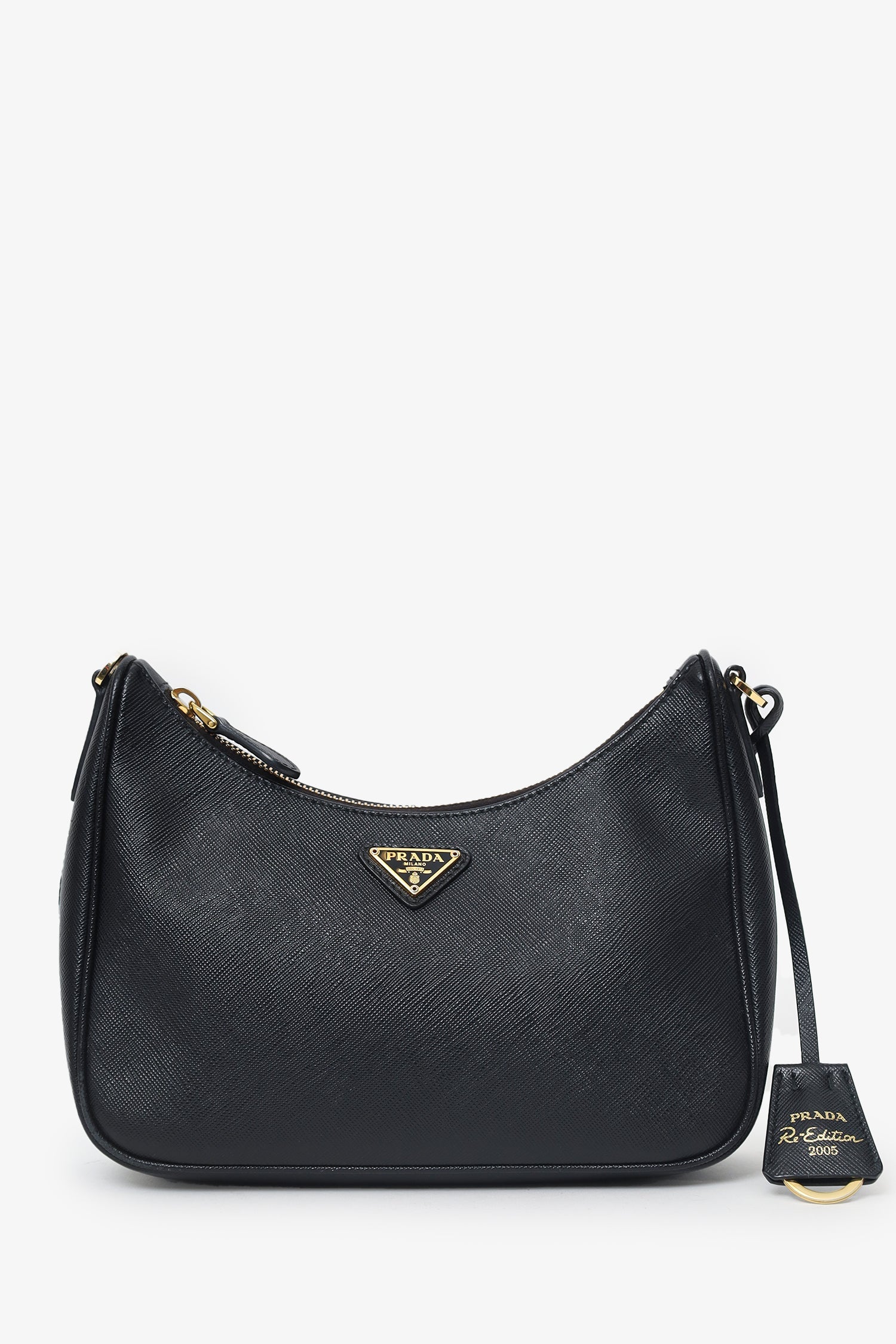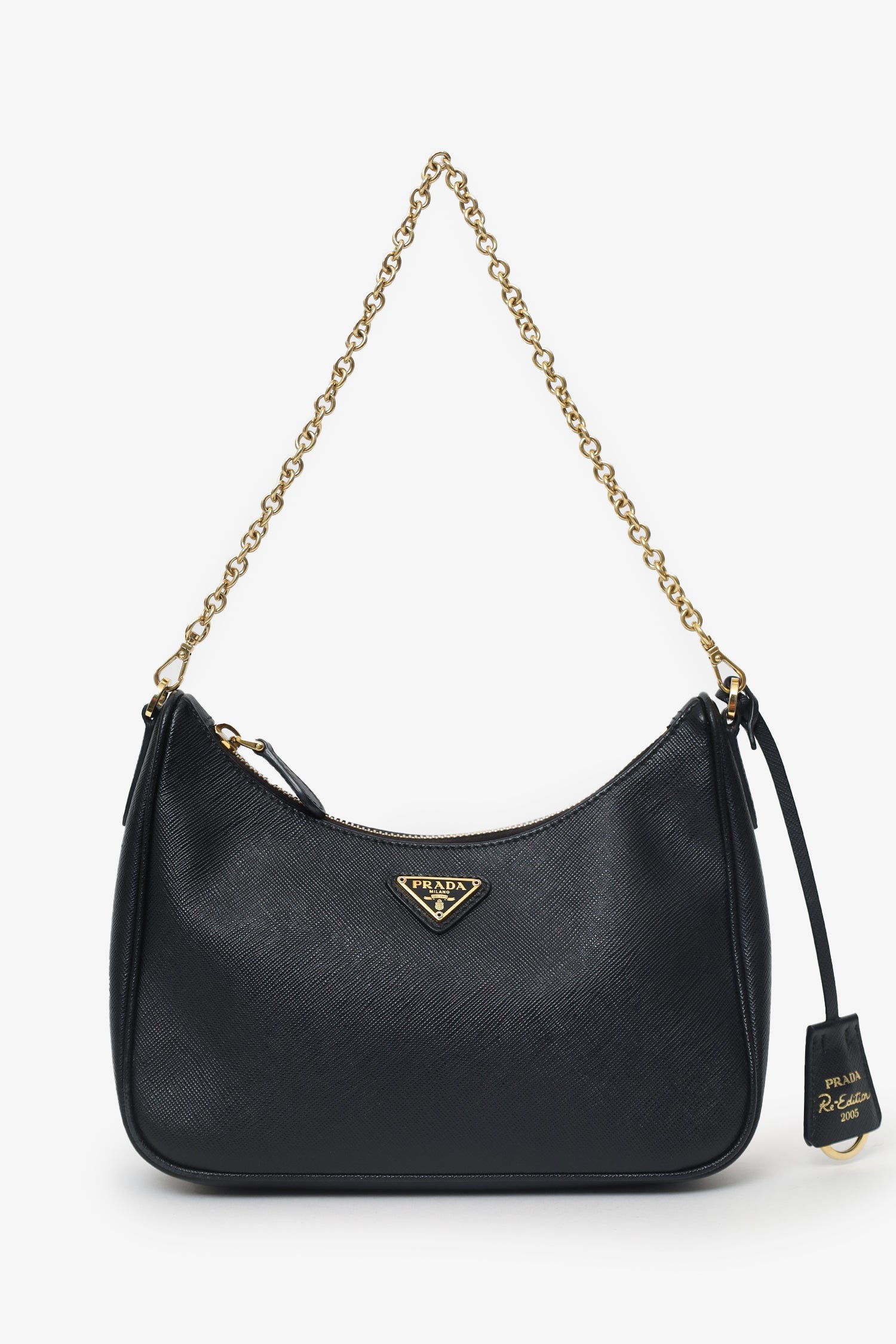Prada Black Saffiano Leather Re-Edition 2005 Shoulder Bag with Strap. Top zip closure. Single interior compartment. Detachable web strap and chain. Comes with a detachable zip pouch on strap. Textile-lined interior. Gold-tone hardware. Tonal stitching.
