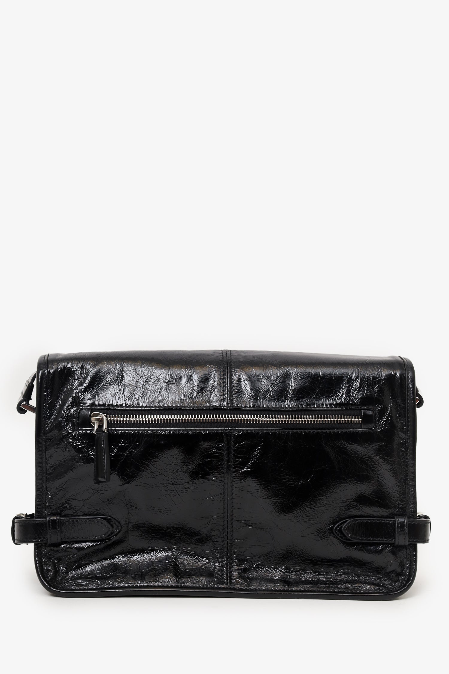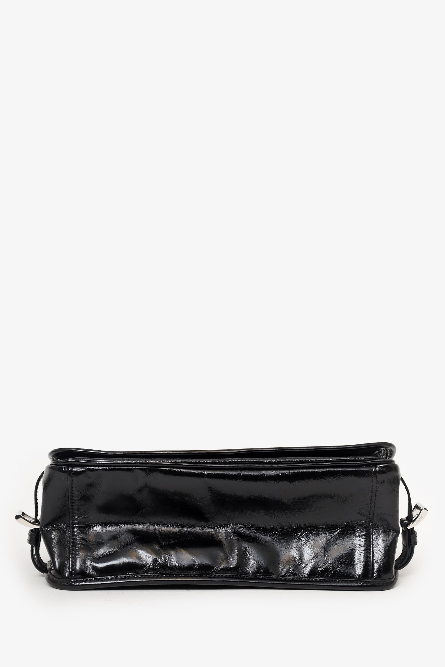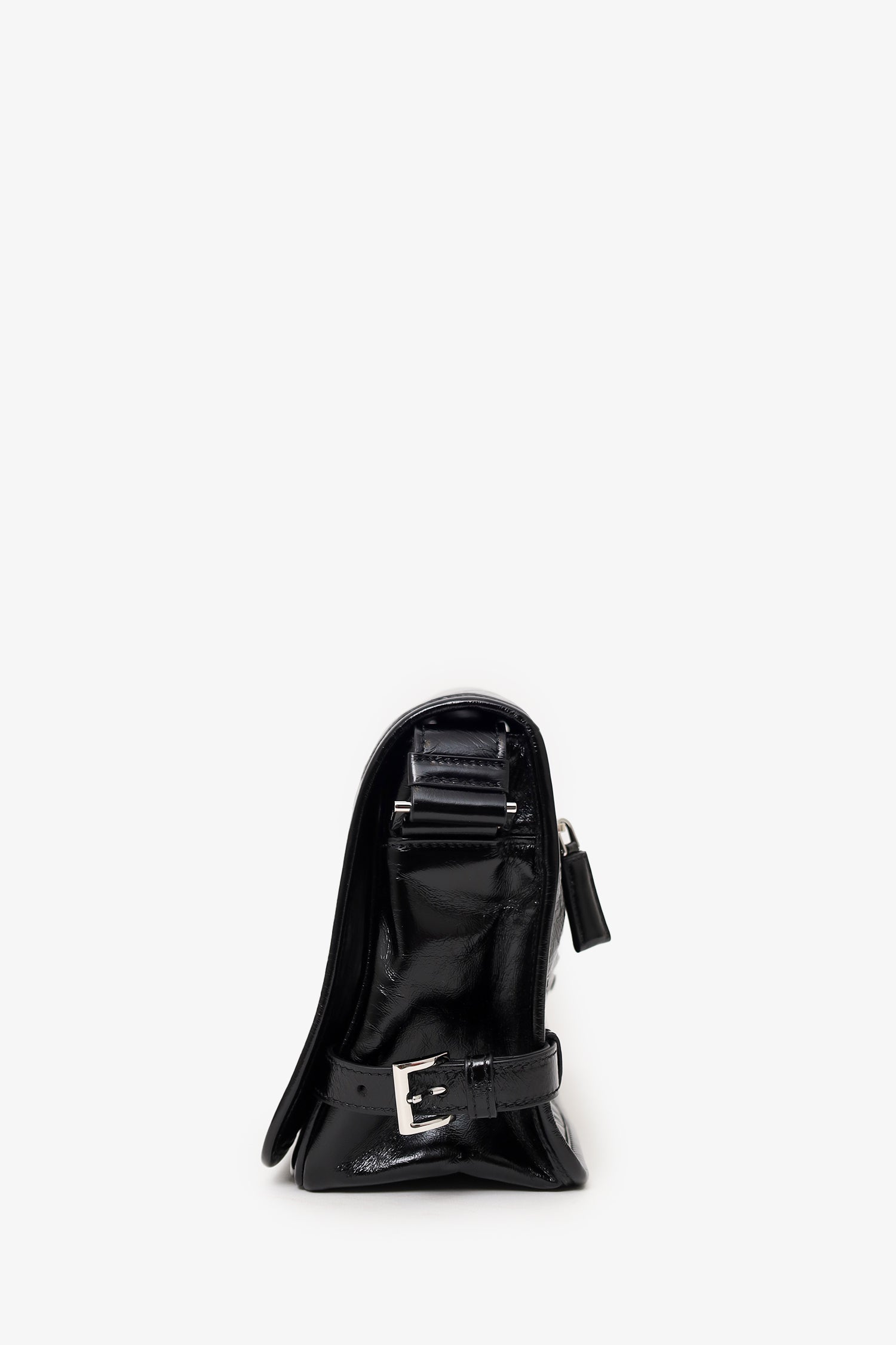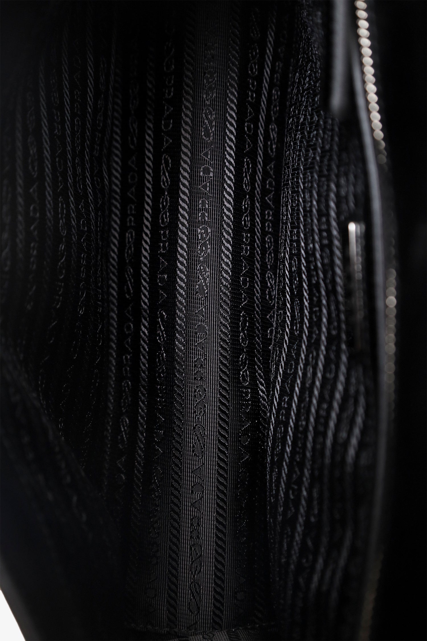 Prada Black Small Nappa Leather Duffle Bag. Front fold-over flap with magnetic closure. Shoulder strap with adjustable buckle closure. Rear exterior zip pocket. Straps with adjustable buckle closure on sides of bag. Lined-interior. Single interior pocket. Silver-tone hardware. Tonal stitching.
