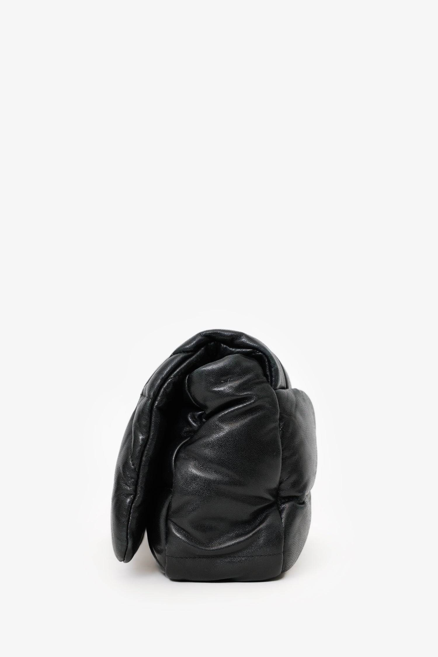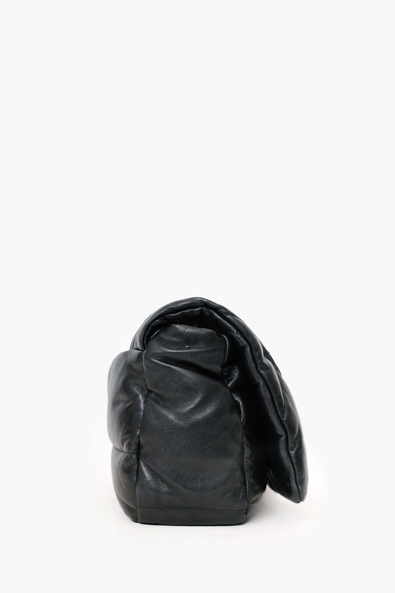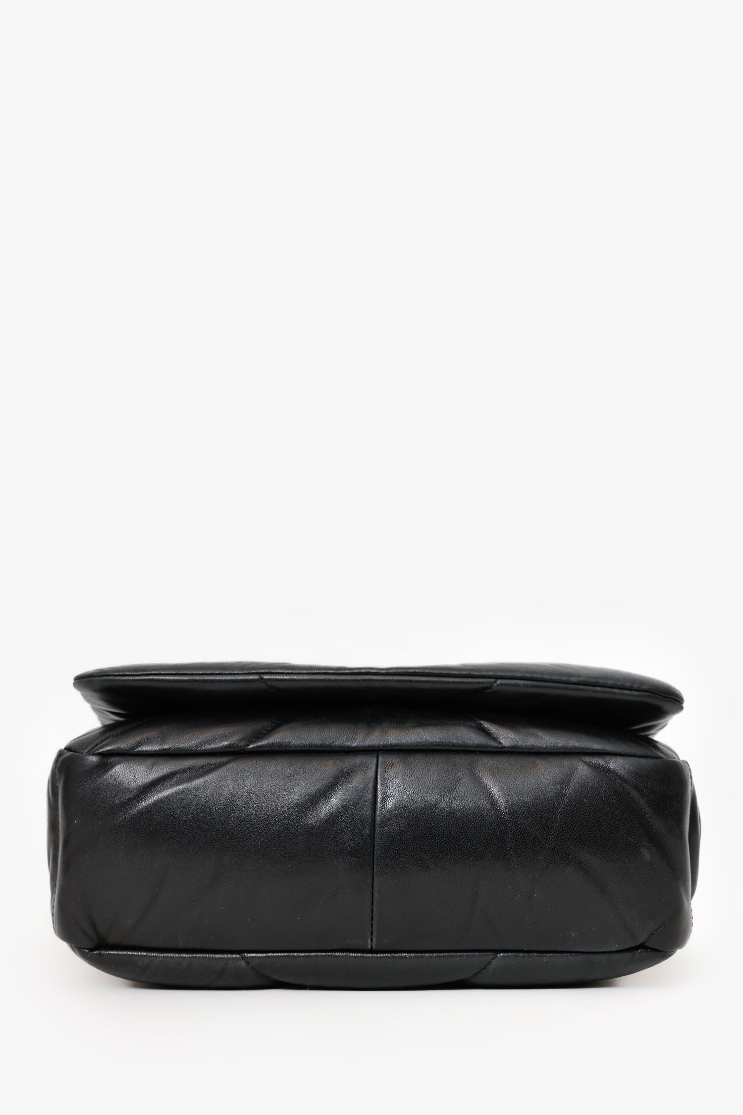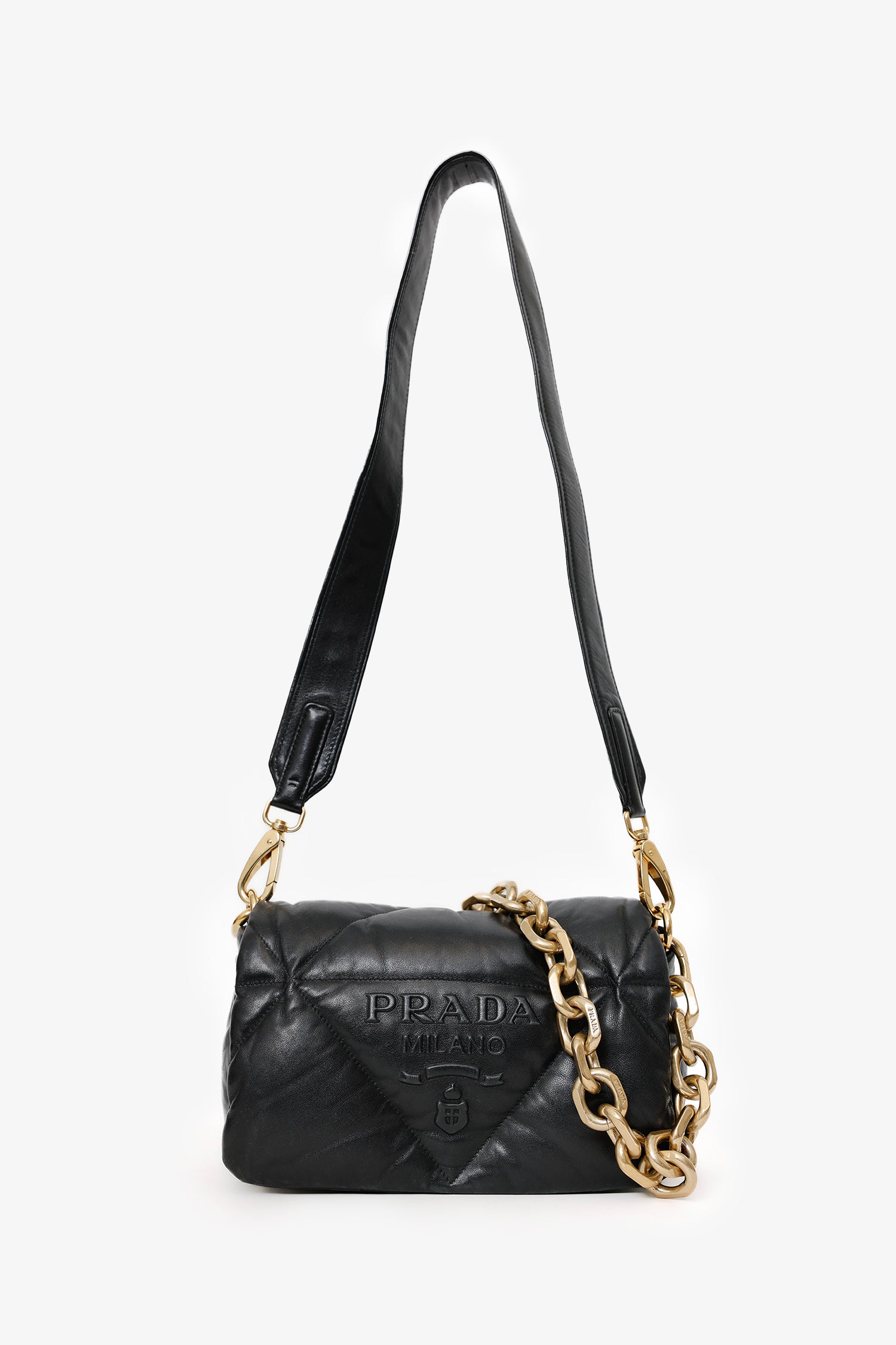 Prada Black Soft Quilted Padded Leather Medium Patchwork System Flap Shoulder Bag. Front fold-over flap with snap-button up closure. Chain link shoulder strap. Removable leather shoulder strap with clasp closure. Single exterior rear snap-button-up pocket. Leather-lined interior with 2 pockets; 1 slip, and 1 zip-up. Gold-tone hardware. Tonal stitching.