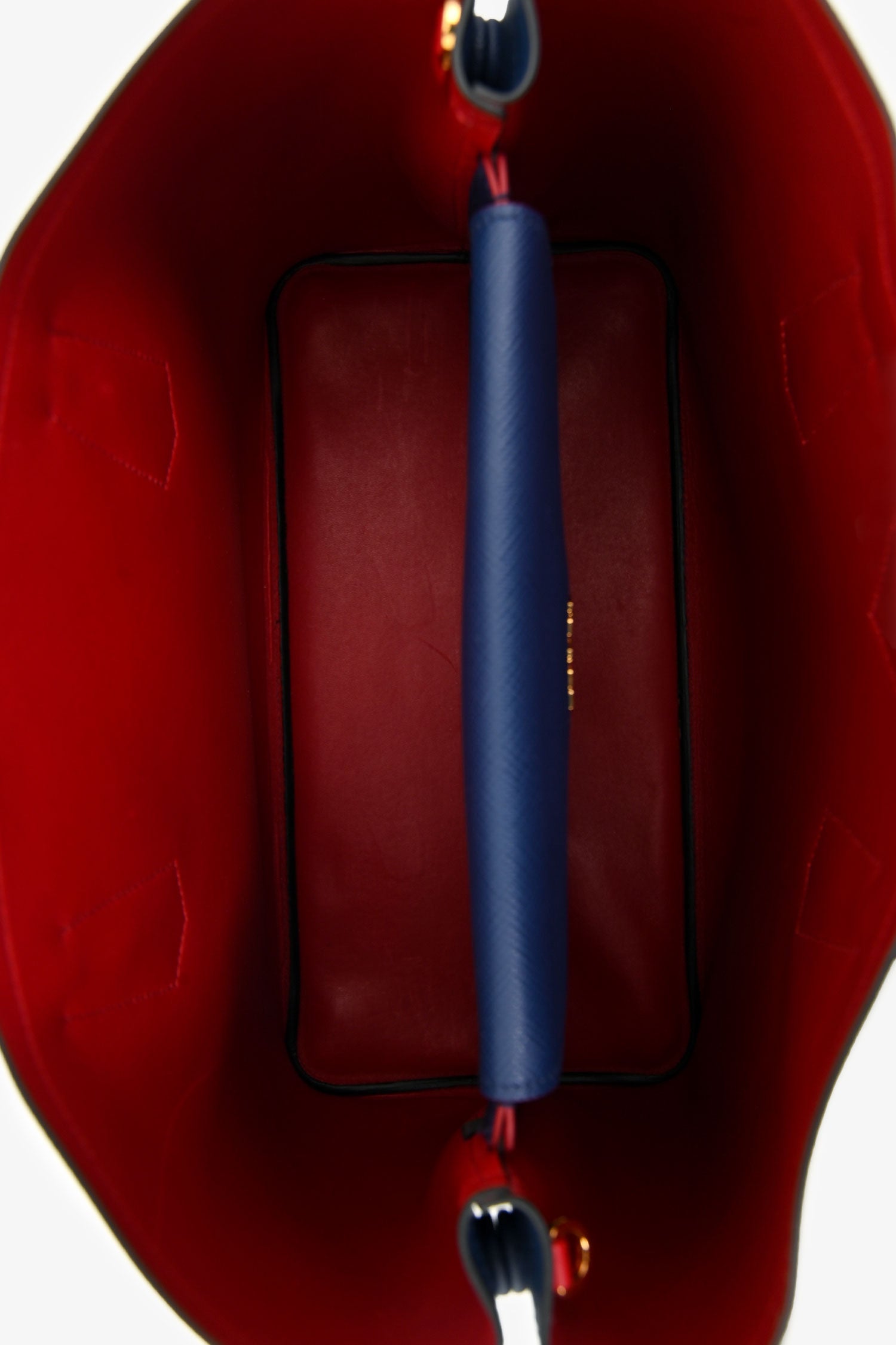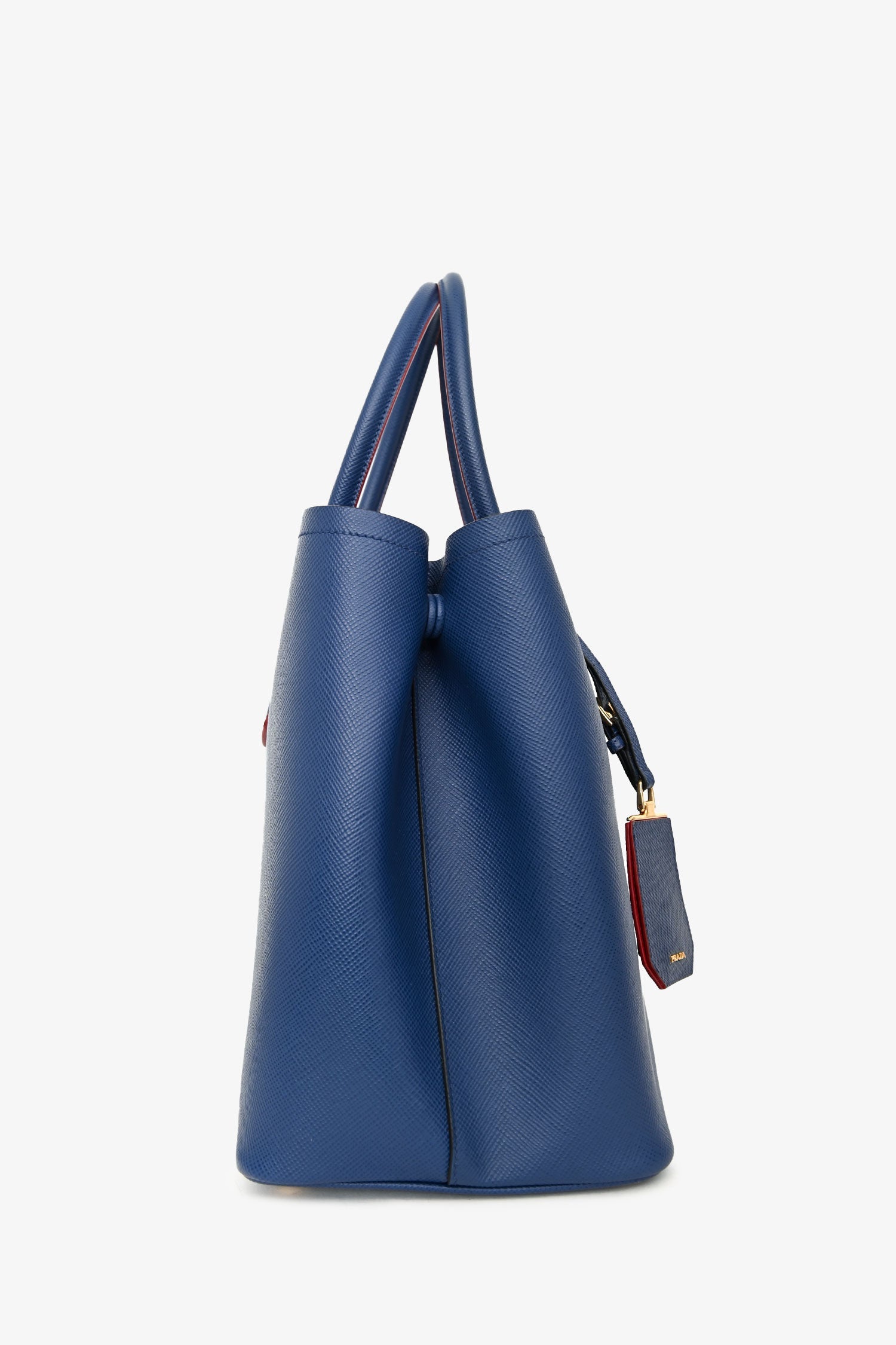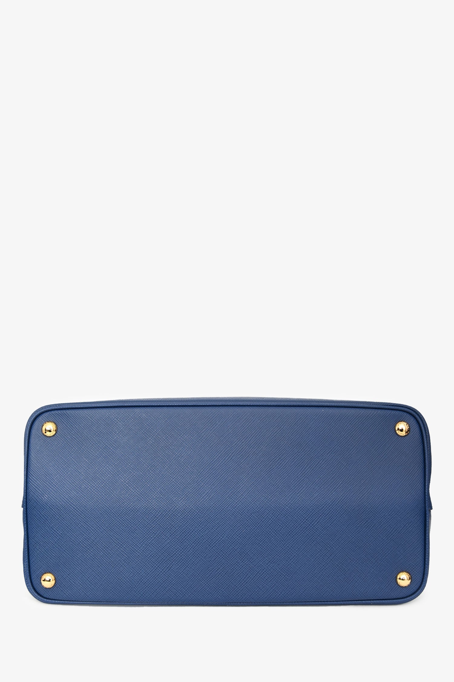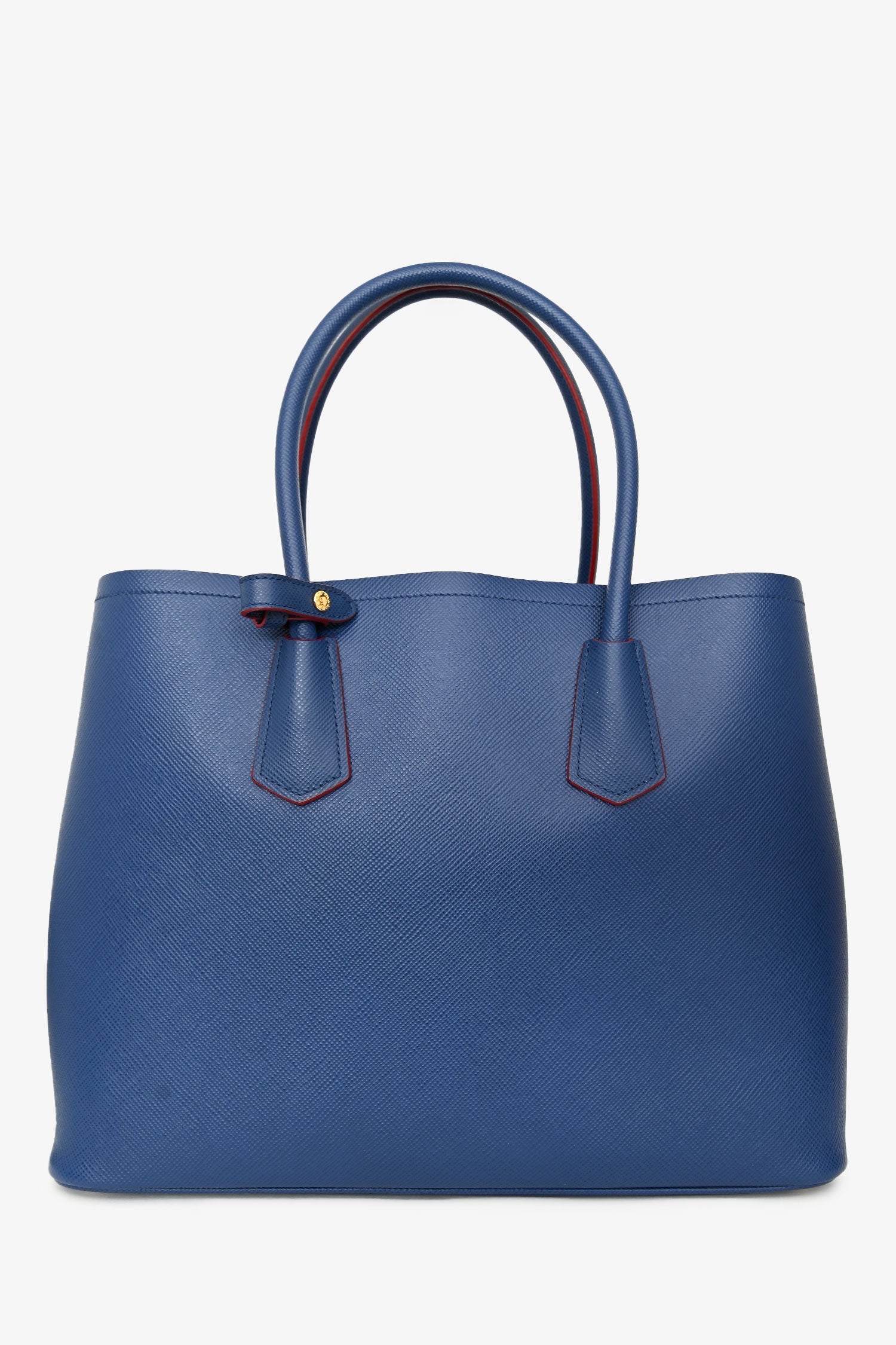 Prada Blue Saffiano Cuir Medium Double Tote. Dual handles. Protective base studs. Detachable and adjustable strap. 3 interior compartments; 2 open, 1 with fold-over flap and magnetic button closure. Leather-lined interior. Detachable luggage tag. Gold-tone hardware. Tonal stitching.