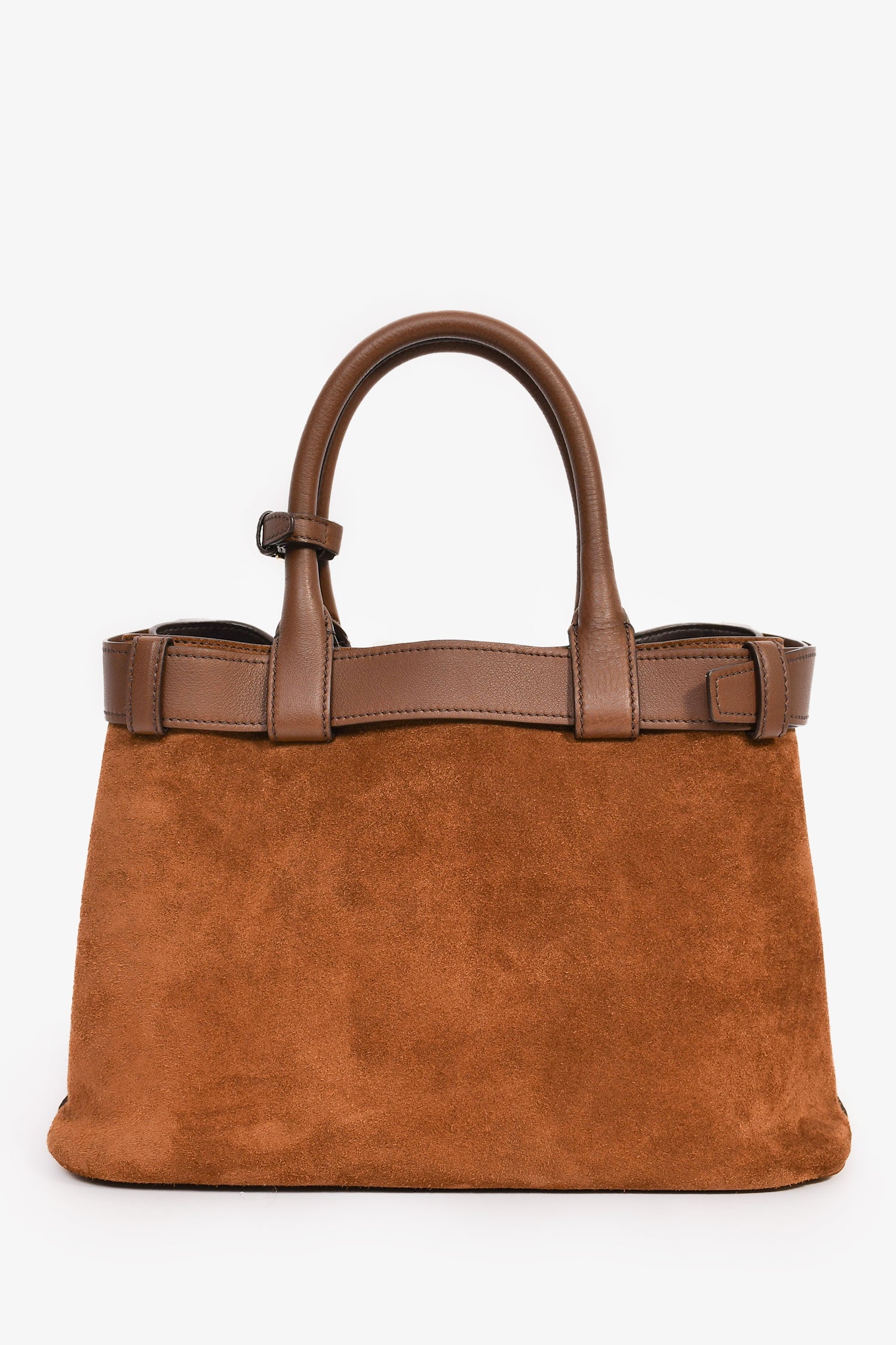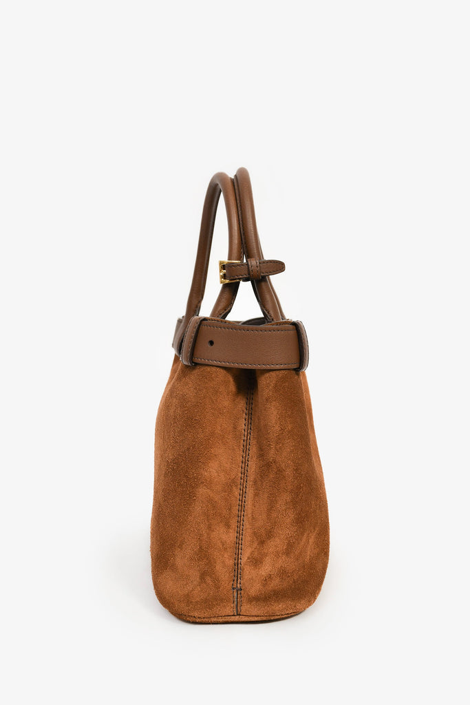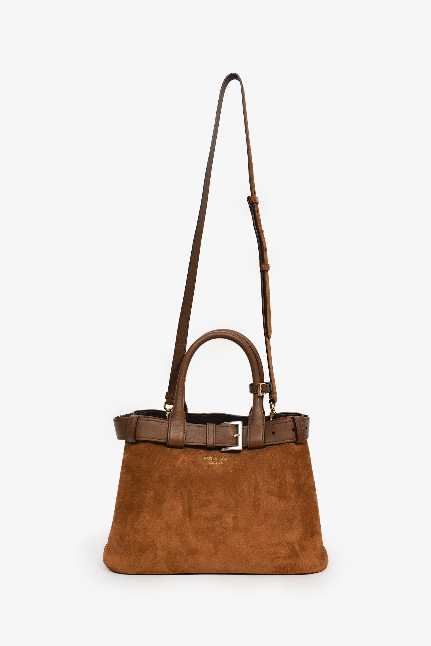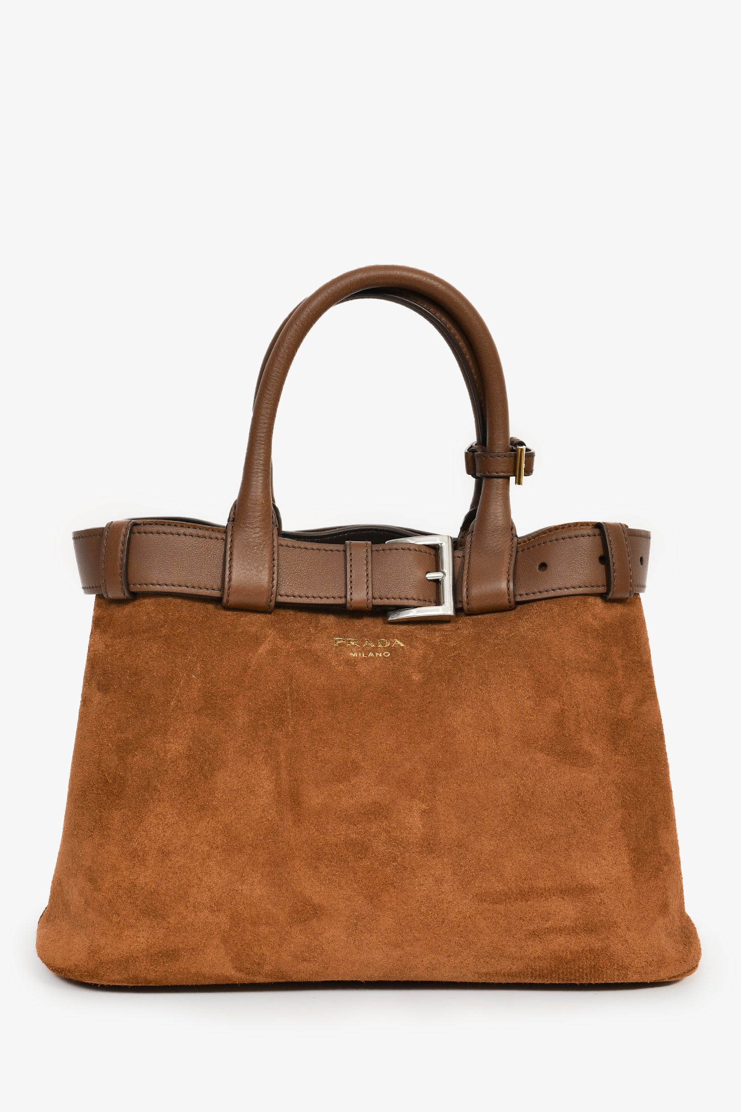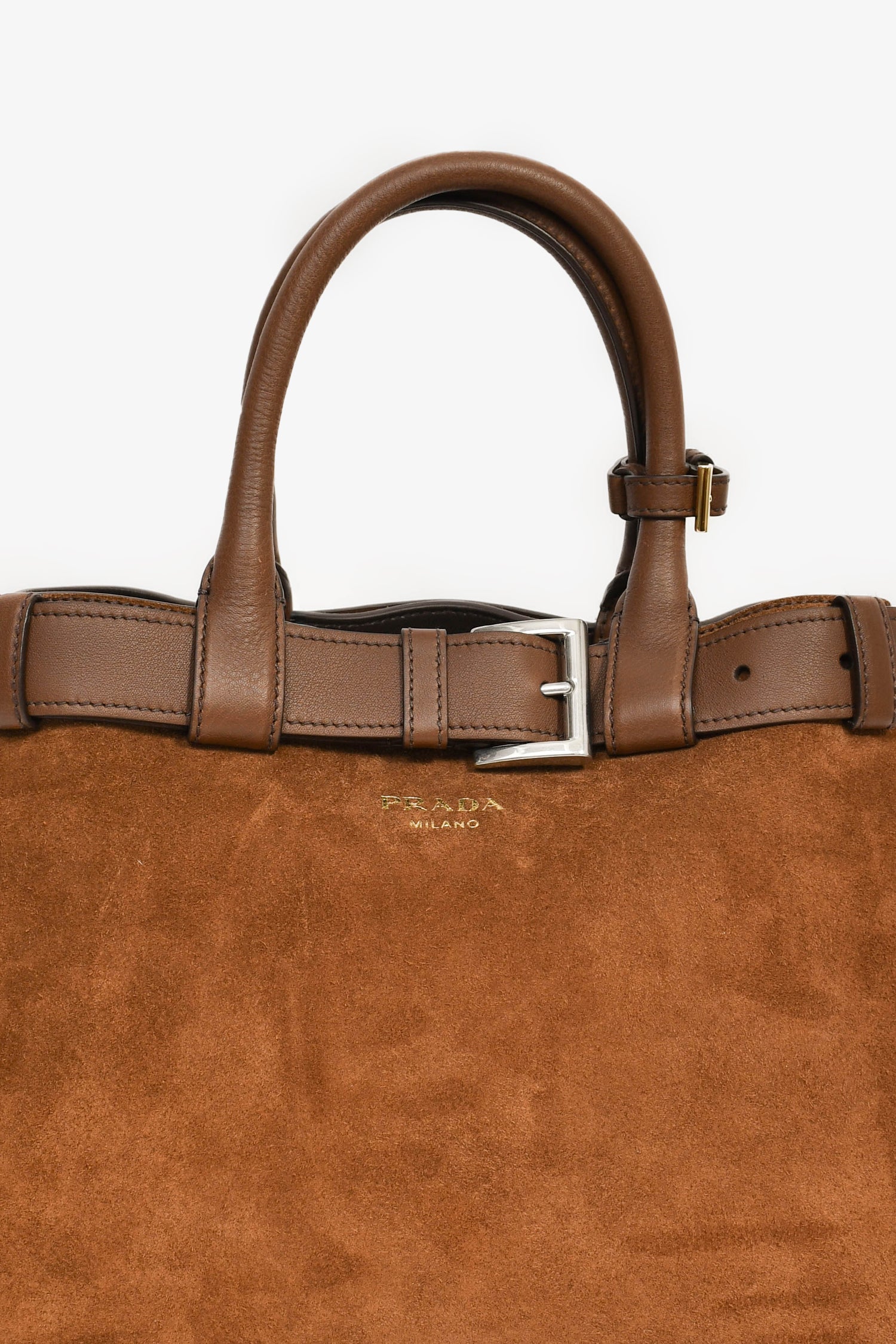 Prada Brown Suede/Leather Buckle Bag. Leather rolled top handles. Gold and silver-tone hardware. Leather trim. Suede exterior. Leather lined interior. 3 compartments. Comes with an suede attachable strap. Tonal stitching.