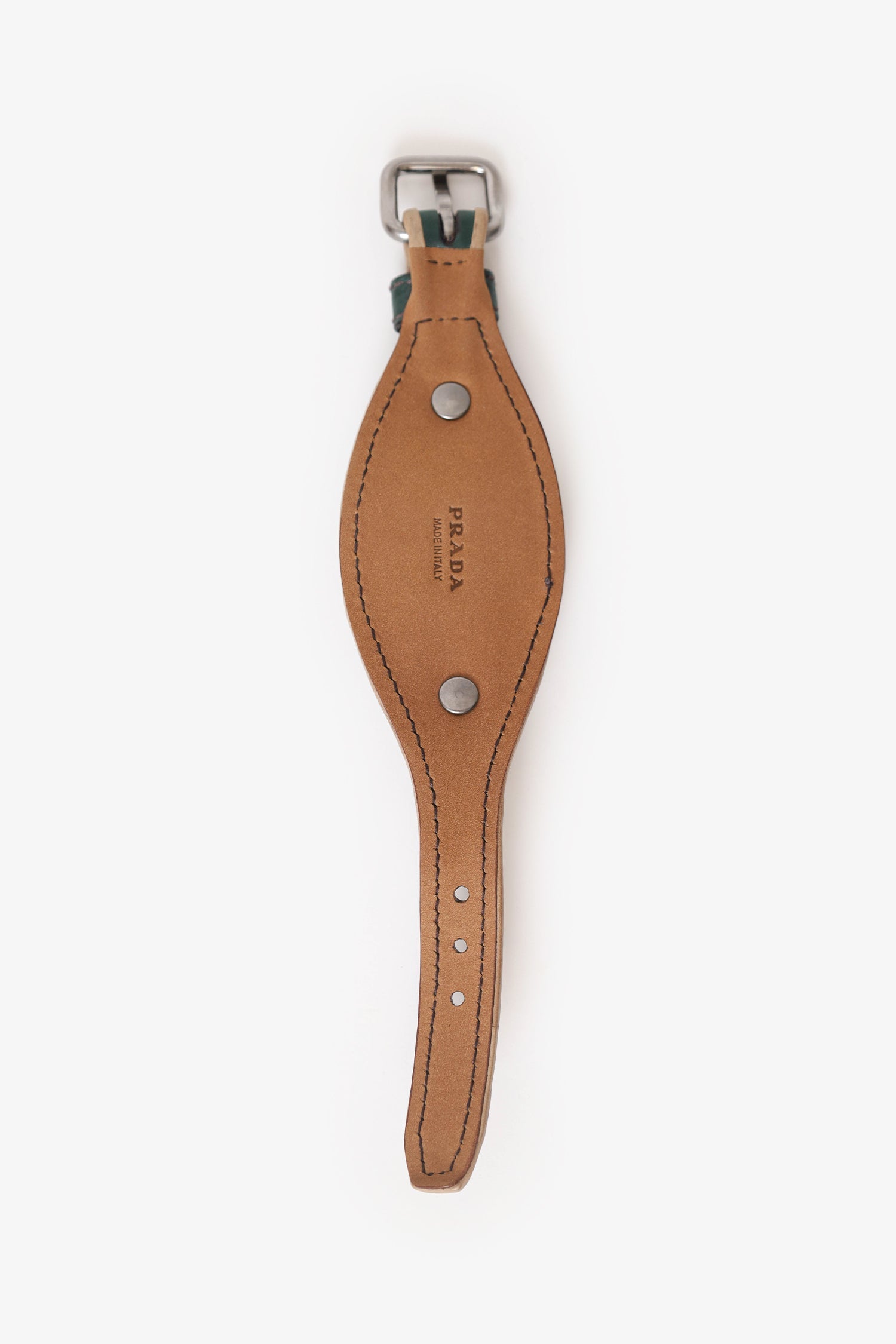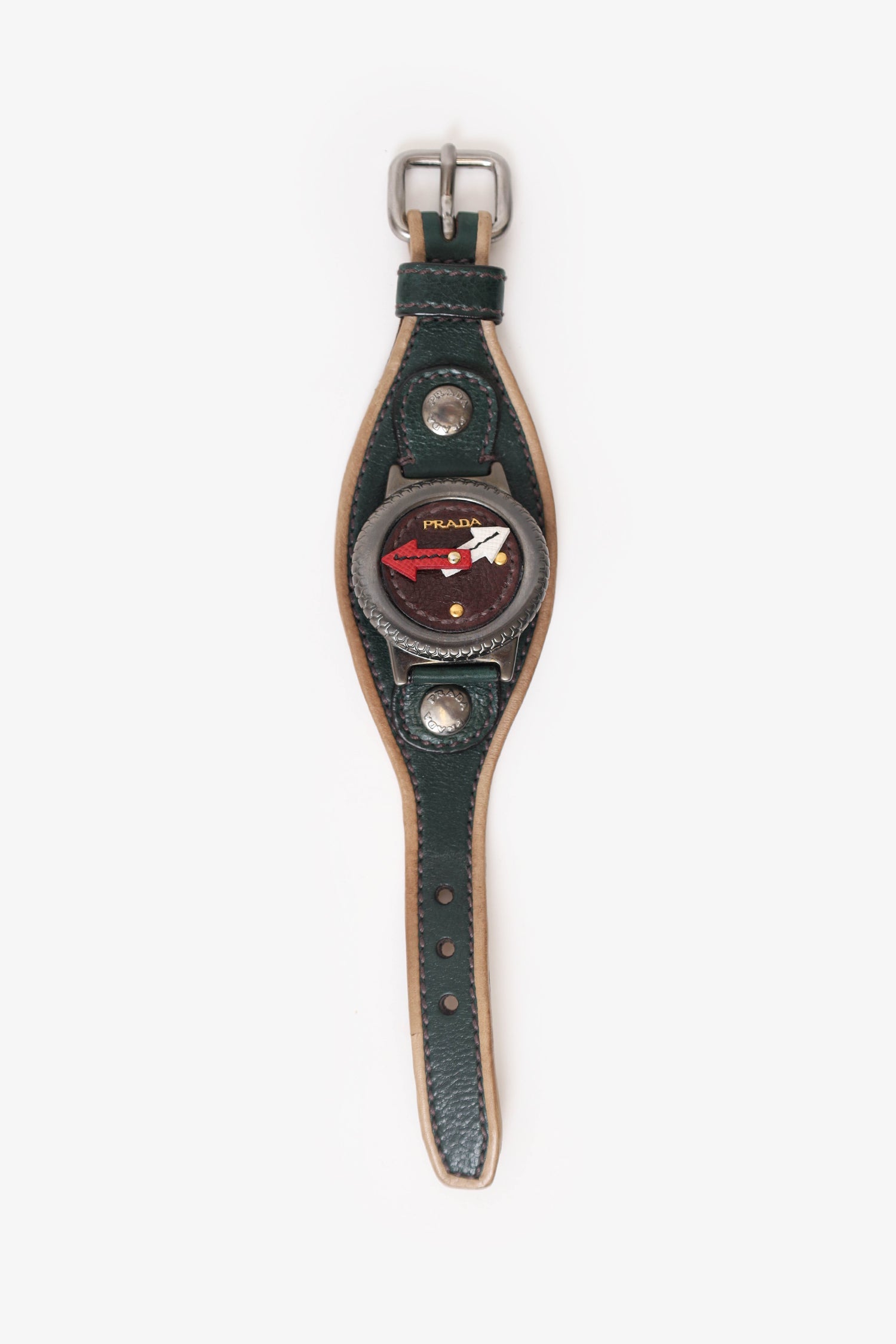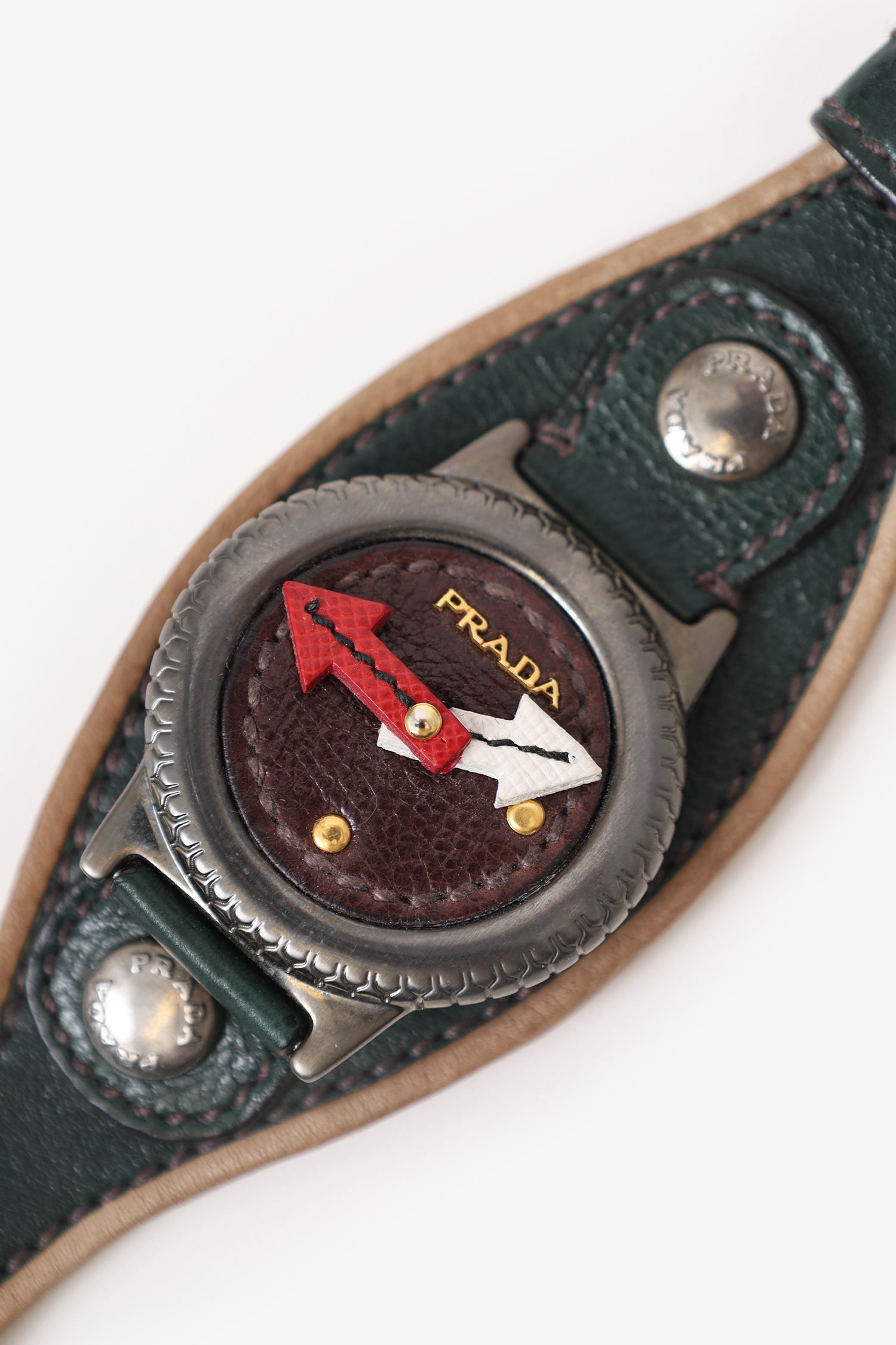 Prada Green Leather Watch Motif Wrap Bracelet. Adjustable rear pull-through buckle closure. Lined interior. Gold and silver-tone hardware. Contrast stitching.