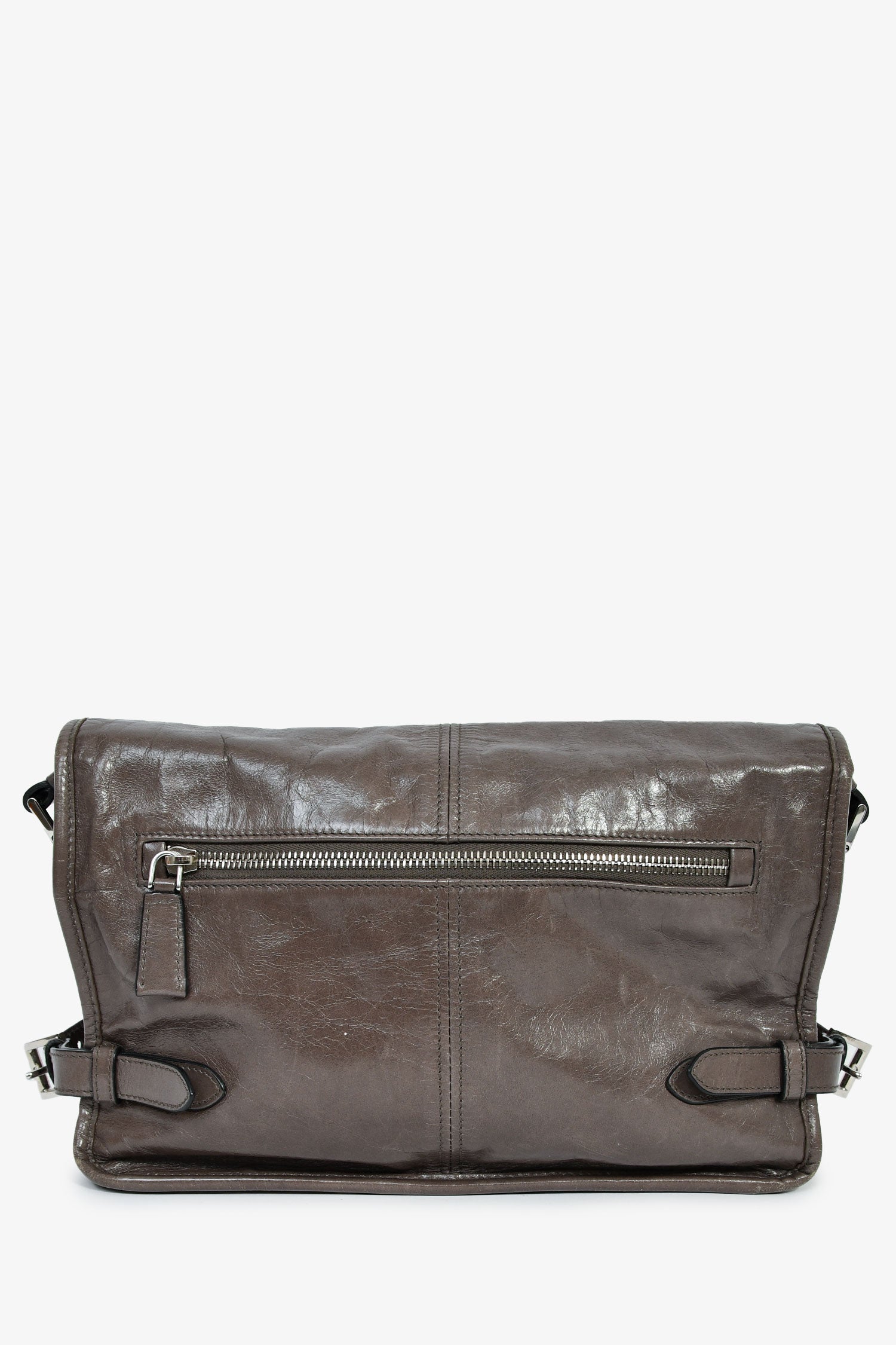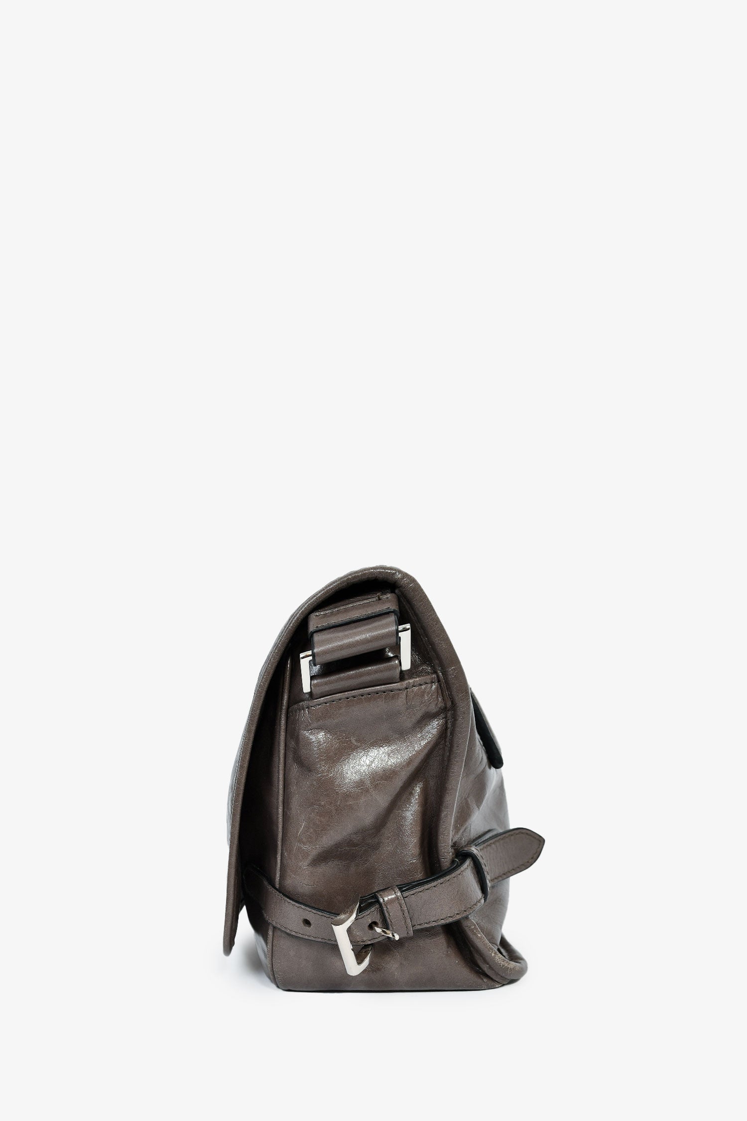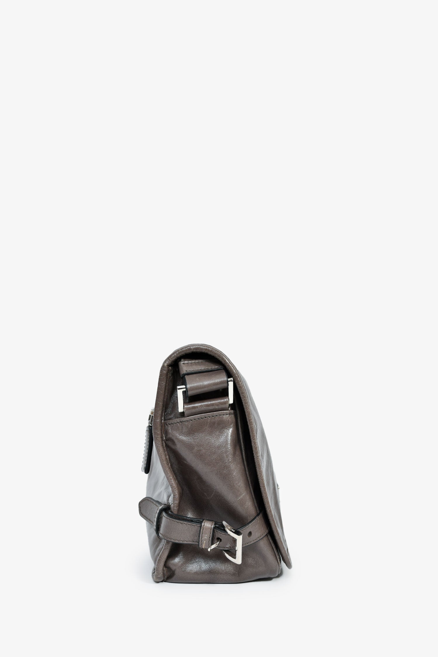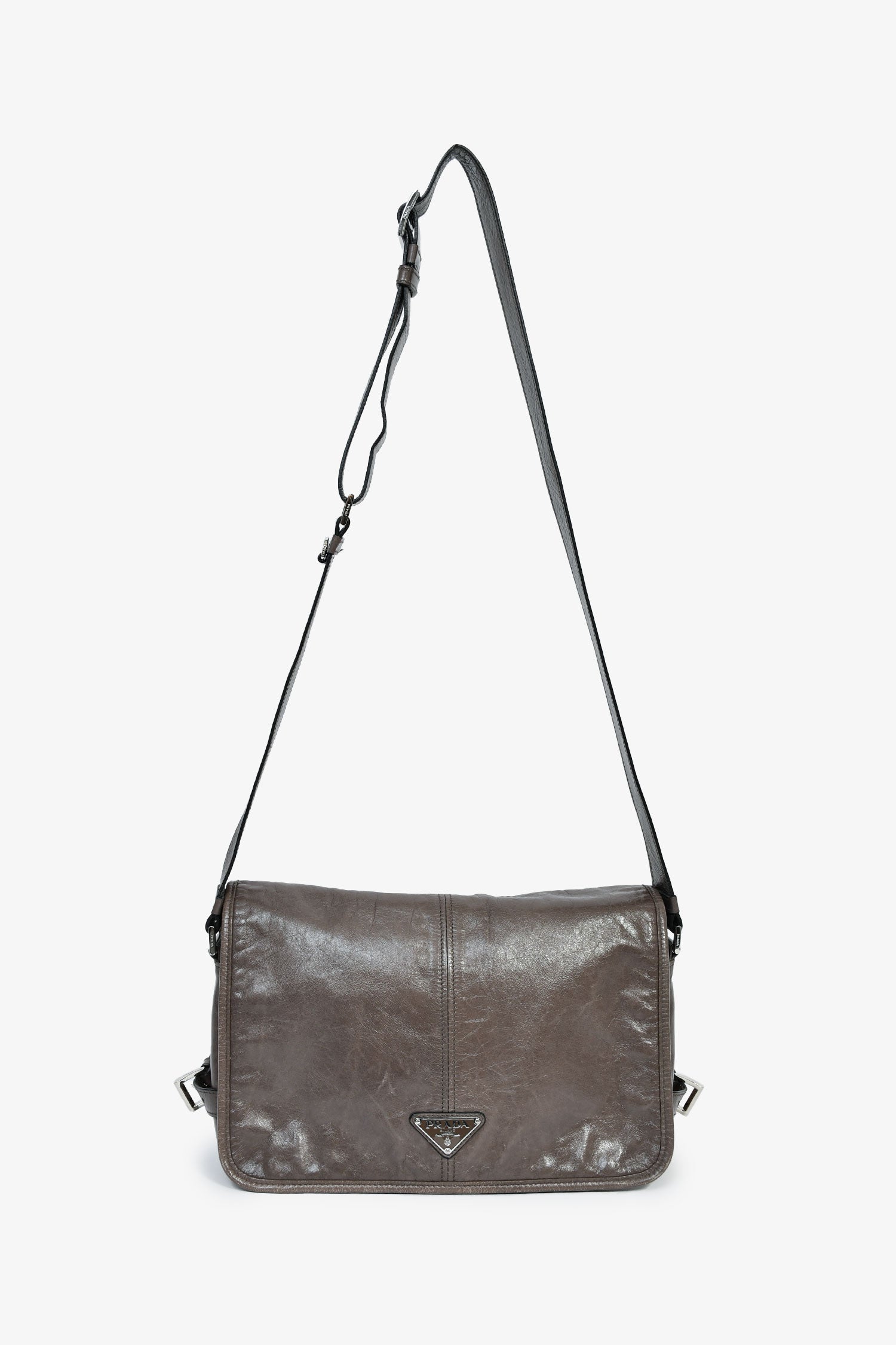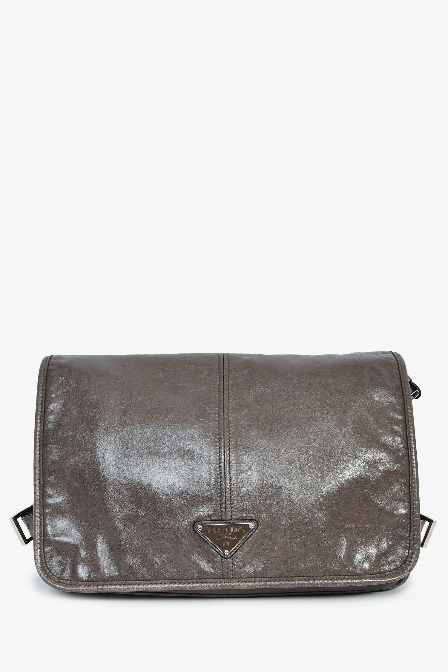 Prada Grey Leather Messenger Bag. Fold-over flap with a magnetic closure. Single crossbody strap. 1 zipped exterior. 2 interior compartments: 1 main and 1 zipped. Silver-tone hardware. Tonal stitching.
