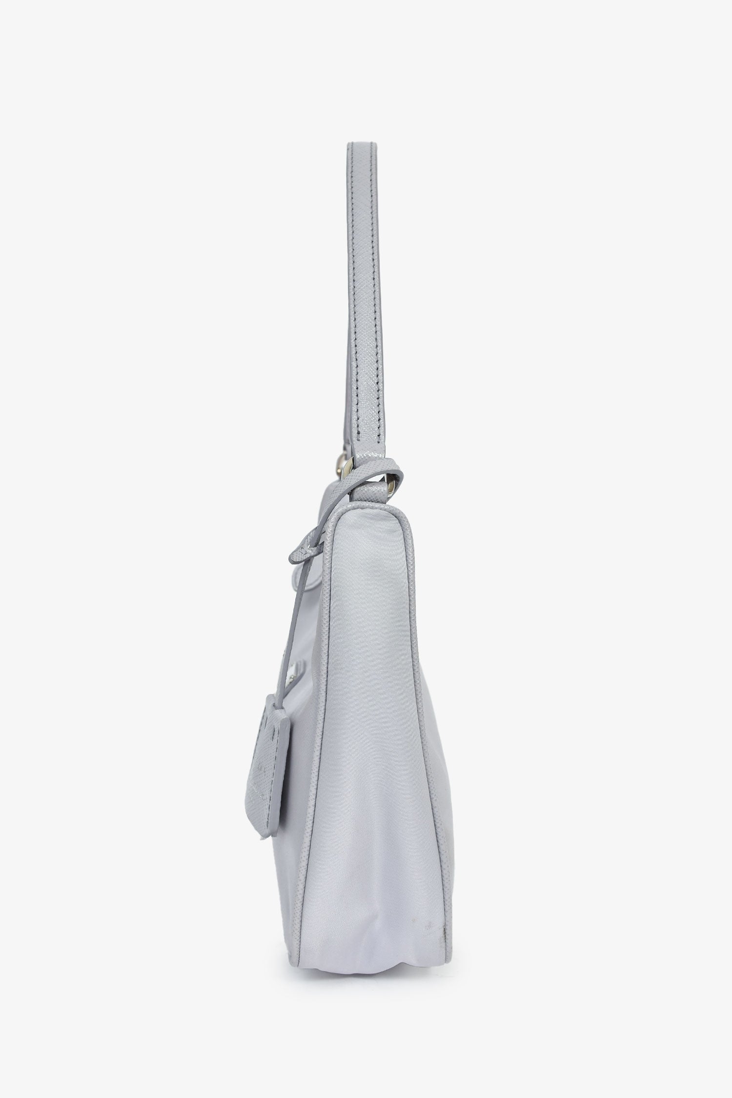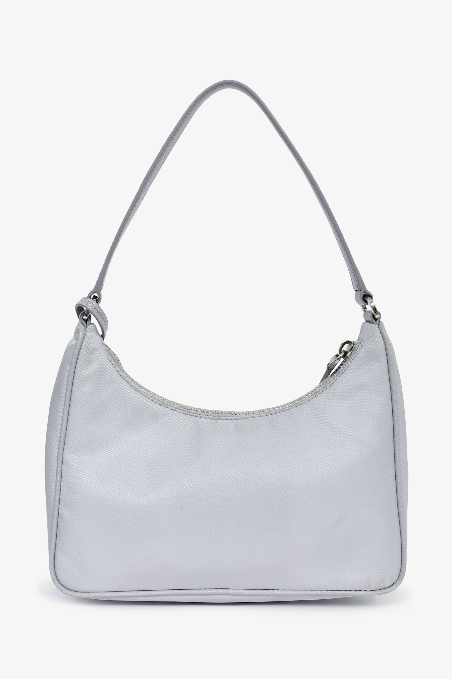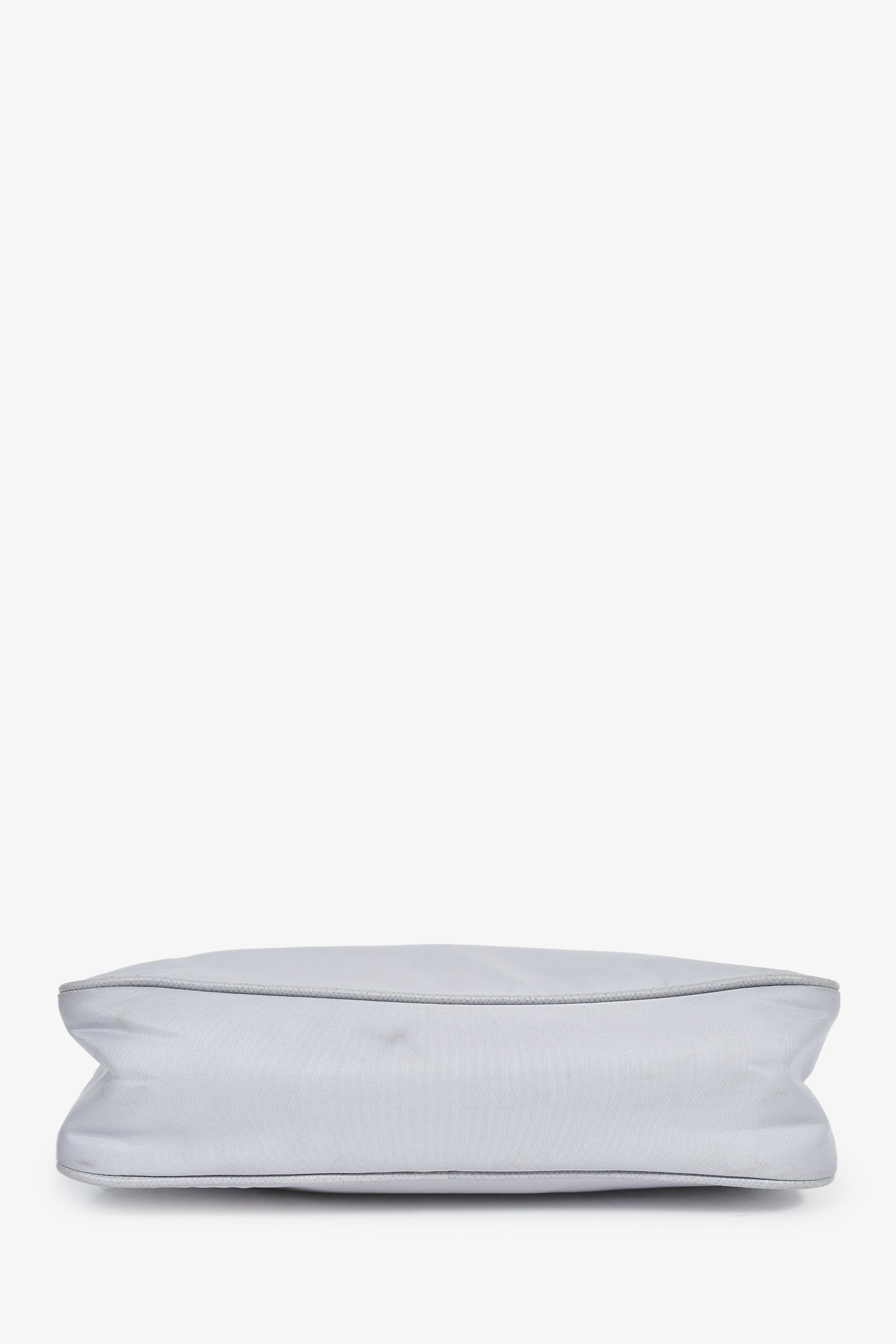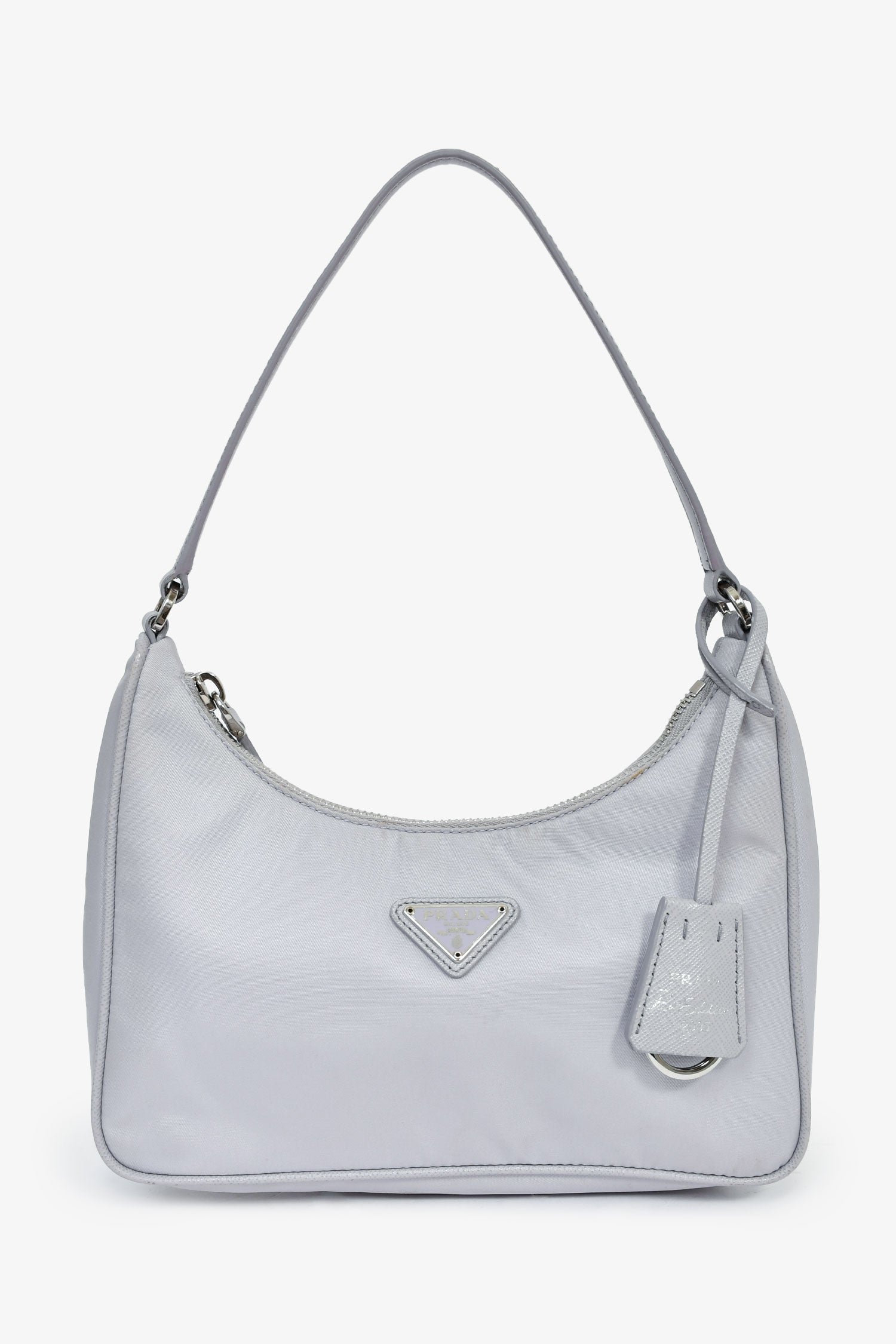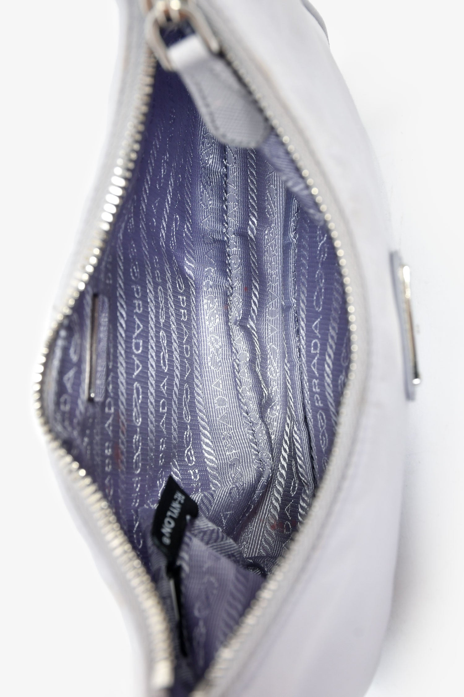 Prada Lilac Re-Nylon 2005 Shoulder Bag. Zipped closure. Single shoulder strap. Attached clochette. Lined interior. Silver-tone hardware. Tonal stitching.