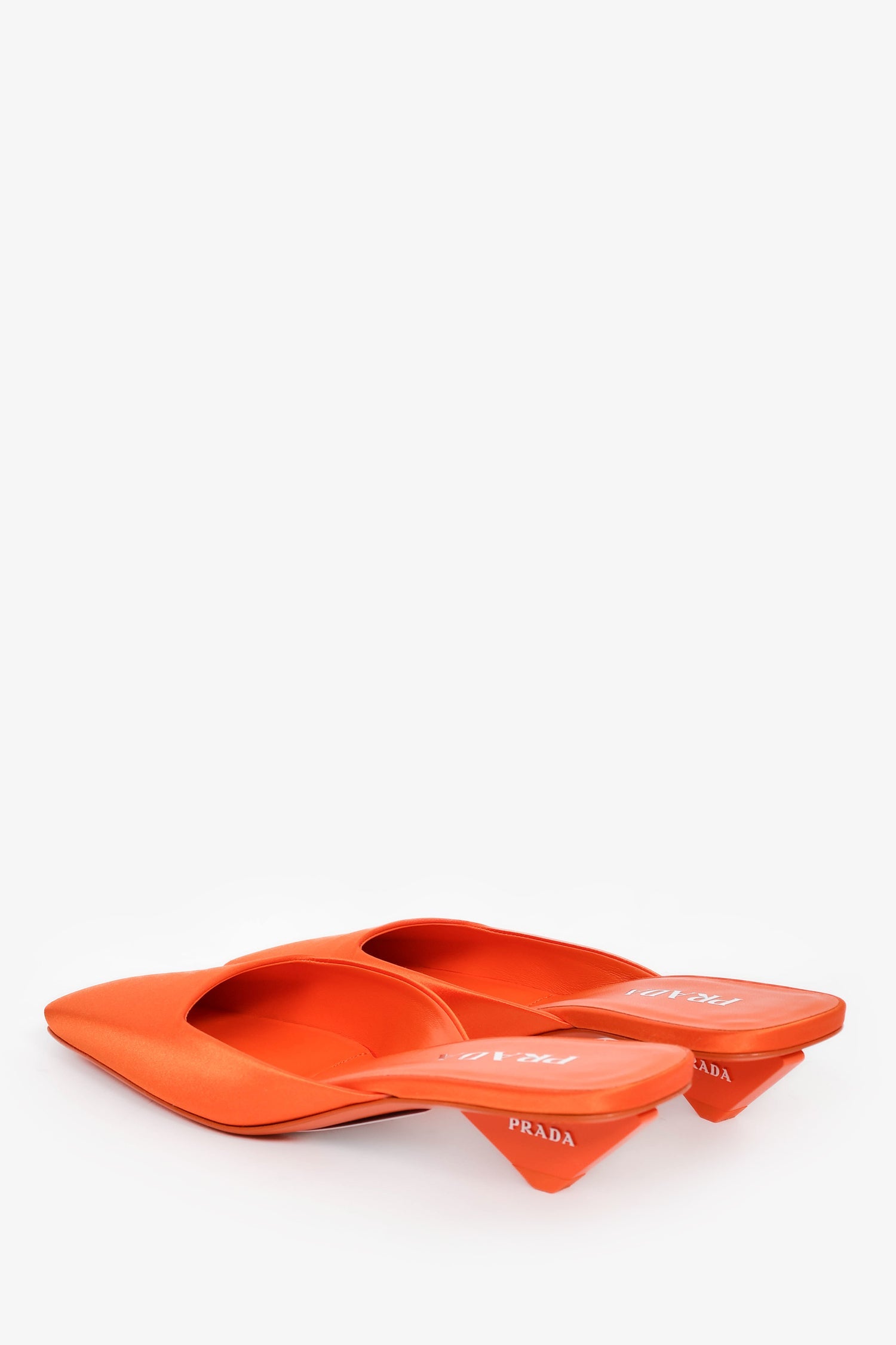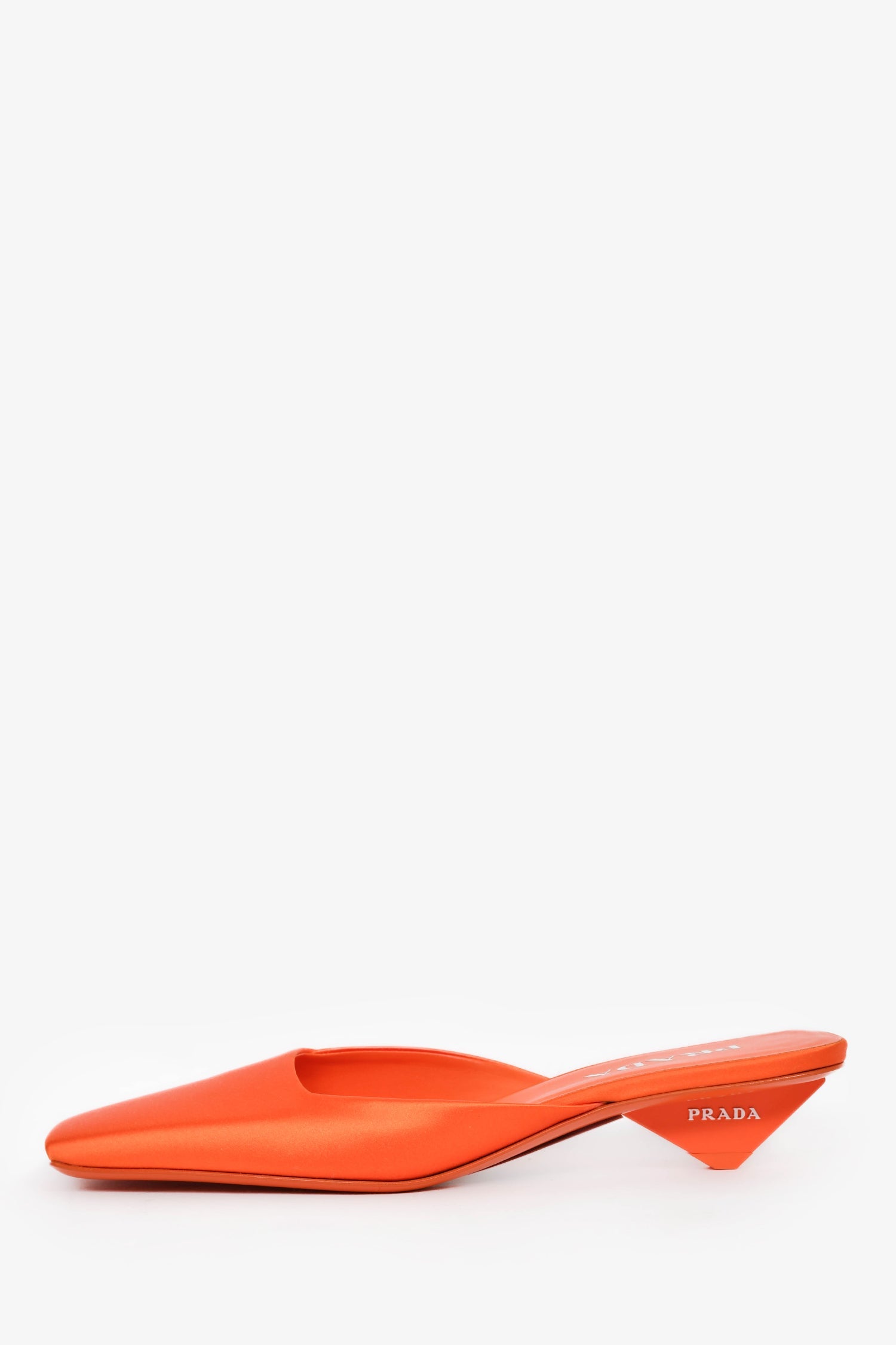 Prada Orange Satin Square Toe Mules. Tapered square toe. Tonal stitching.