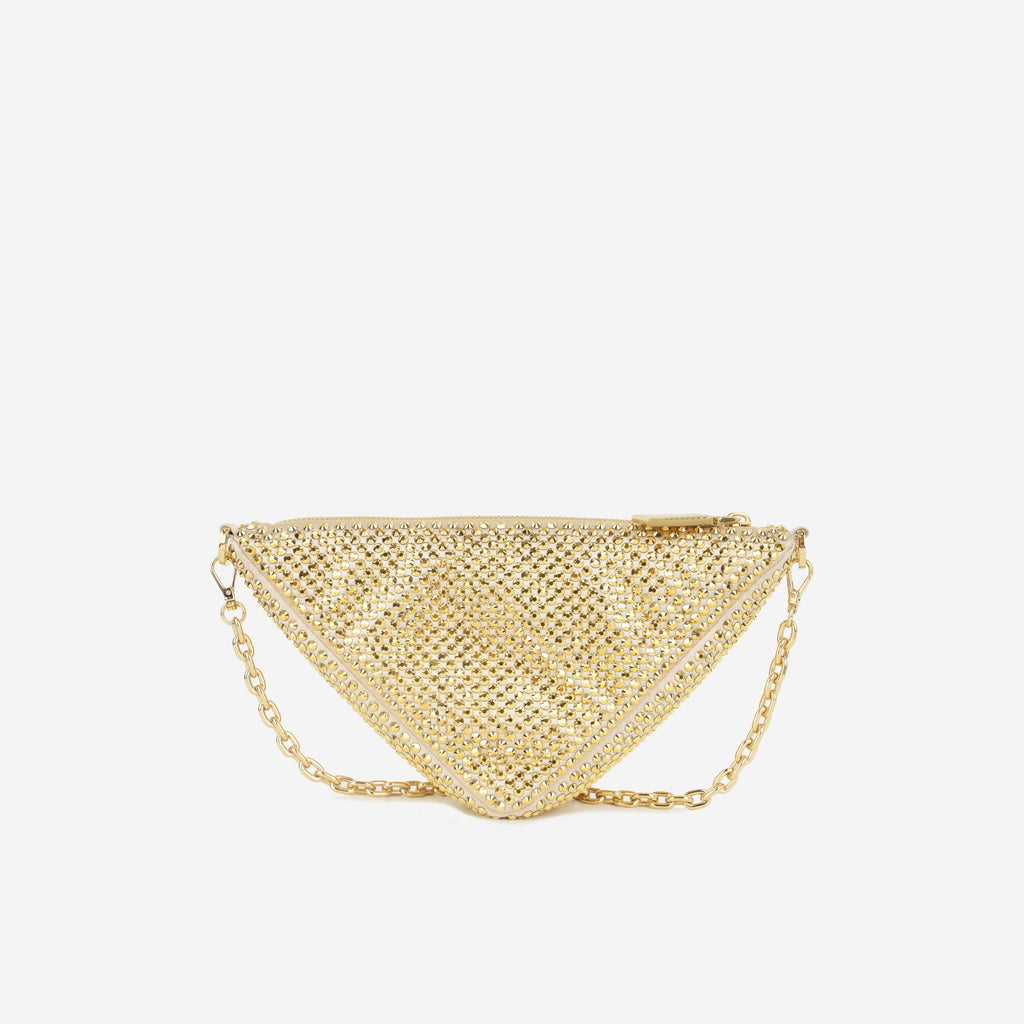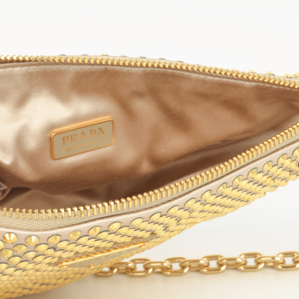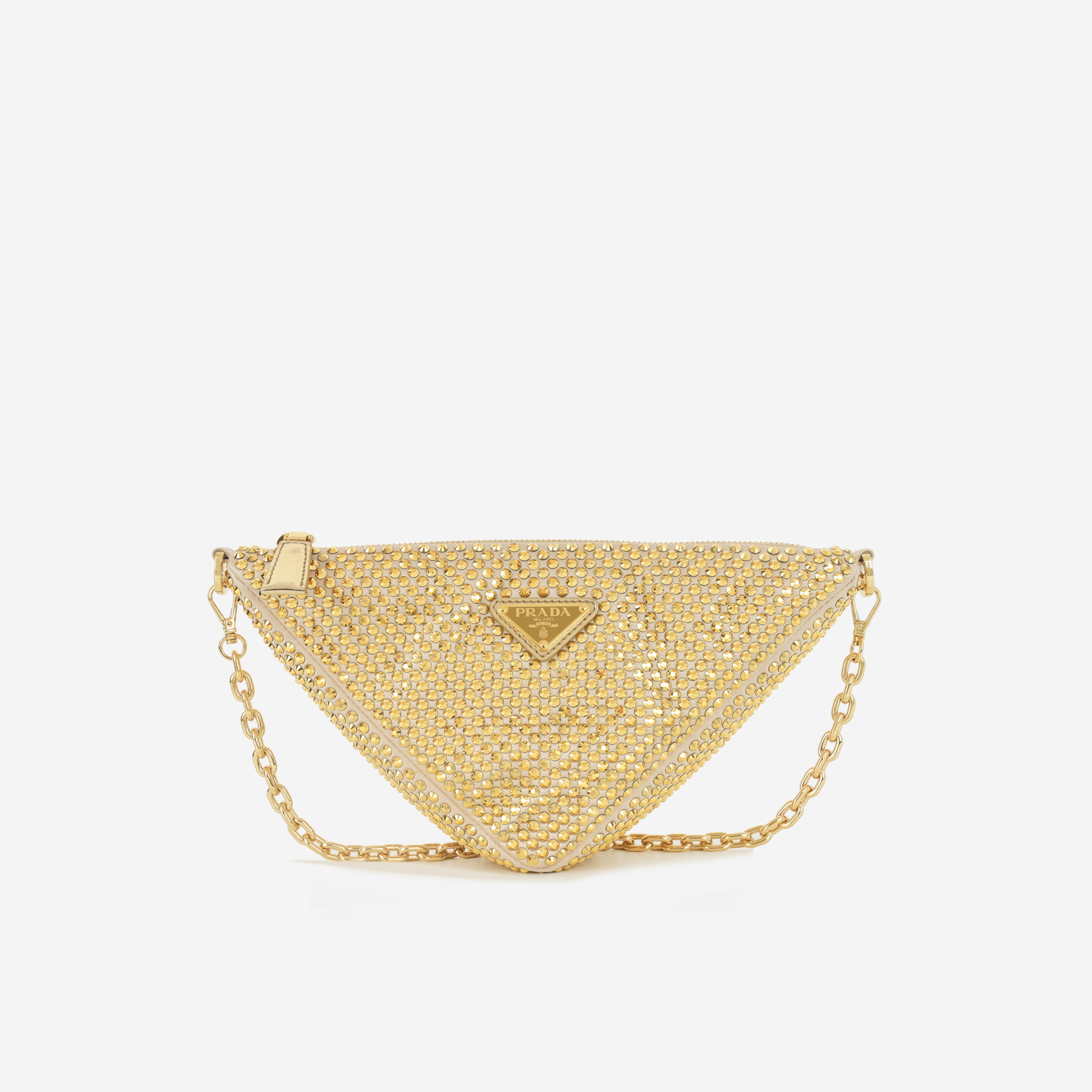 This Prada Triangle Bag in Gold Satin embellished with crystals is one of Prada’s most striking and instantly recognisable designs. Finished with Gold hardware, this shimmering piece is perfect for evening looks, special events, or adding a touch of glamour to any outfit.
