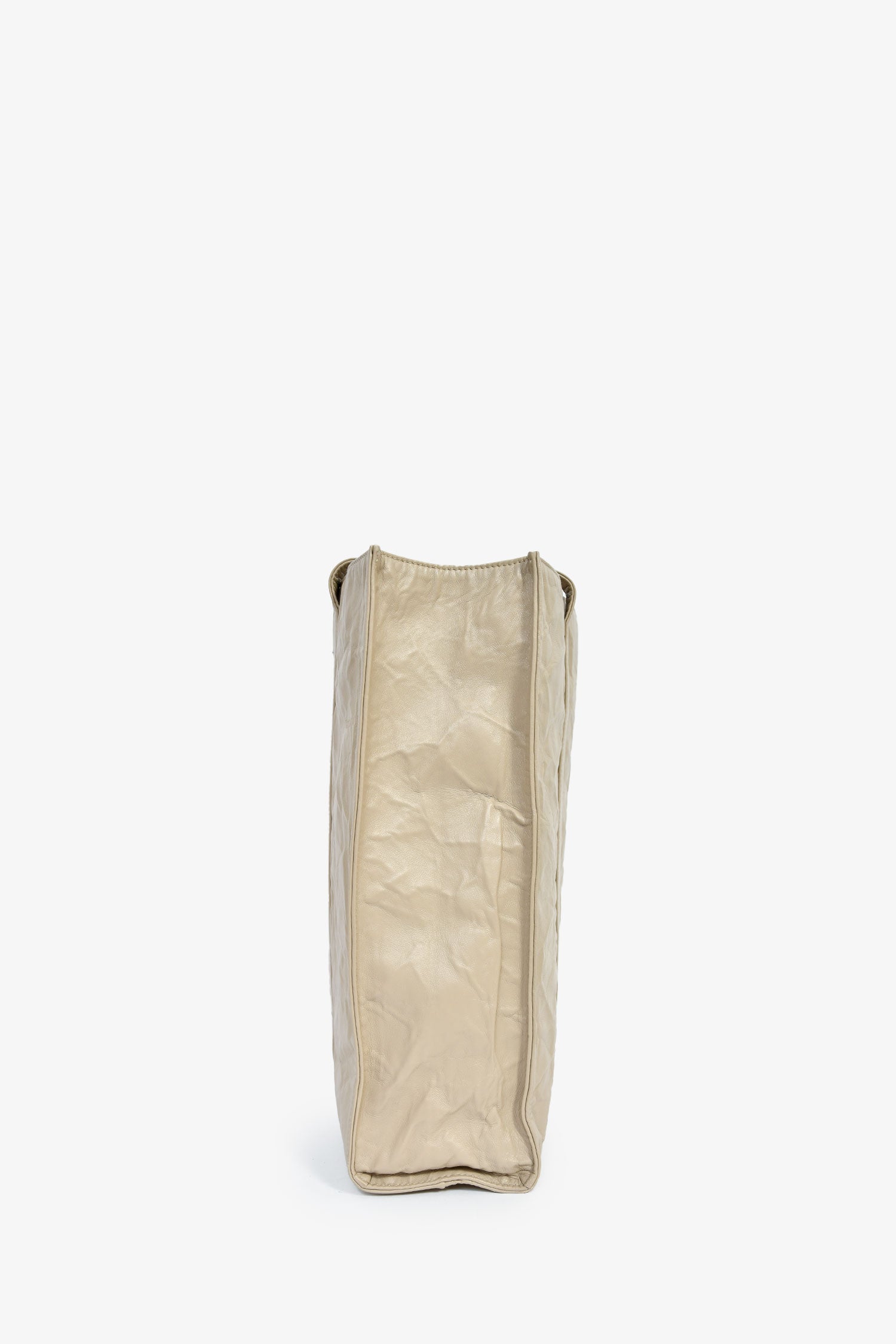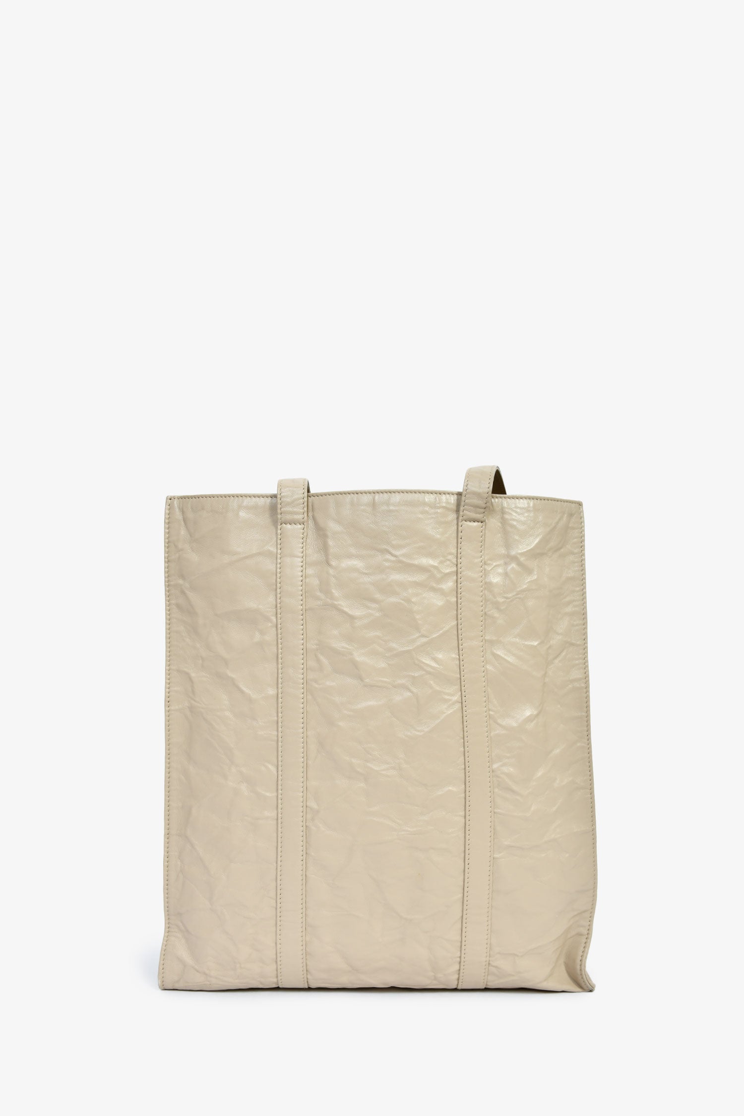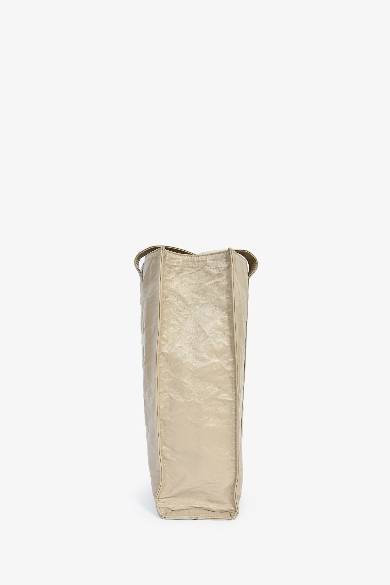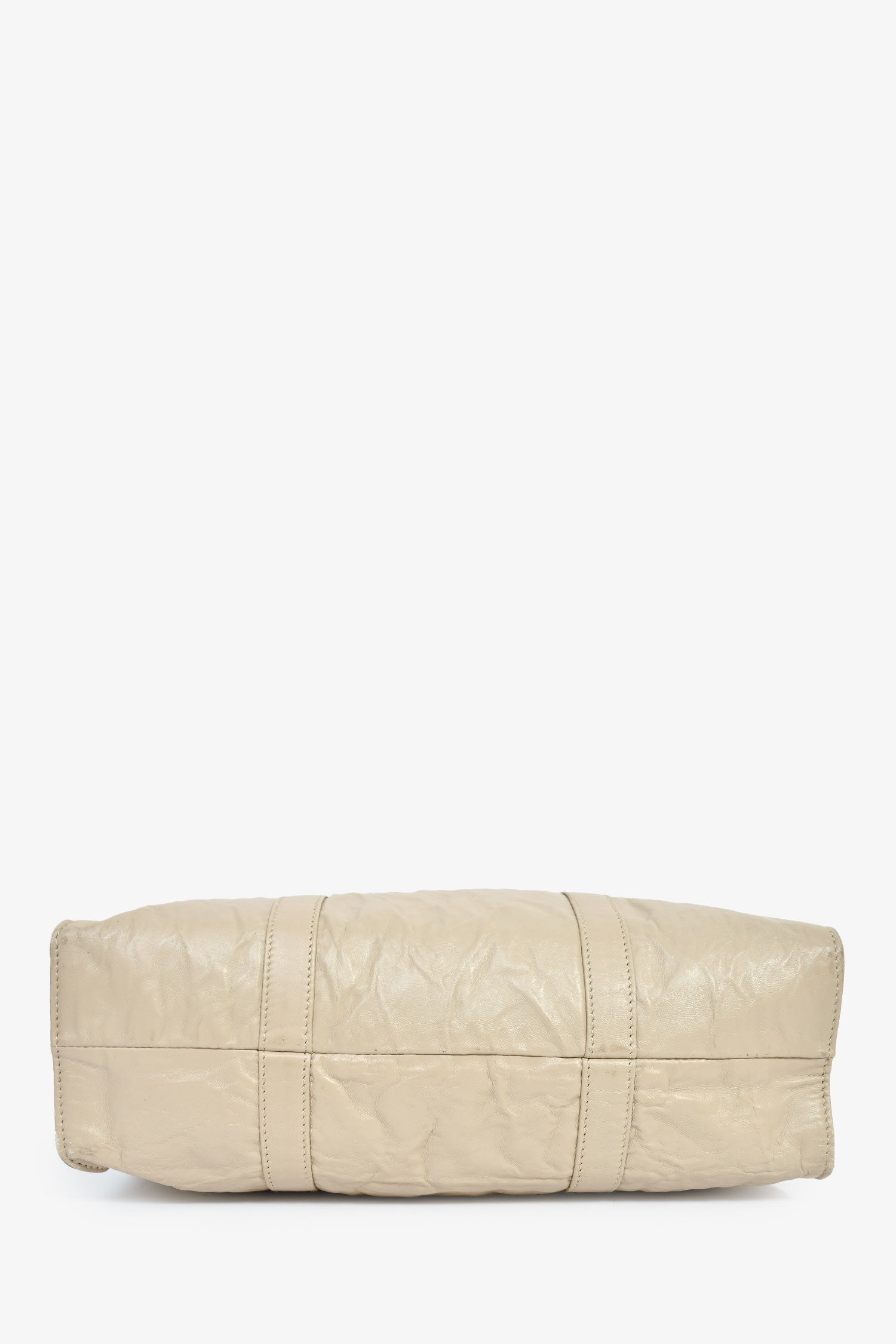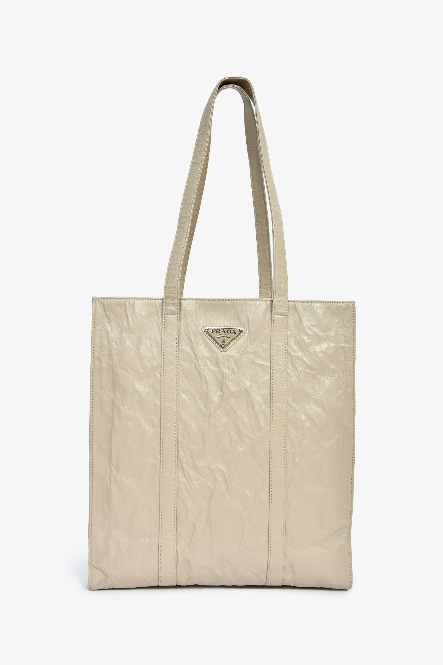 Prada Taupe Lather Crinkle Effect Small Tote Bag. 2 flat shoulder straps. Lined leather interior with 2 zip compartments. Silver-tone hardware. Tonal stitching.