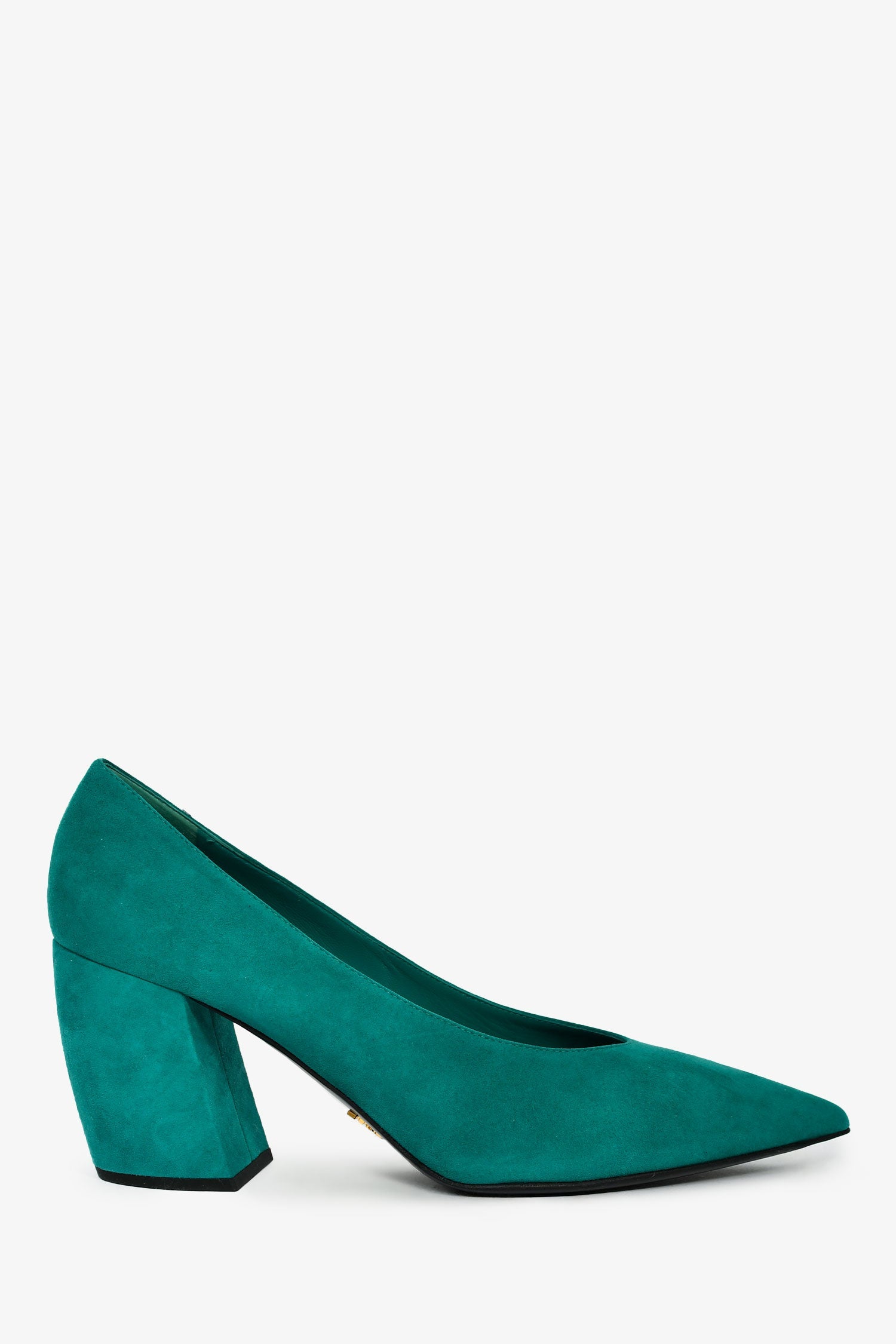 Prada Teal Suede Pointed Toe Curved Heel Mules. Pointed toes. Leather insoles. Gold-tone hardware. Tonal stitching.