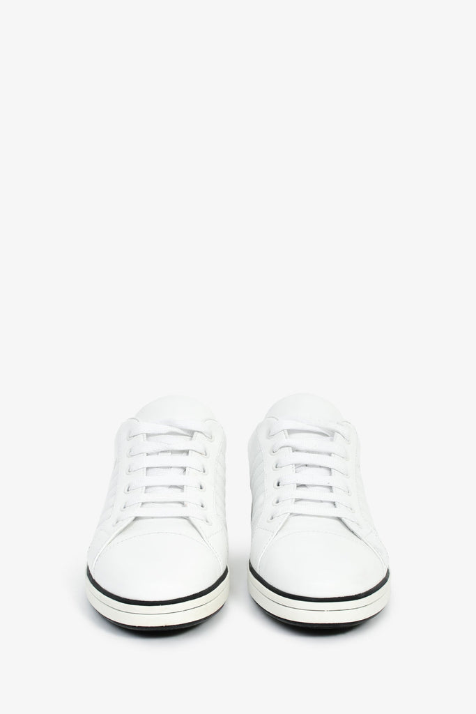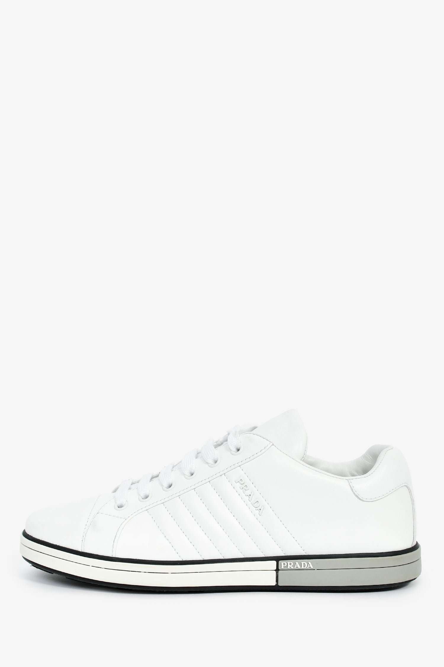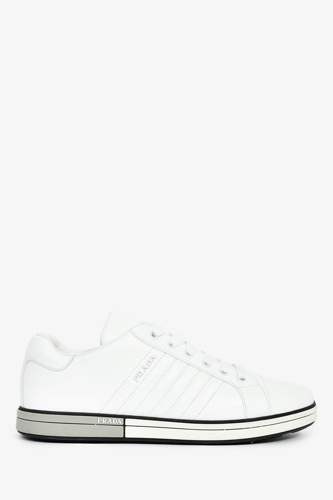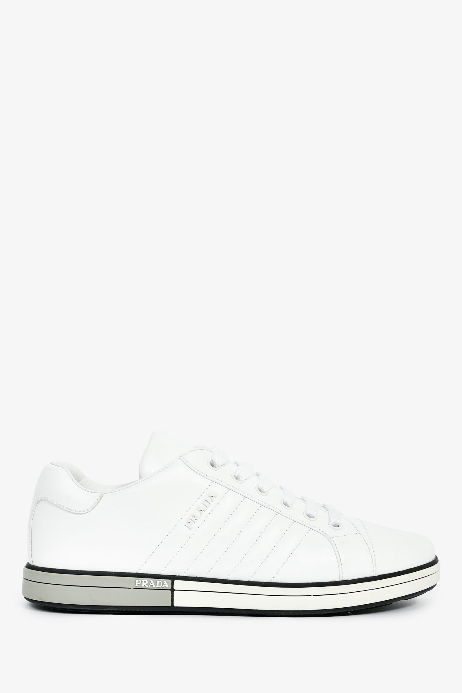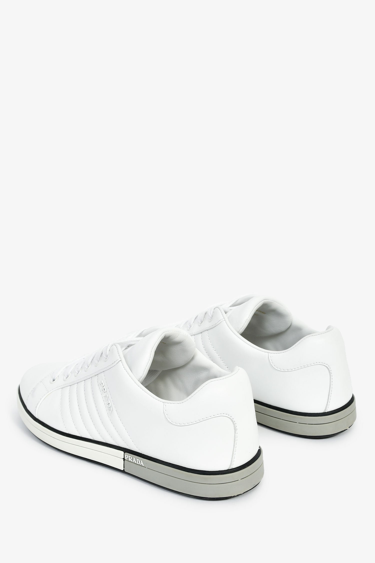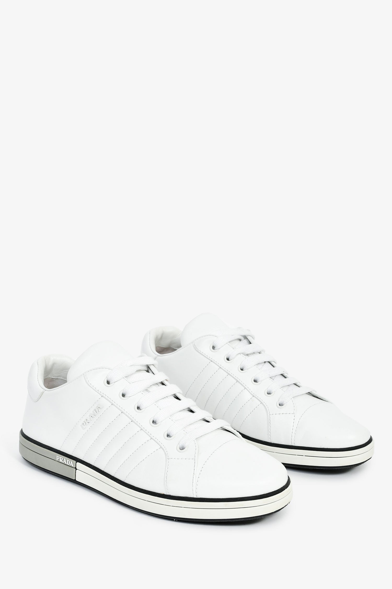 Prada White Leather Sneakers. Slip-on. Round toe. Lace-up closure. Tonal hardware and stitching.