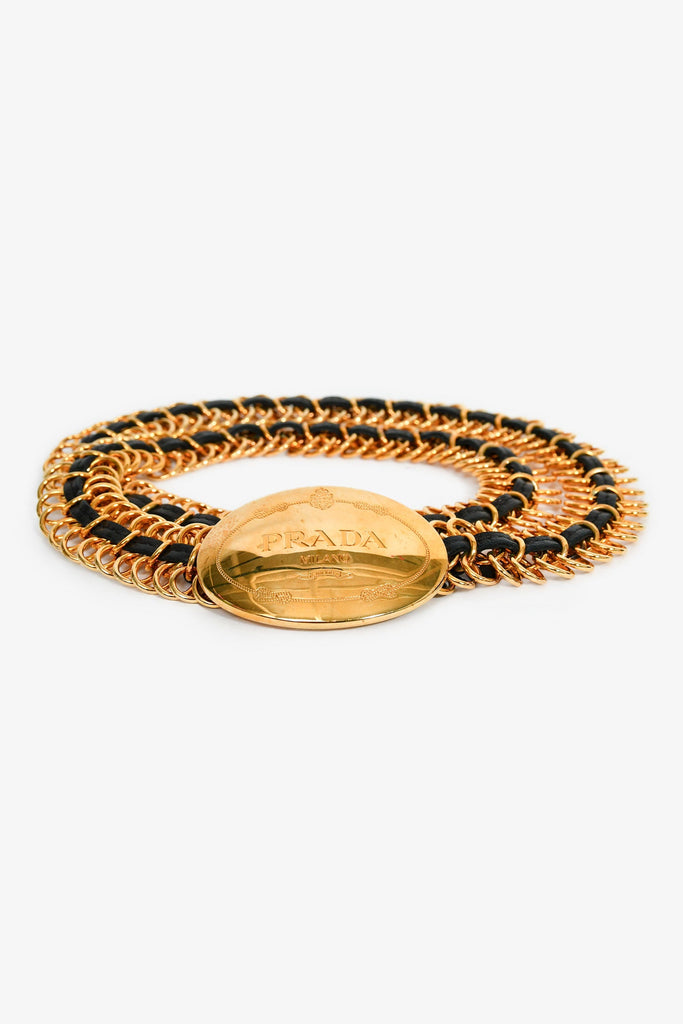 Prada Gold Tone Leather Chain Plaque Belt Size 80