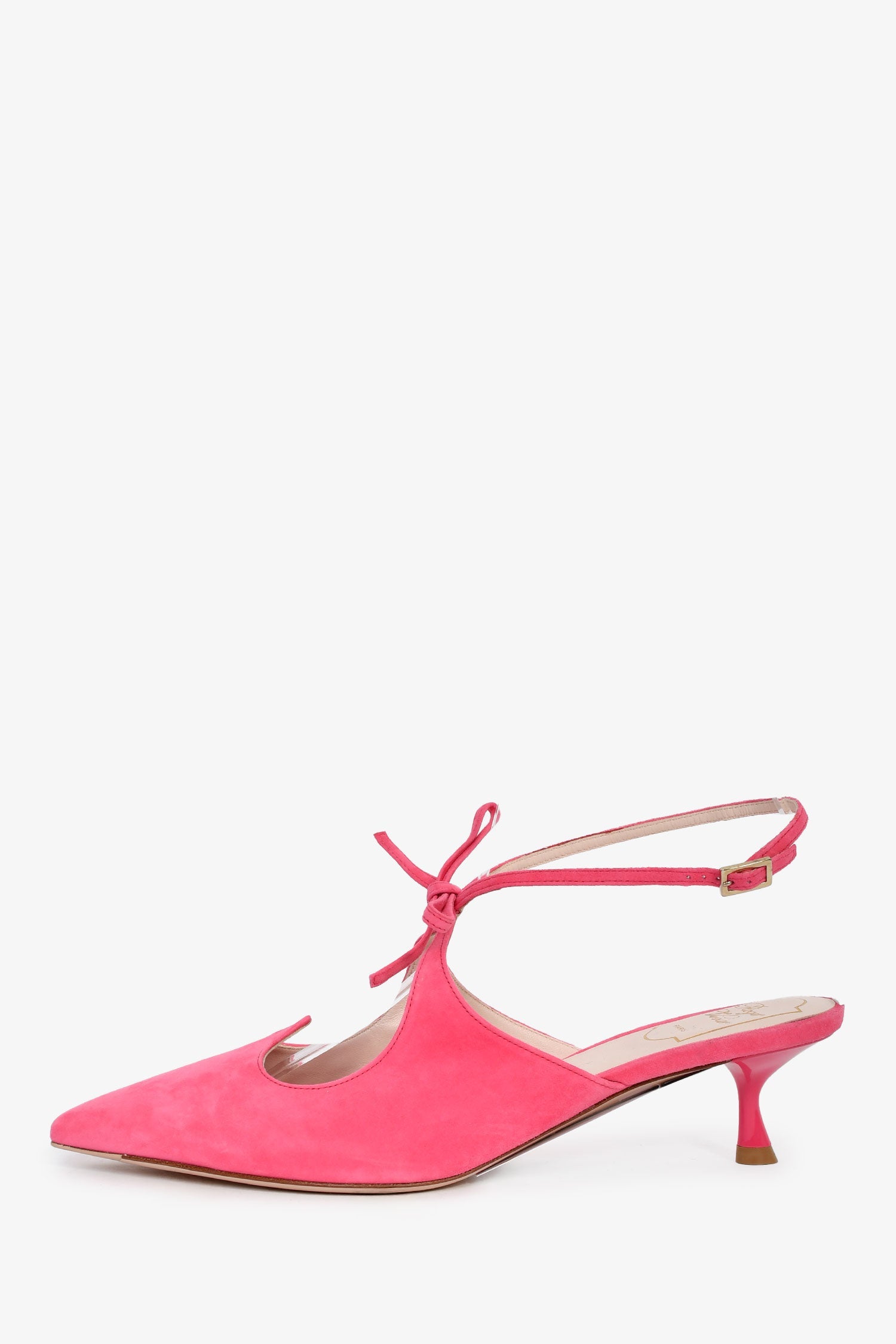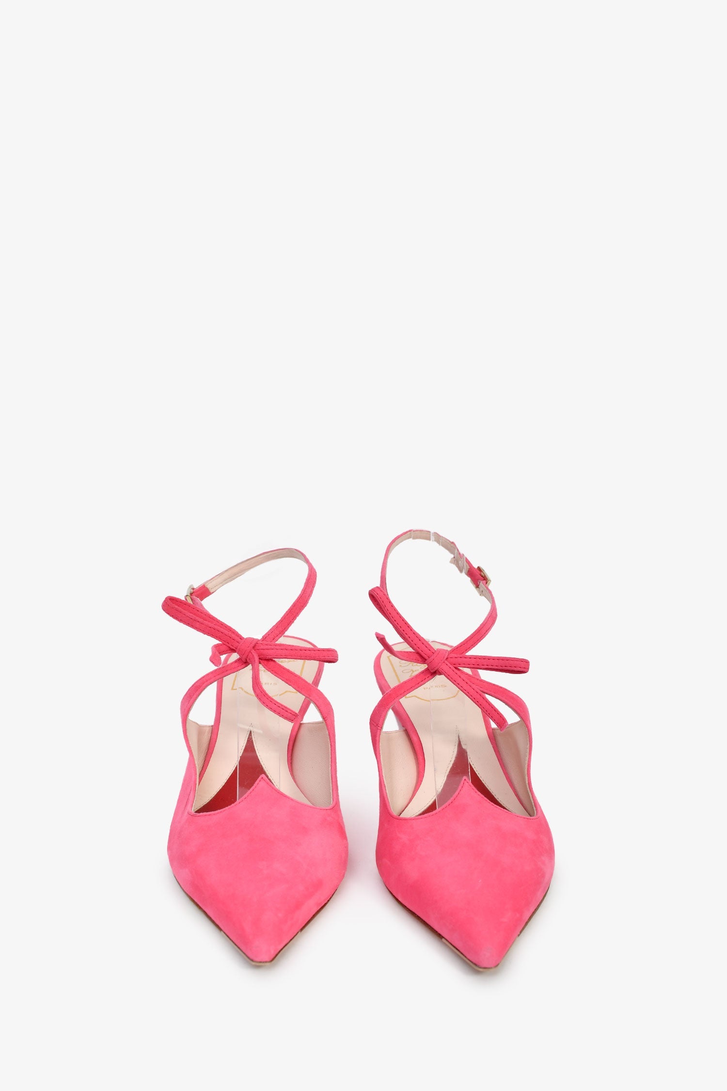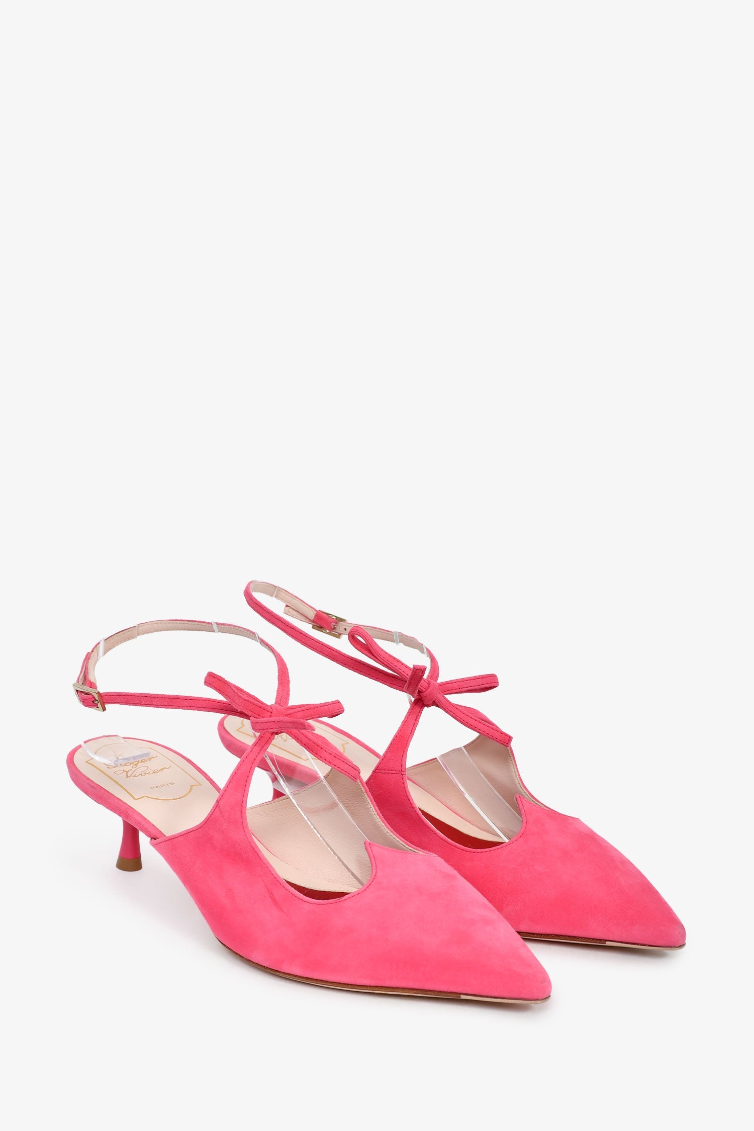 Roger Vivier Pink Suede Bow Detail Cutout Heels. Pointed toes. Two-tone leather insole. Gold-tone hardware. Tonal stitching.