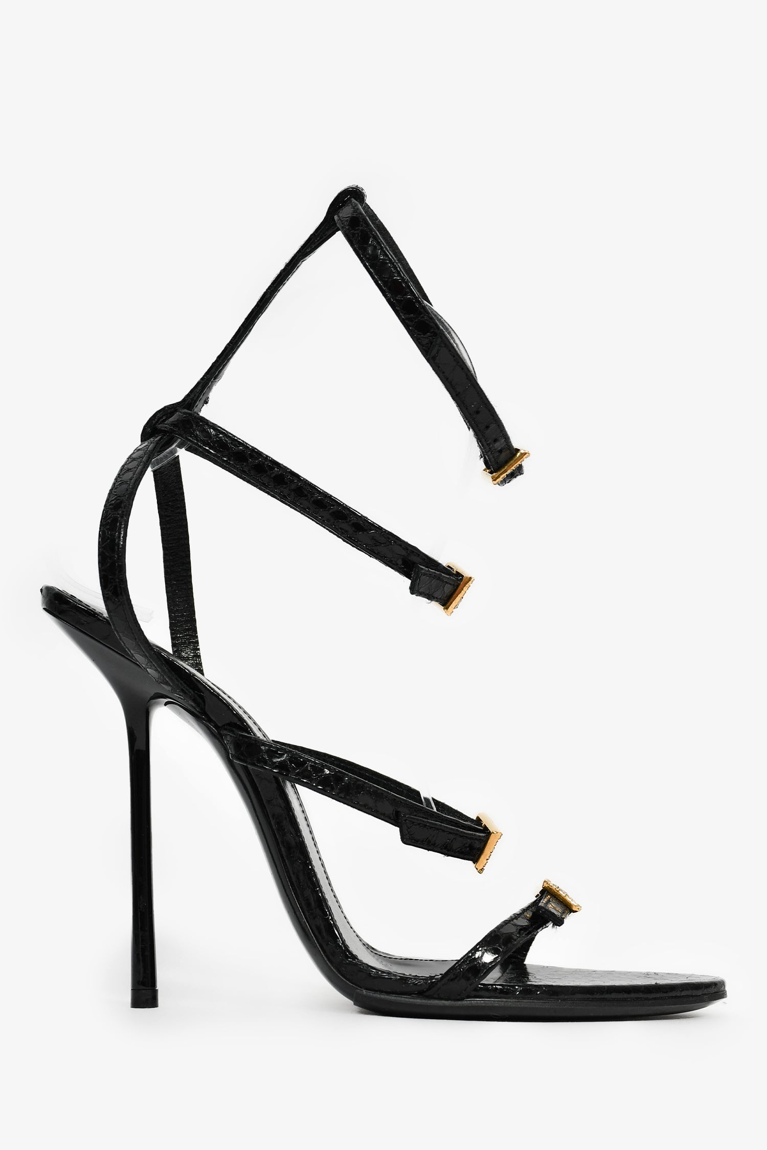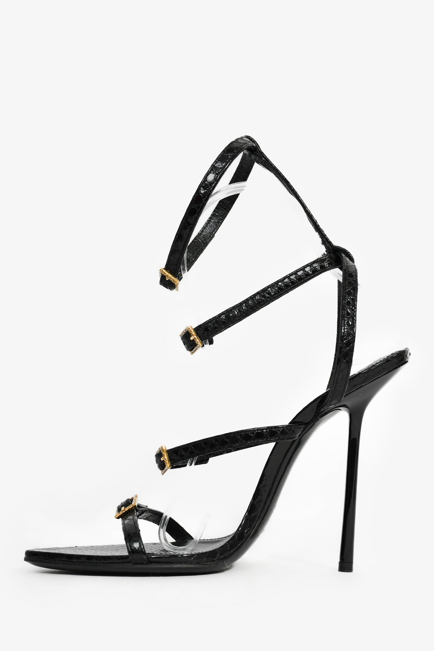 Saint Laurent Black Leather Crystal Buckle Heels. Slip-on. Pointed toe. Adjustable ankle strap. Tonal stitching. Gold-tone hardware.