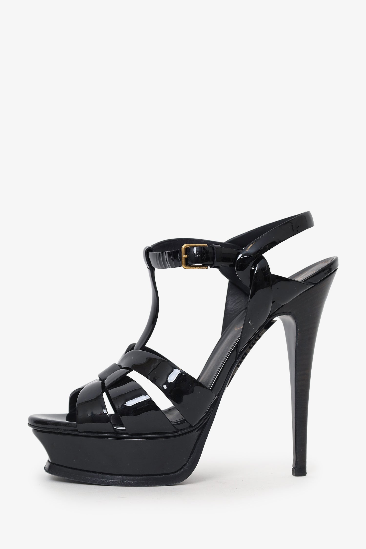 Saint Laurent Black Patent Leather Tribute Platform Heels. Slip-on. Round open-toe. Adjustable ankle strap with pull-through buckle closure. Lined interior. Gold-tone hardware. Tonal stitching.