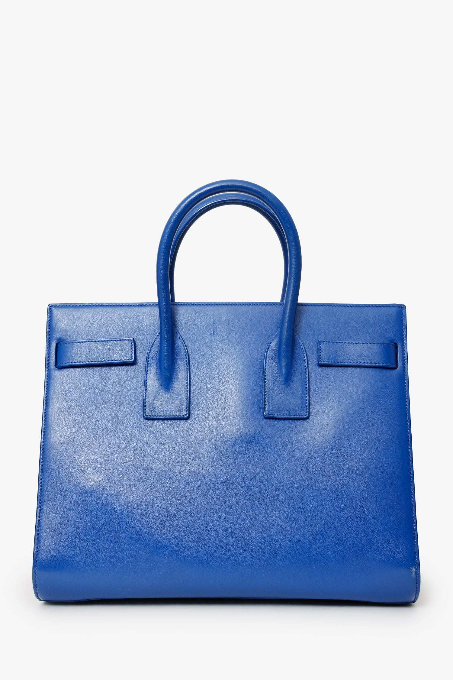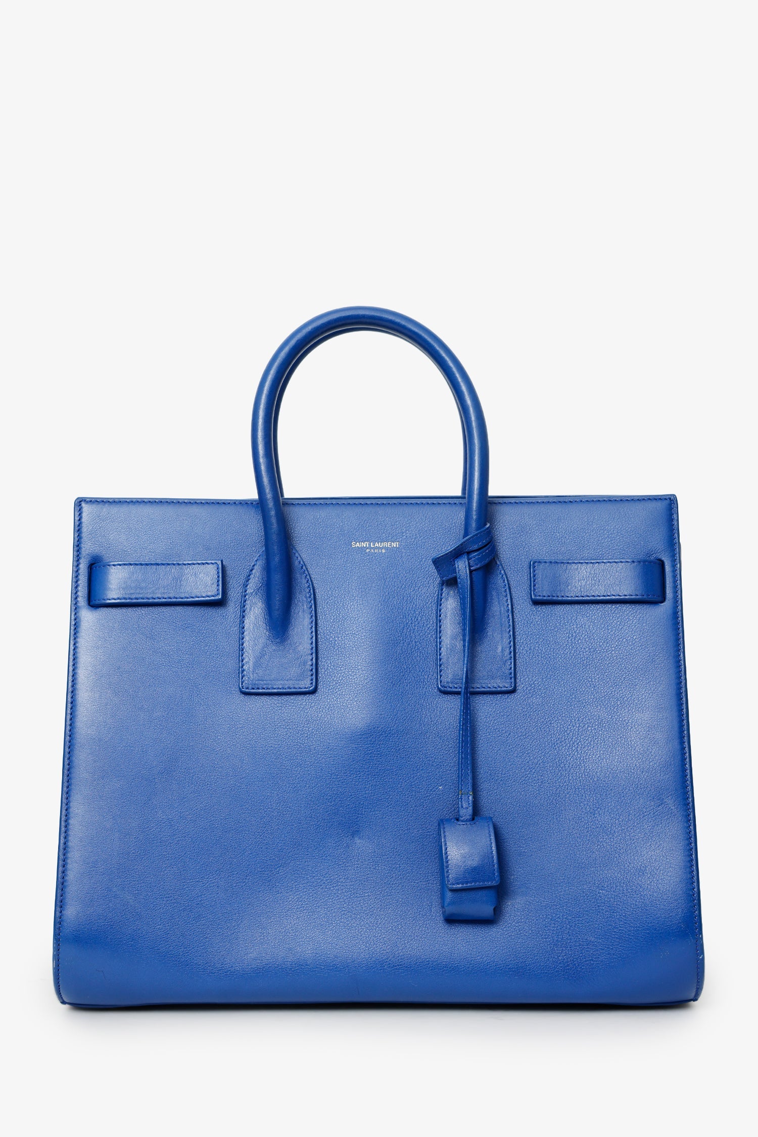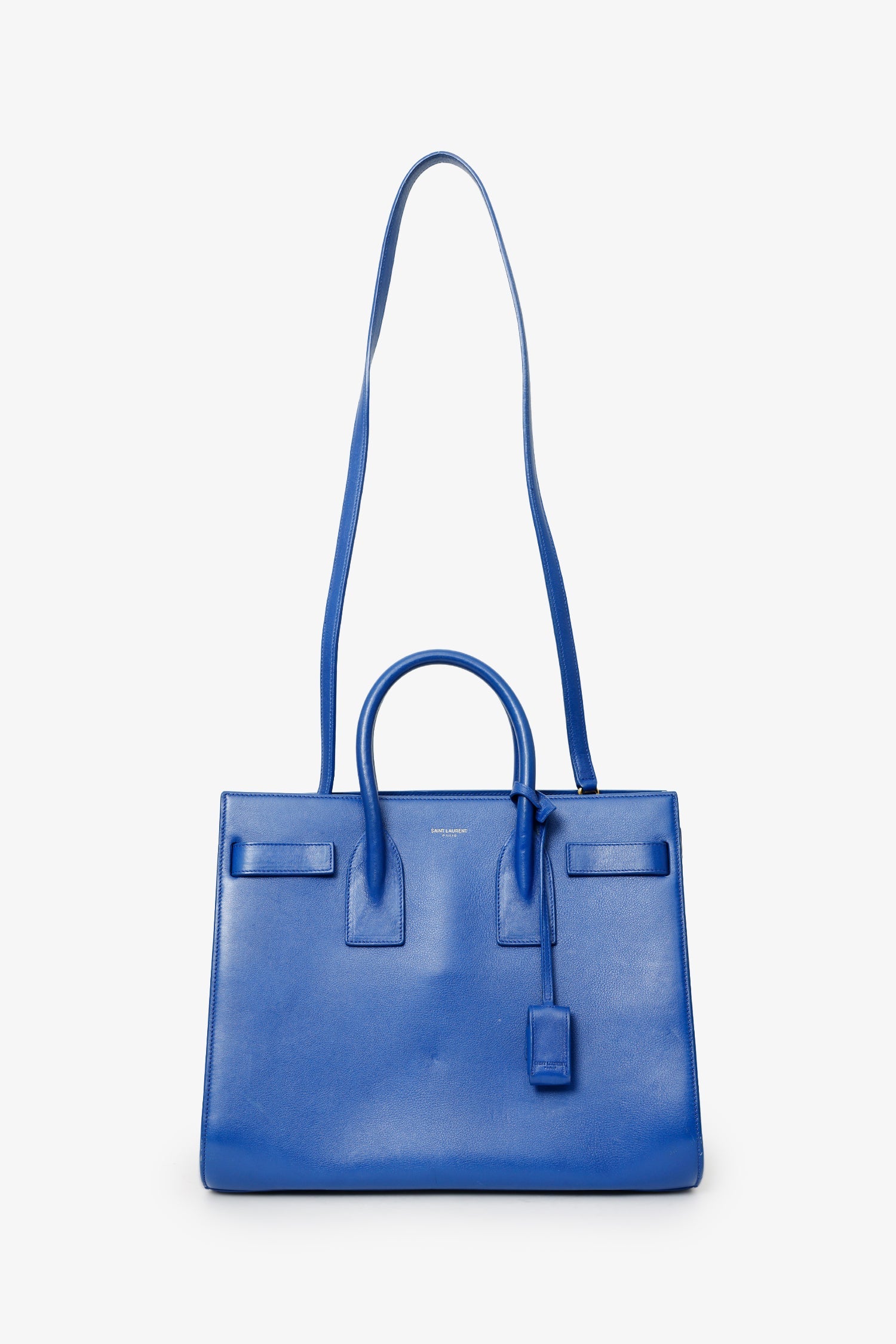 Saint Laurent Blue Leather Small Sac De Jour with Strap. Open top. Twin top handles. Removable crossbody strap with clasp closure. 4 straps with button-up closure (2 front and 2 rear). Protective base studs. Lined interior. 3 interior compartments; front compartment with 2 slip pockets. Middle compartment is 1 large pocket with zip closure. Back compartment with 1 rear wall pocket with zip closure. Gold-tone hardware. Tonal stitching. Includes removable clochette and padlock.