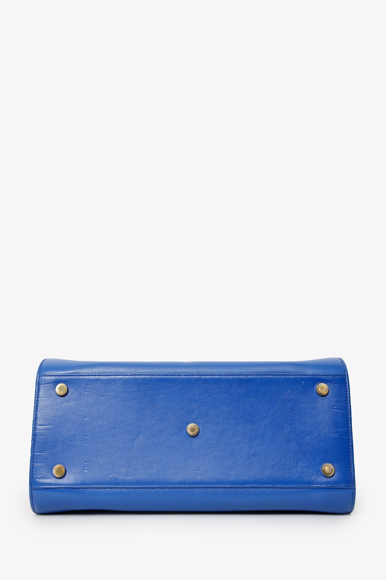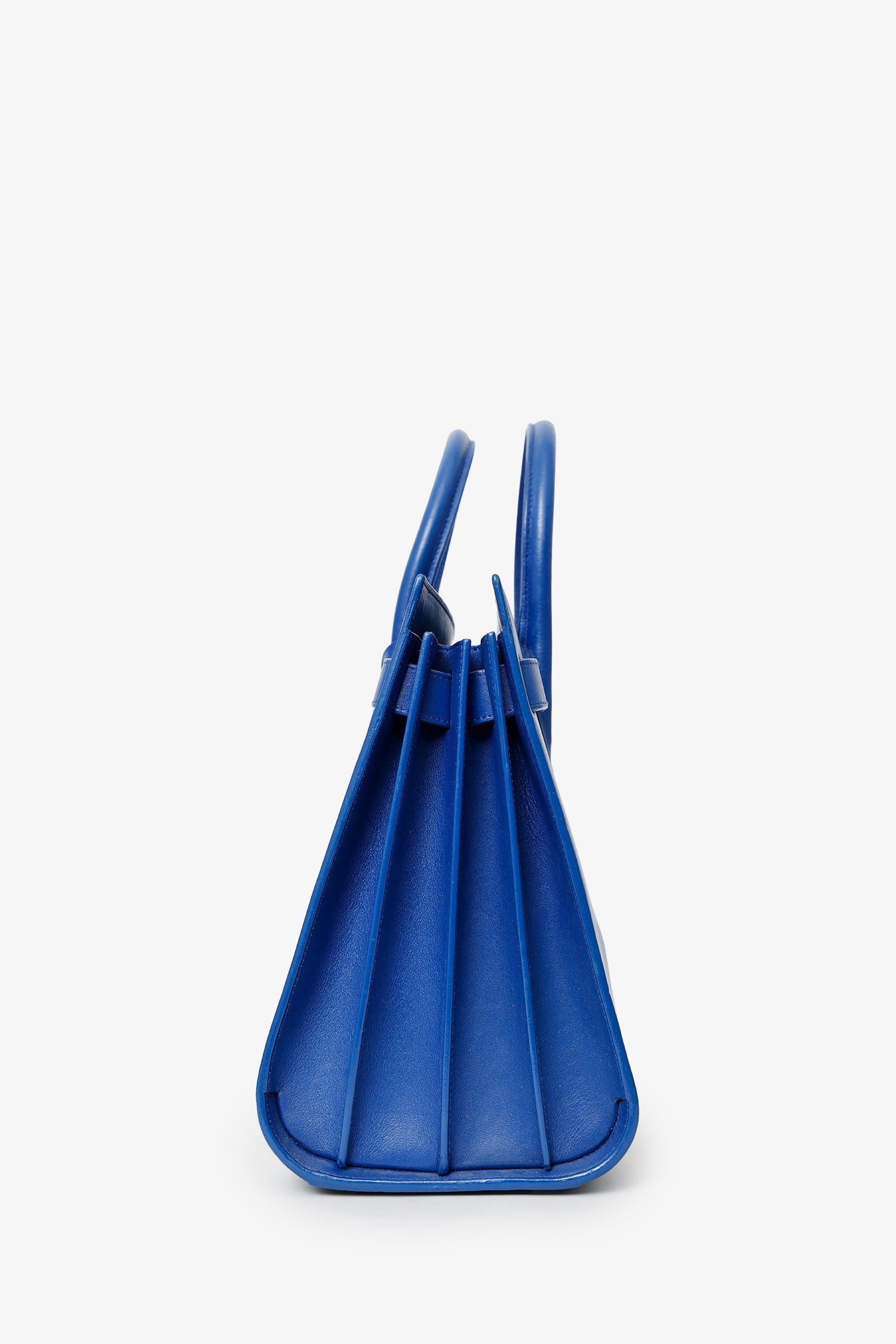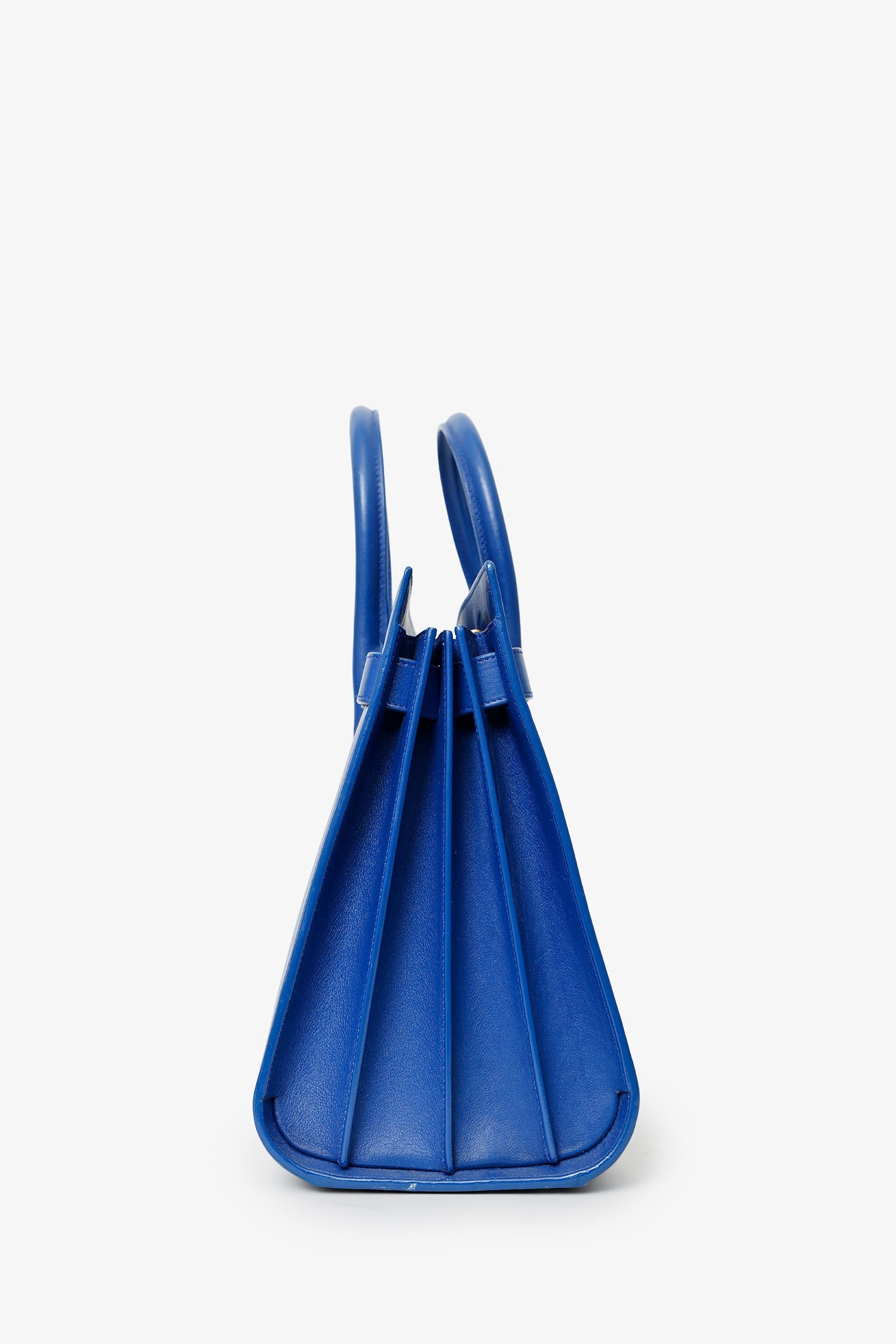 Saint Laurent Blue Leather Small Sac De Jour with Strap. Open top. Twin top handles. Removable crossbody strap with clasp closure. 4 straps with button-up closure (2 front and 2 rear). Protective base studs. Lined interior. 3 interior compartments; front compartment with 2 slip pockets. Middle compartment is 1 large pocket with zip closure. Back compartment with 1 rear wall pocket with zip closure. Gold-tone hardware. Tonal stitching. Includes removable clochette and padlock.