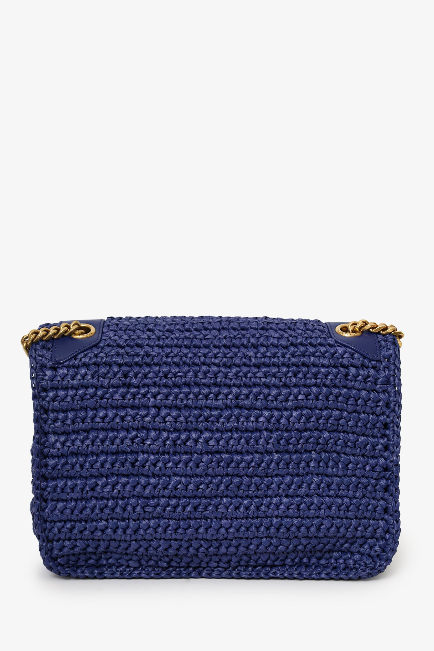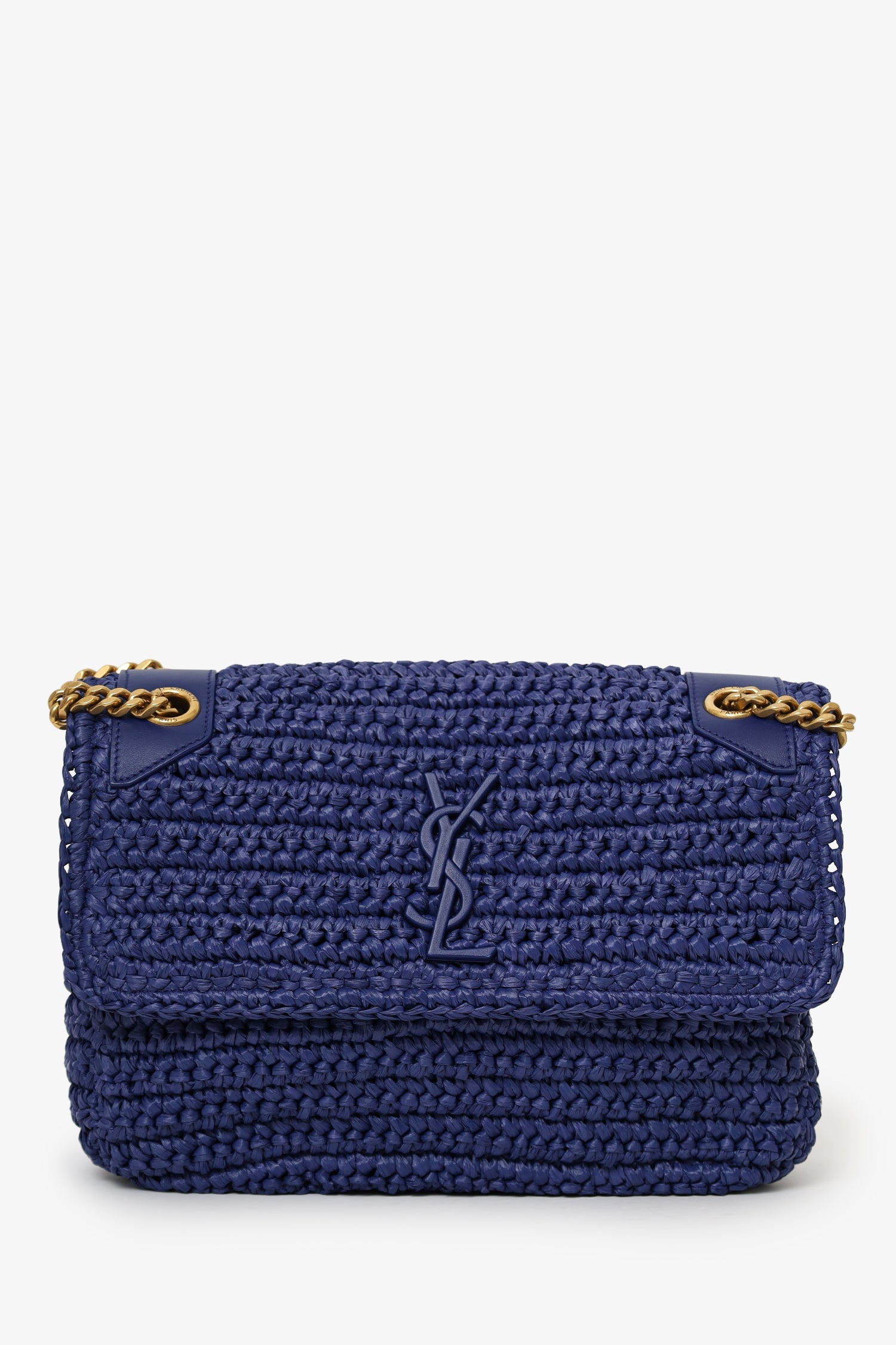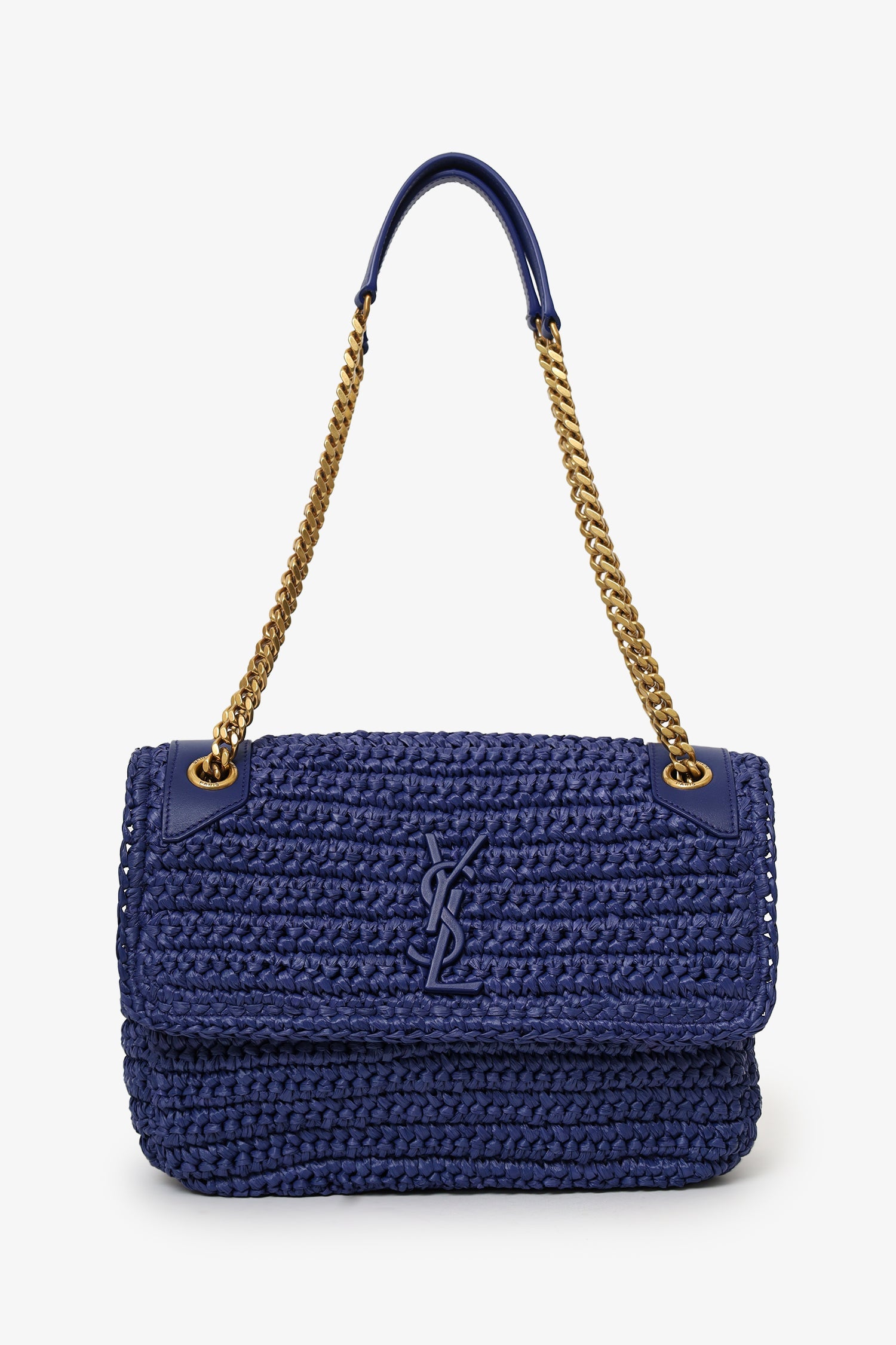 Saint Laurent Blue Raffia 'Niki' Medium Shoulder Bag. Front fold-over flap with magnetic snap-button closure. Twin chainlink strap that can be pulled into one longer strap. Leather-lined interior. 2 interior pockets; 1 slip and 1 zip. Gold-tone hardware. Tonal stitching.