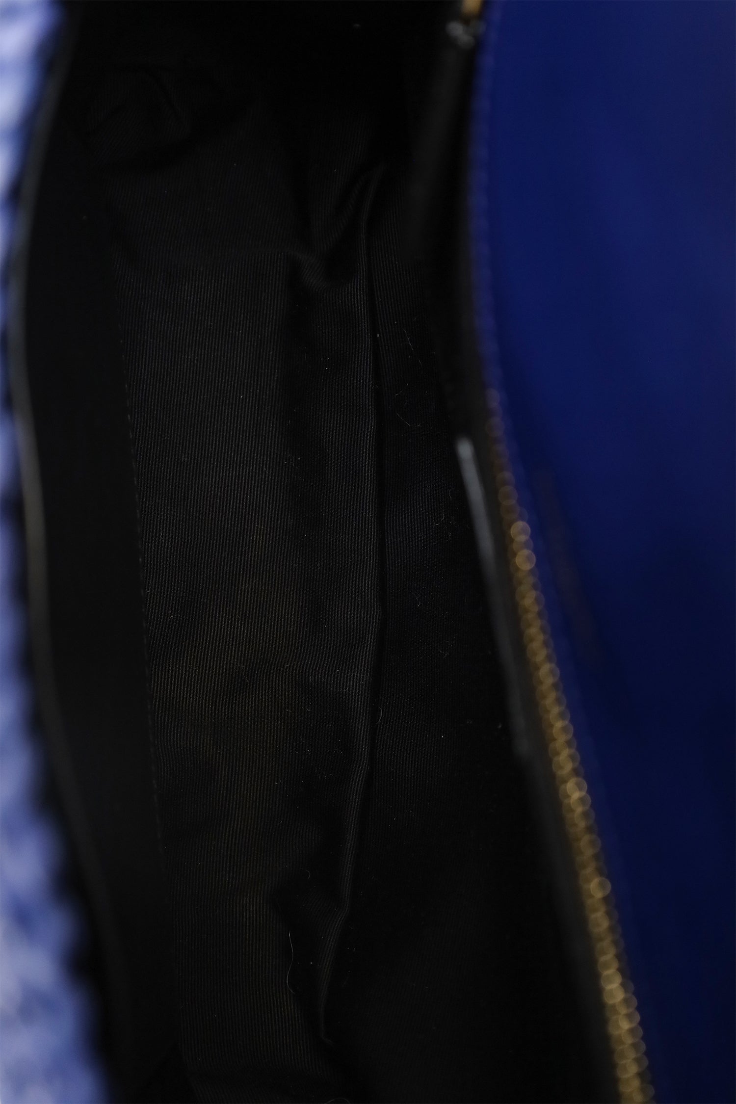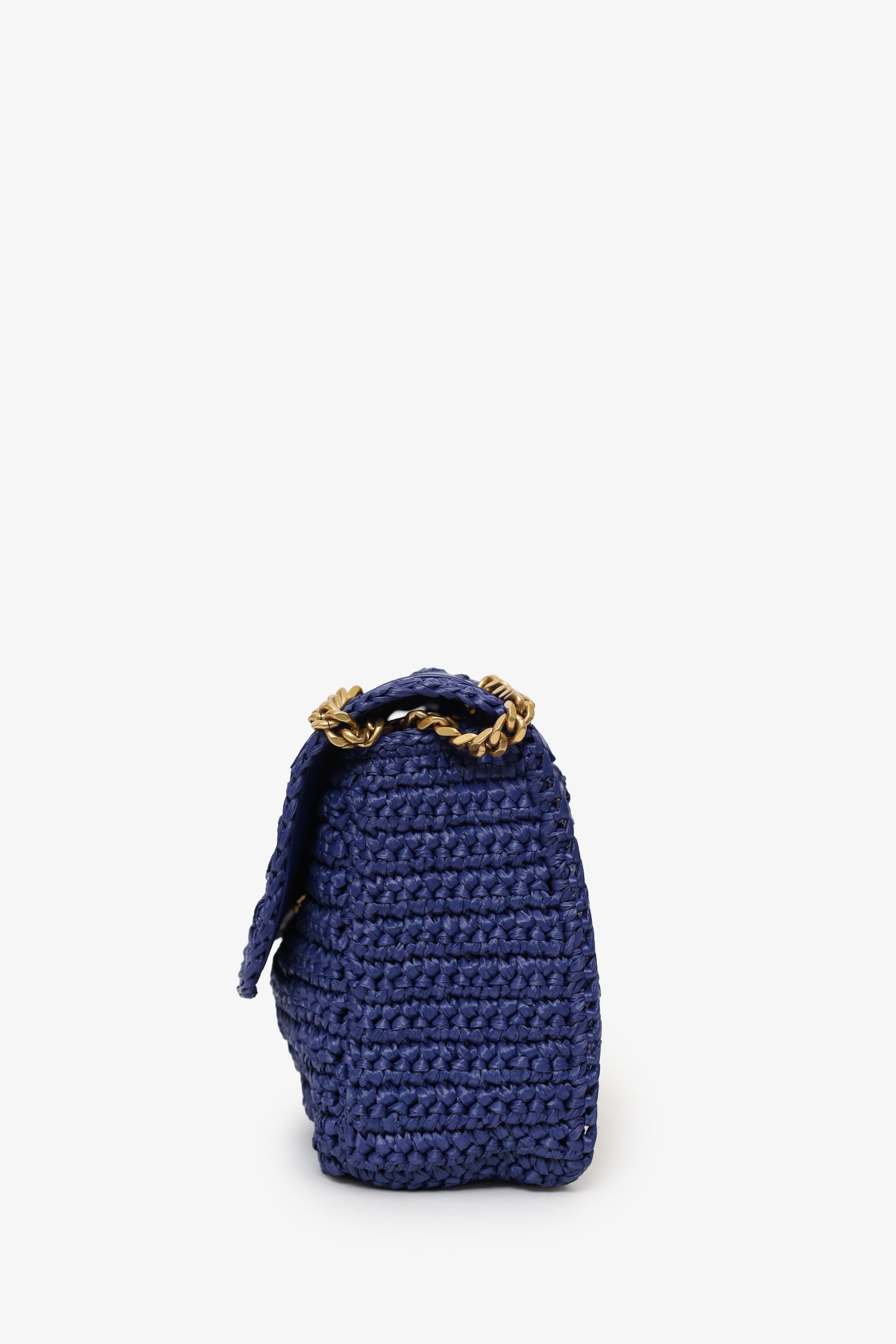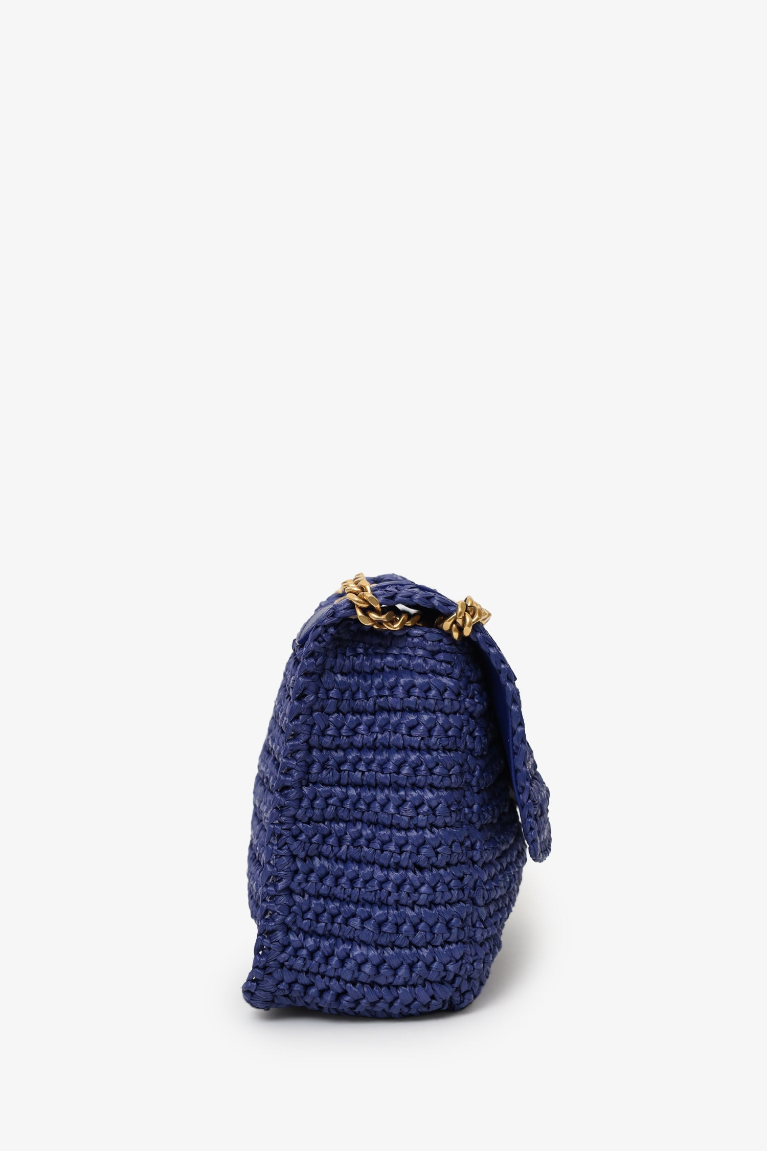 Saint Laurent Blue Raffia 'Niki' Medium Shoulder Bag. Front fold-over flap with magnetic snap-button closure. Twin chainlink strap that can be pulled into one longer strap. Leather-lined interior. 2 interior pockets; 1 slip and 1 zip. Gold-tone hardware. Tonal stitching.