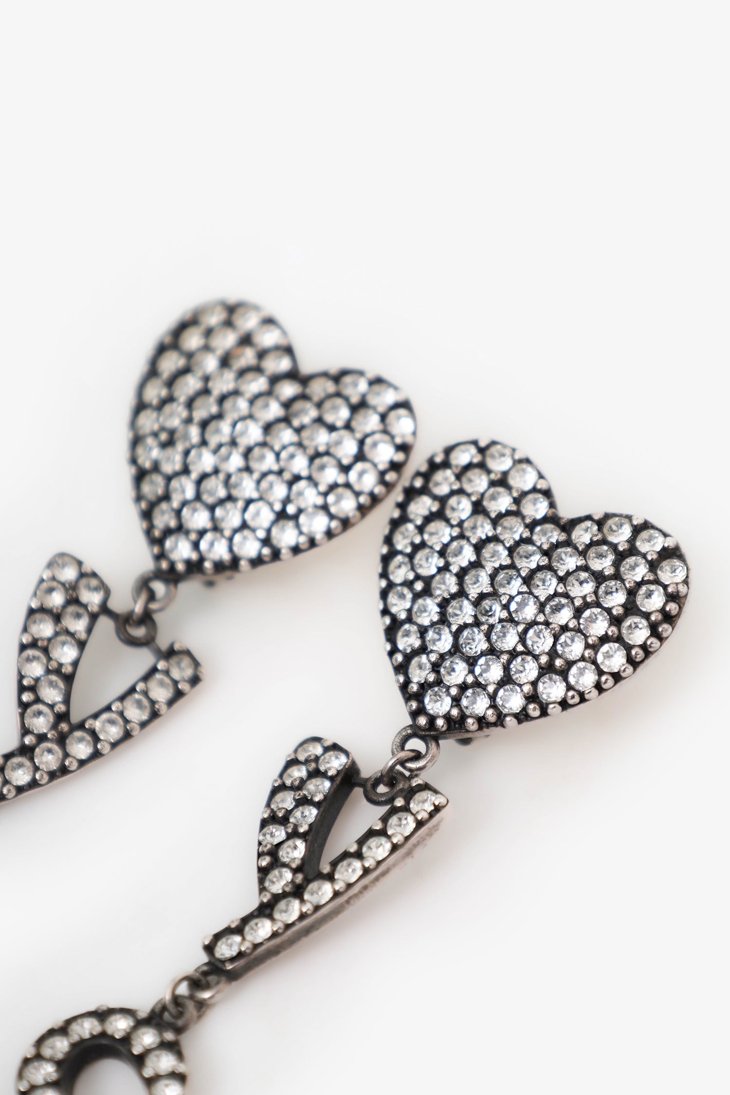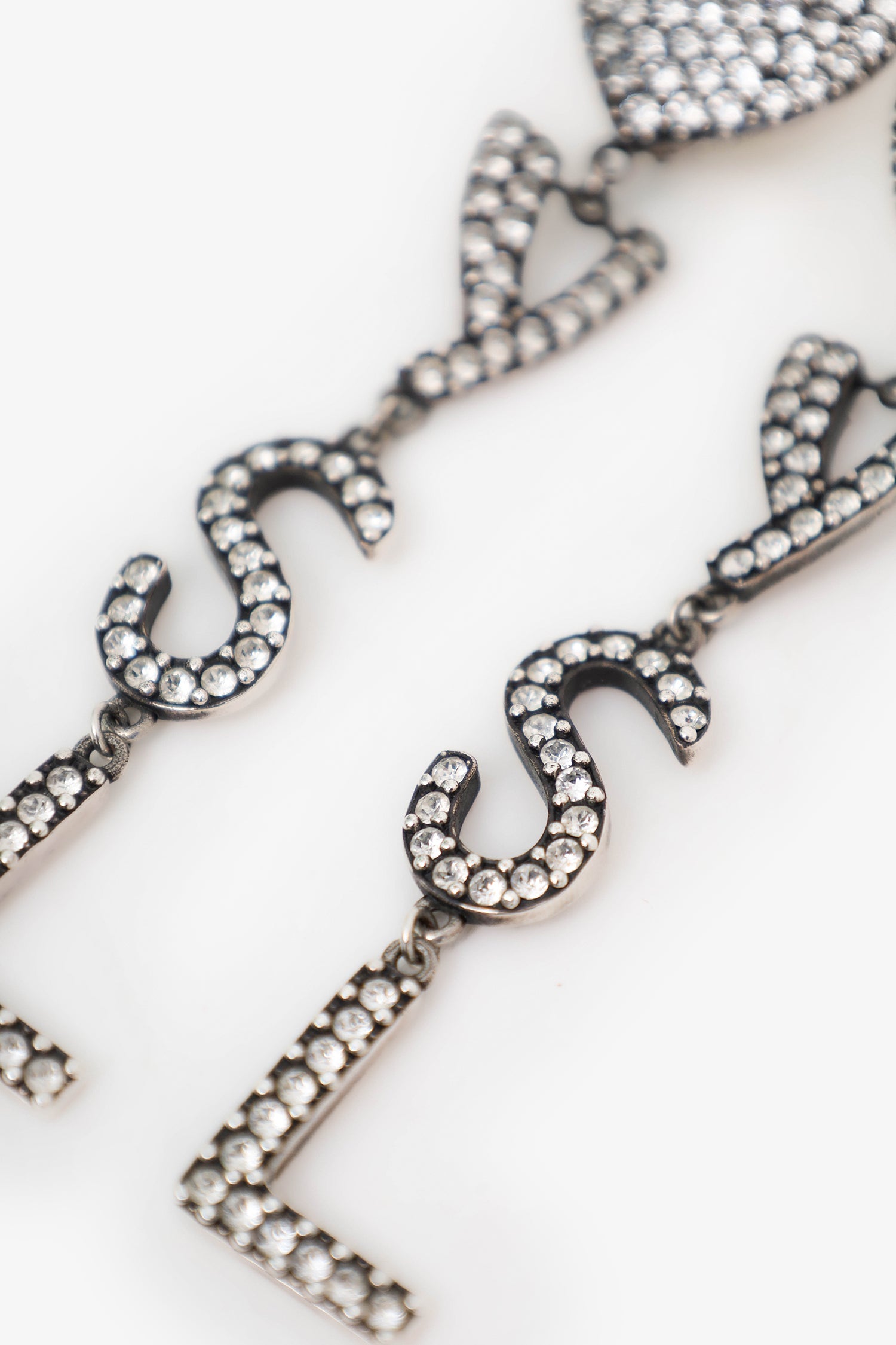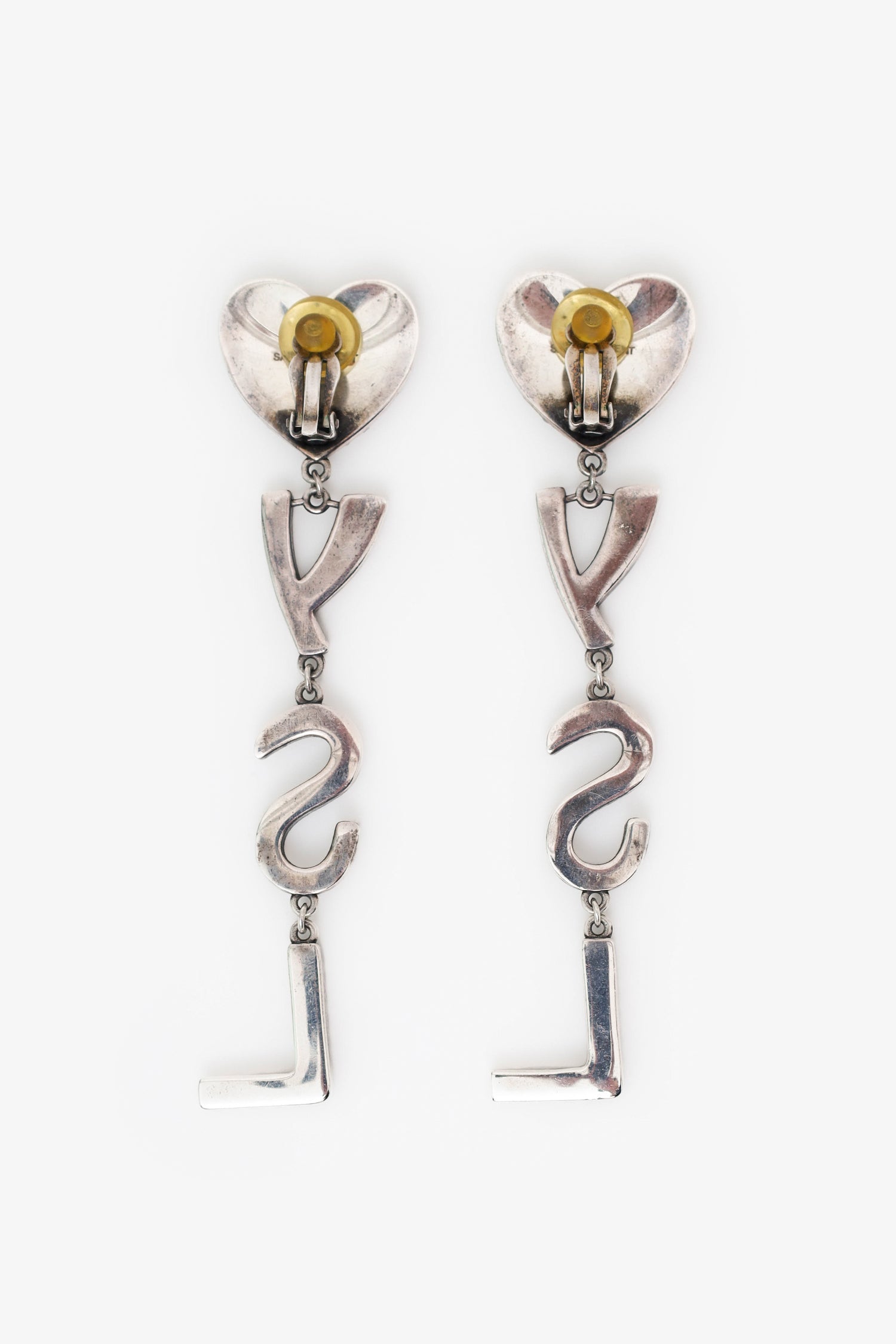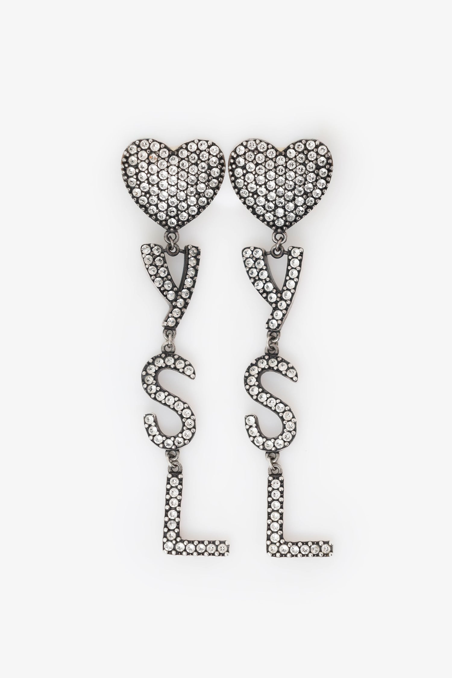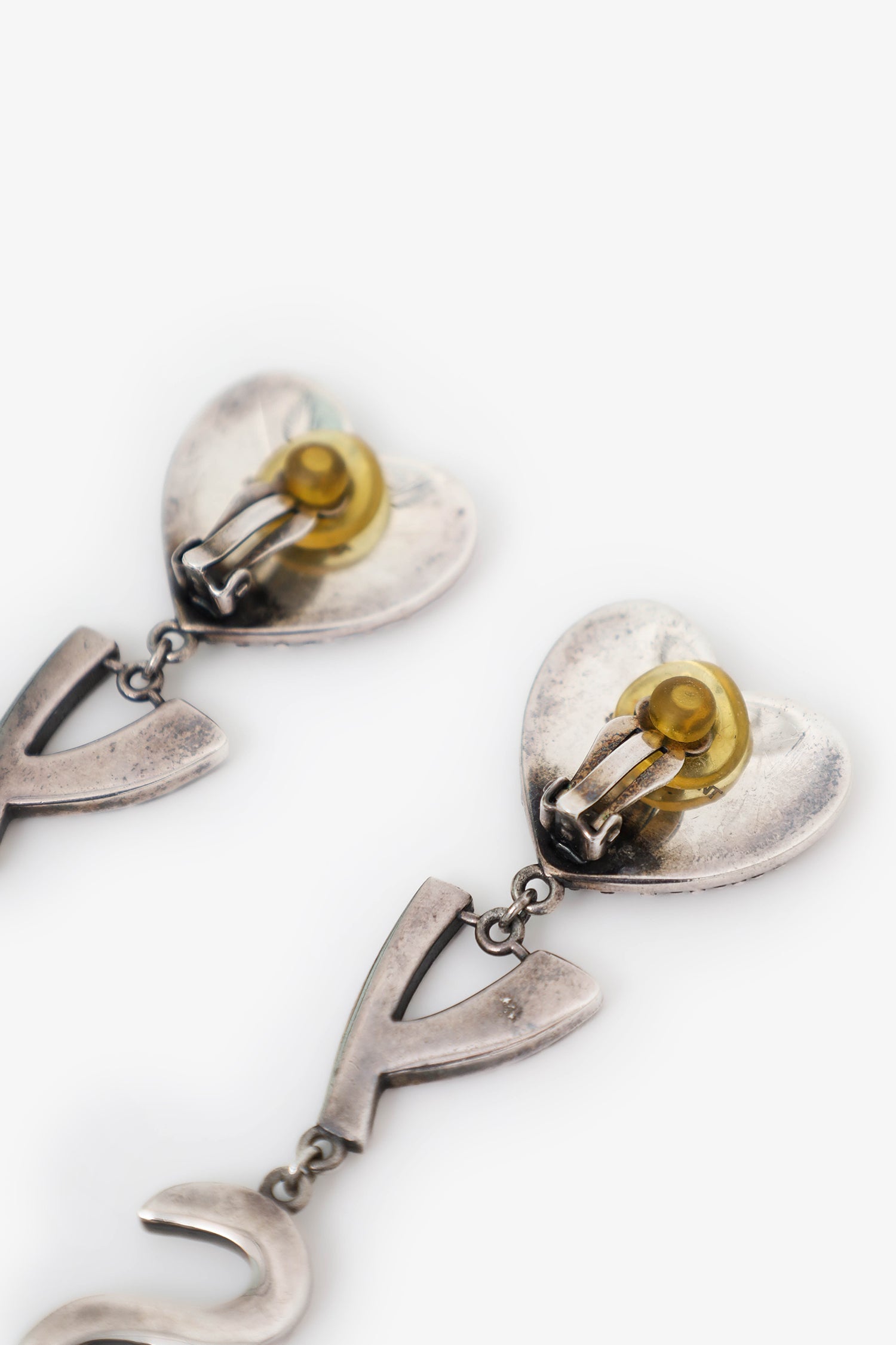 Saint Laurent Crystal Heart YSL Clip-On Earrings. Rear clip-on. Silver-tone hardware.