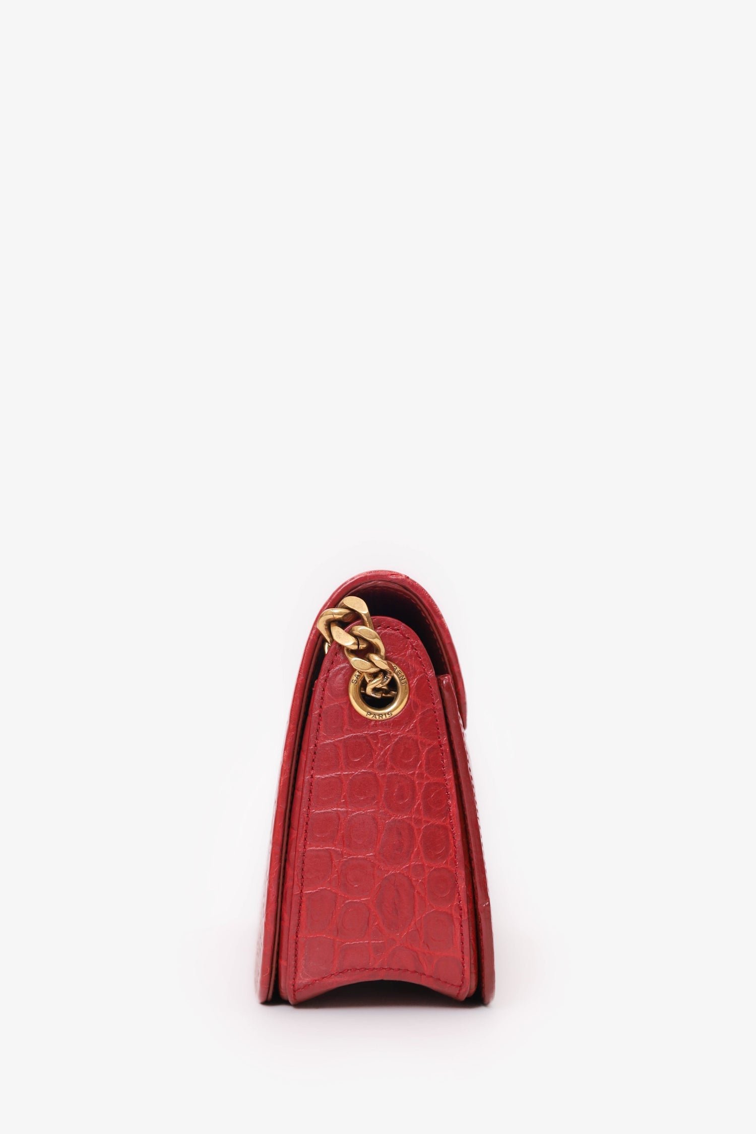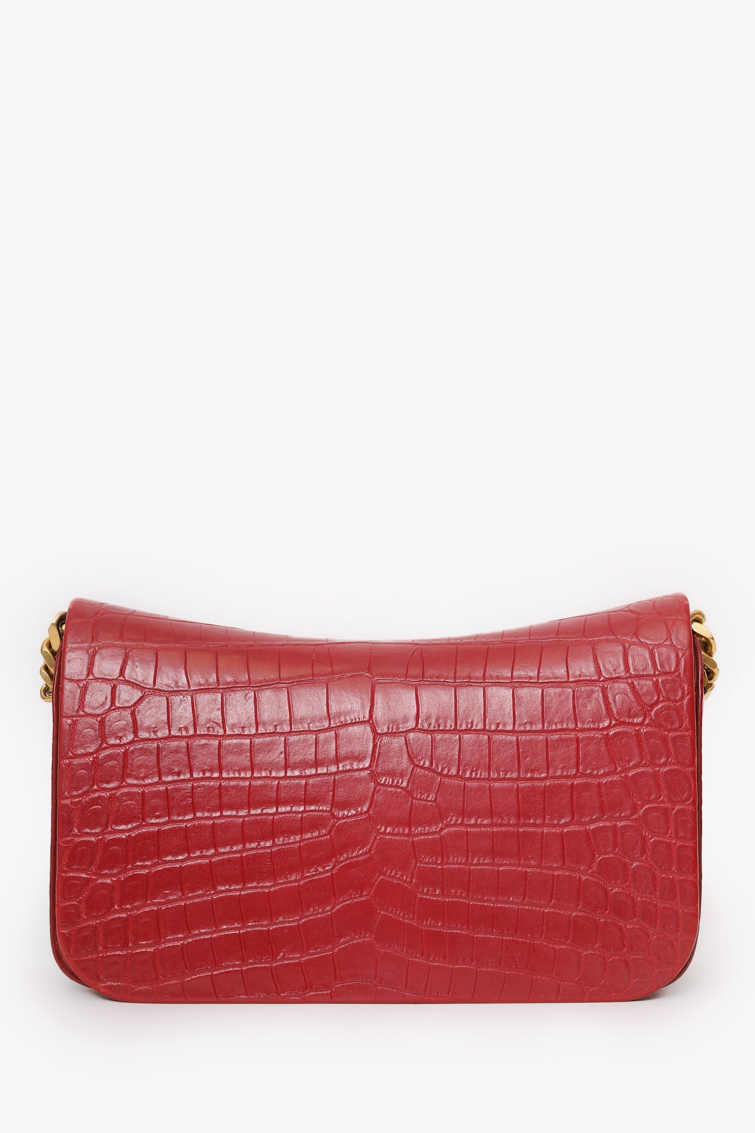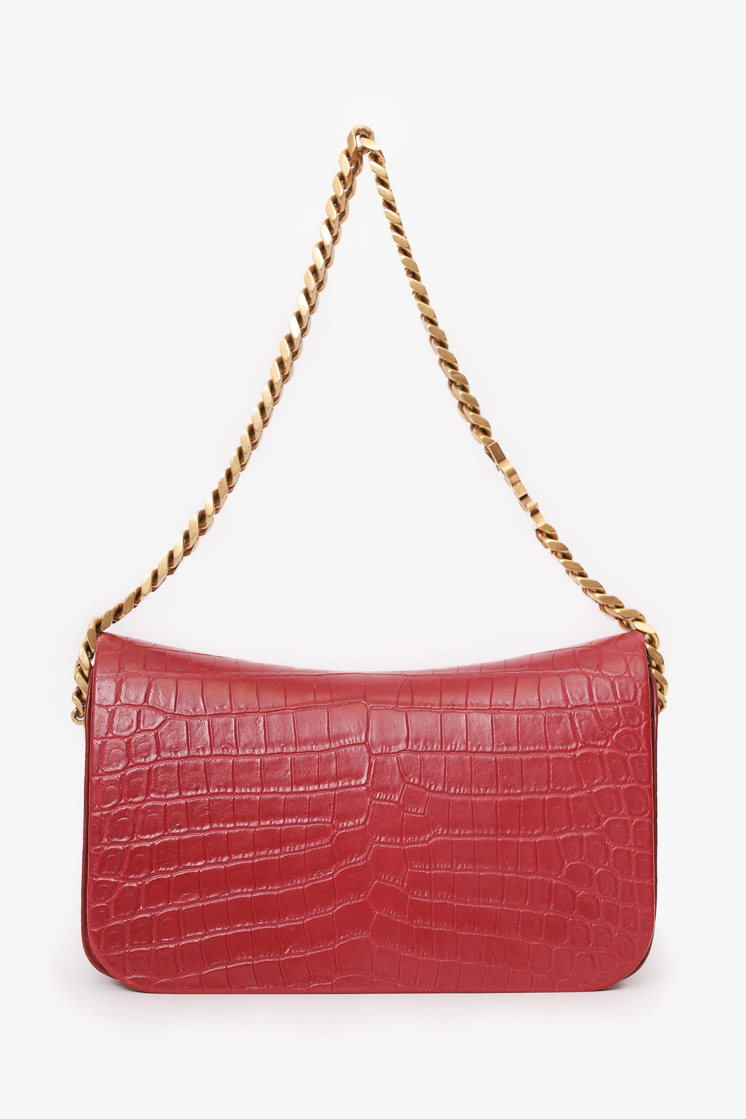 Saint Laurent Red Embossed Elise Shoulder Bag. Front-fold-over-flap with snap-button-up closure. Removable chain link shoulder strap. Lined interior with 1 large open pocket, and 1 slip pocket. Gold-tone hardware. Tonal stitching.